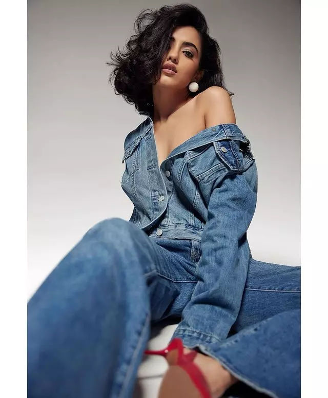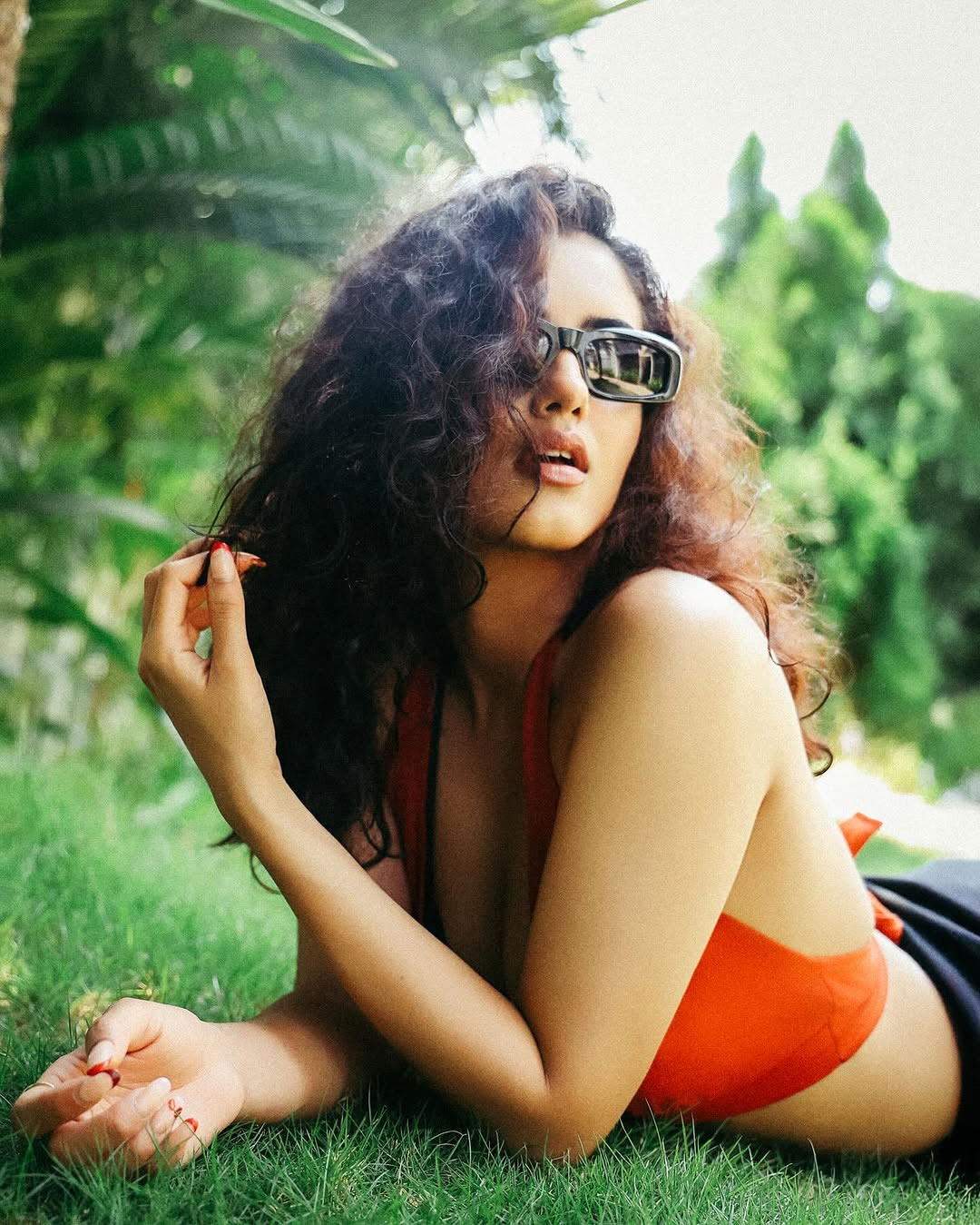 In a bold and confident new photoshoot set against lush green foliage, Malvika Sharma dazzles in a vibrant orange halter-neck bikini with black trim. Wearing trendy Balenciaga sunglasses, which she playfully adjusts with manicured red nails, the actress delivers a sultry yet poised gaze. Her curly hair and glowing skin perfectly capture her glamorous, sun-kissed vibe in this tropical-inspired frame.