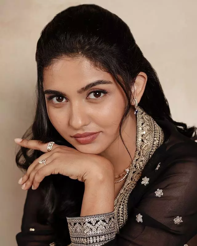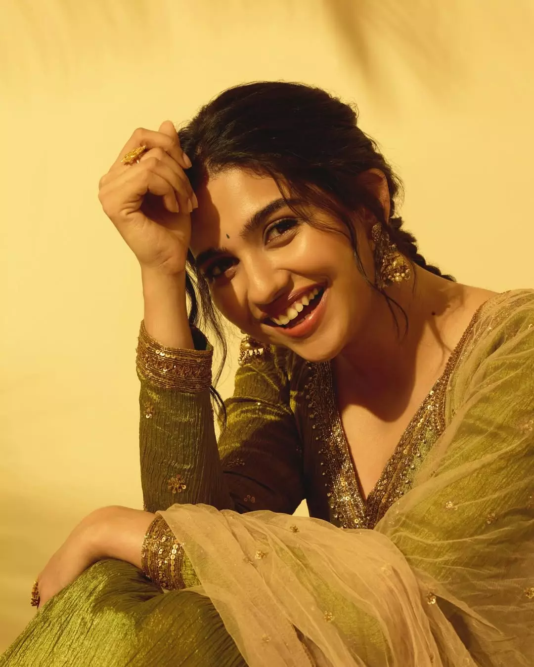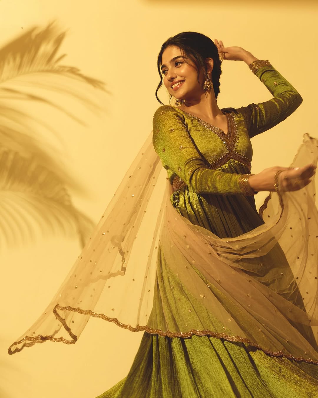 Mamitha Baiju stuns in this elegant photoshoot, radiating grace and charm in a shimmering green ethnic ensemble.