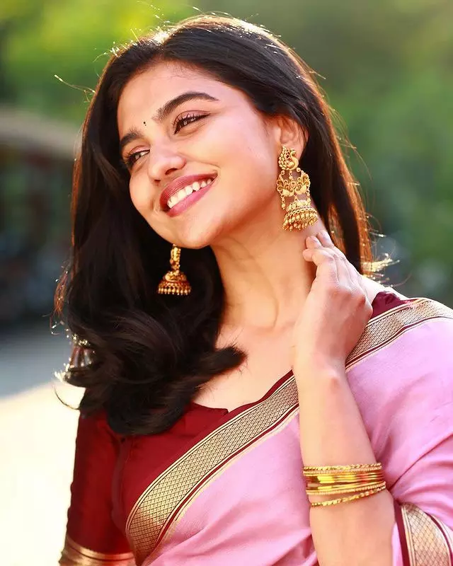 Mamitha Baiju stuns in this elegant photoshoot, radiating grace and charm in a shimmering green ethnic ensemble. The image, captioned "Santhithome kanaakalil..", showcases her poised expression and traditional beauty.
