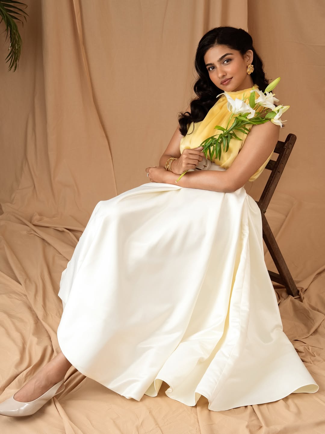 Mamitha Baiju is a rising star in the South Indian film industry. She recently shared a Instagram post that has captivated her fans. The image shows her in a yellow top paired with a white skirt, holding a bouquet of white lilies. Her elegant pose, with one hand resting on her face and the other holding the flowers, highlights her natural charm. .