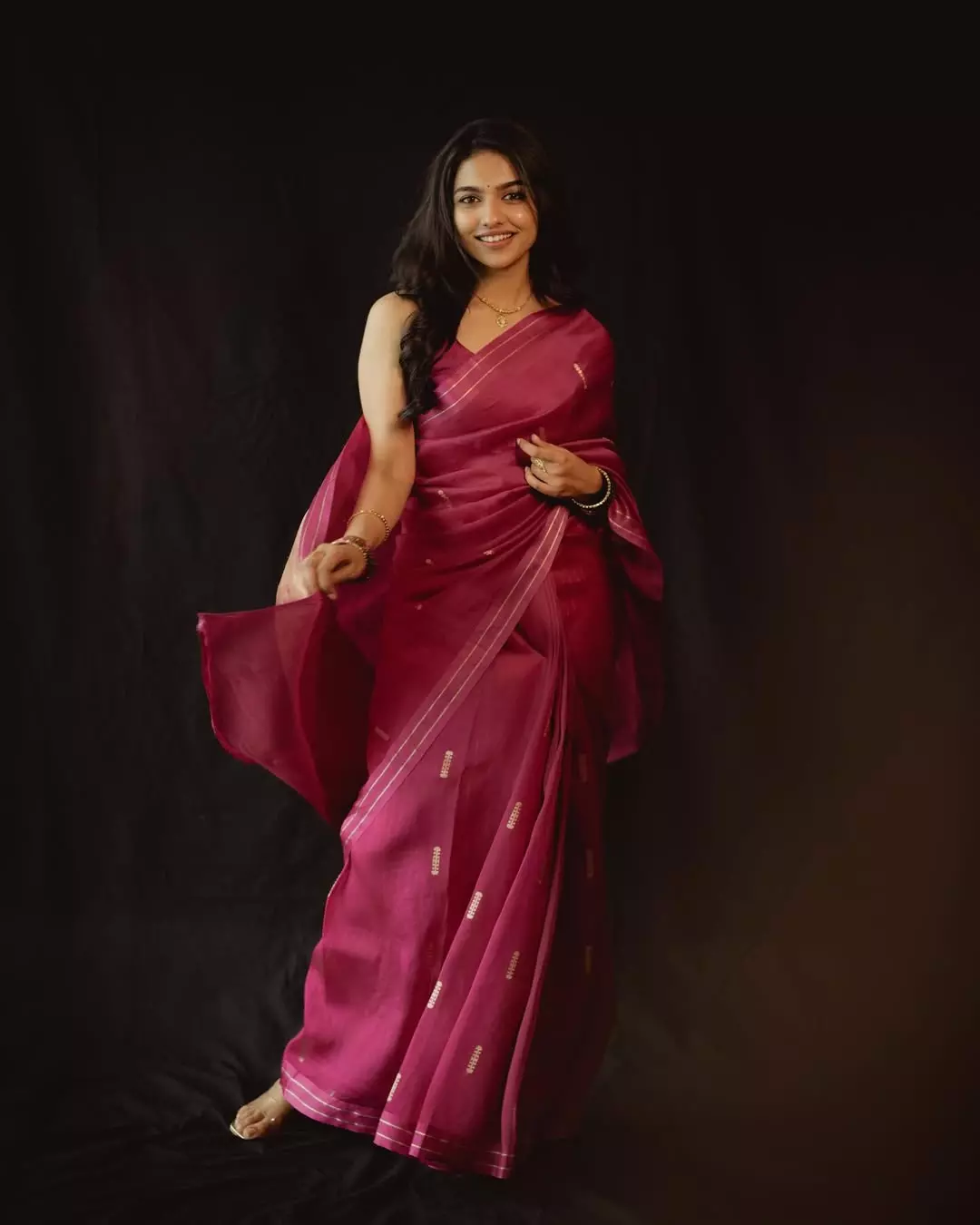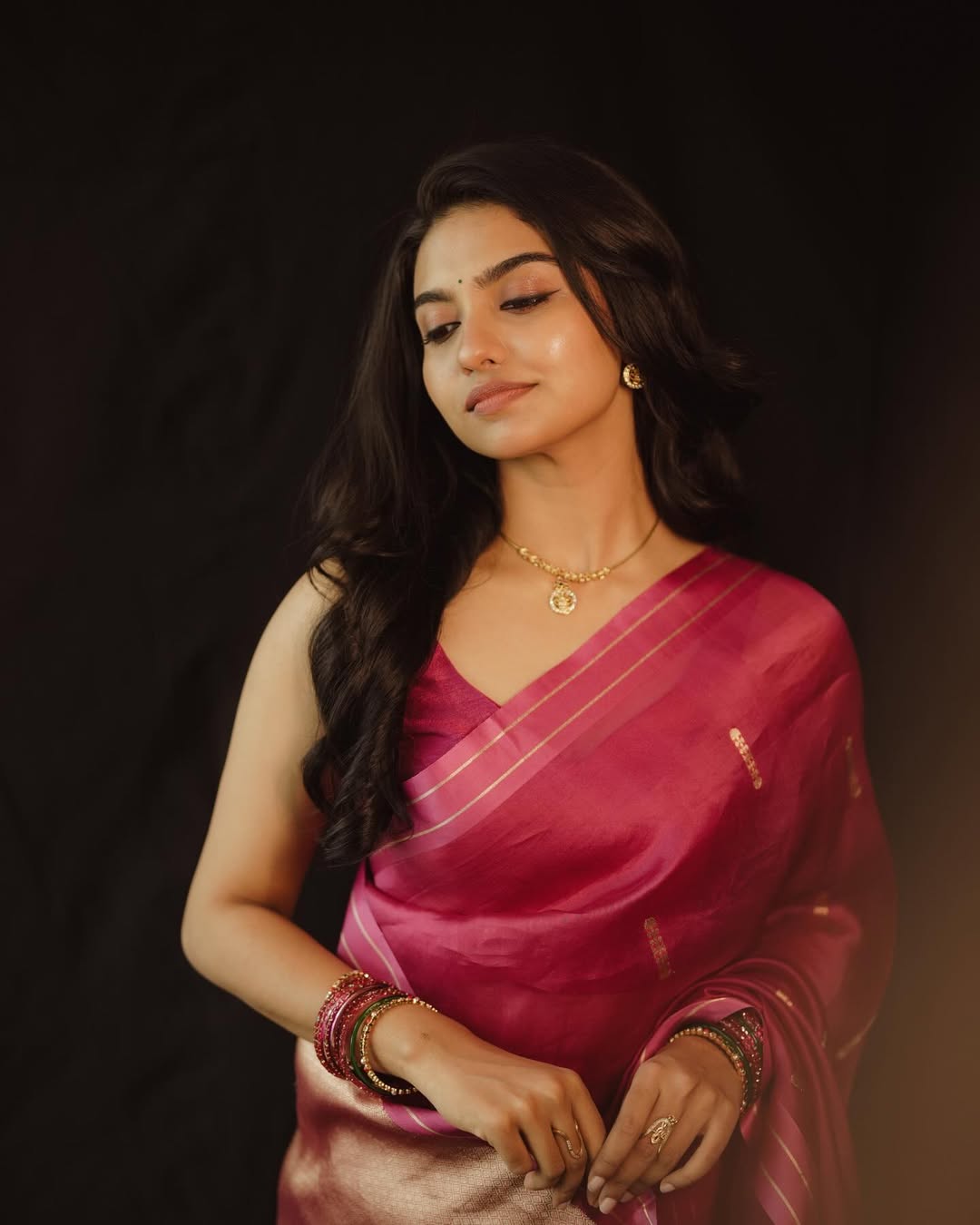 In this enchanting photo, Mamitha looks ethereal wrapped in a vibrant pink saree with golden accents, complemented by traditional jewellery, bangles, and subtle makeup—exuding grace and serenity against a dark backdrop.