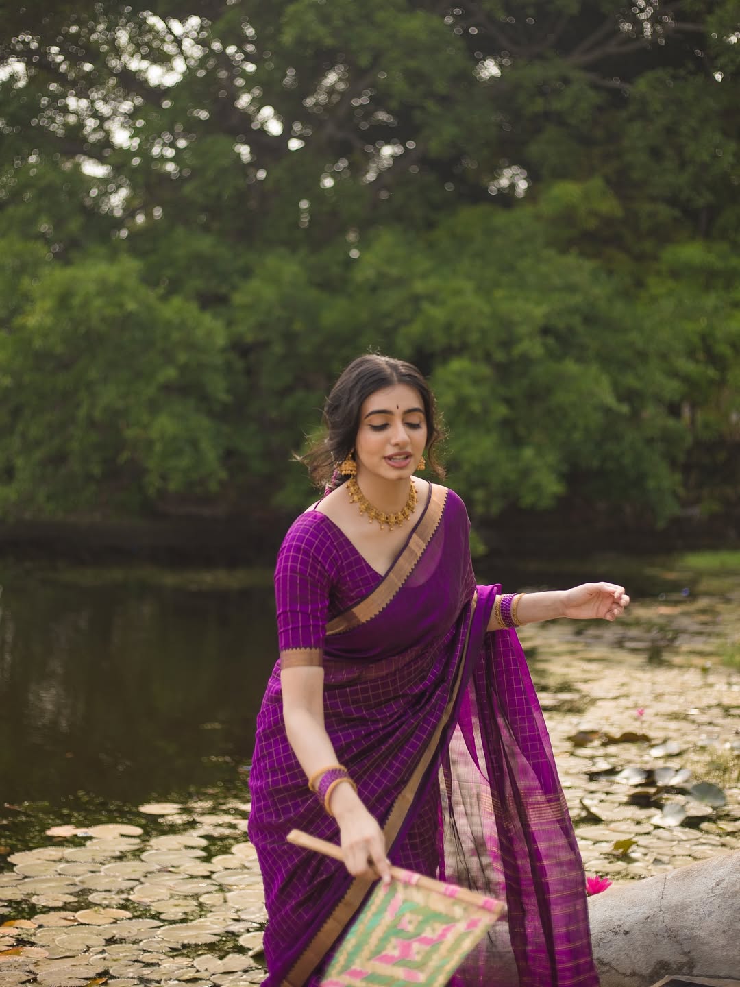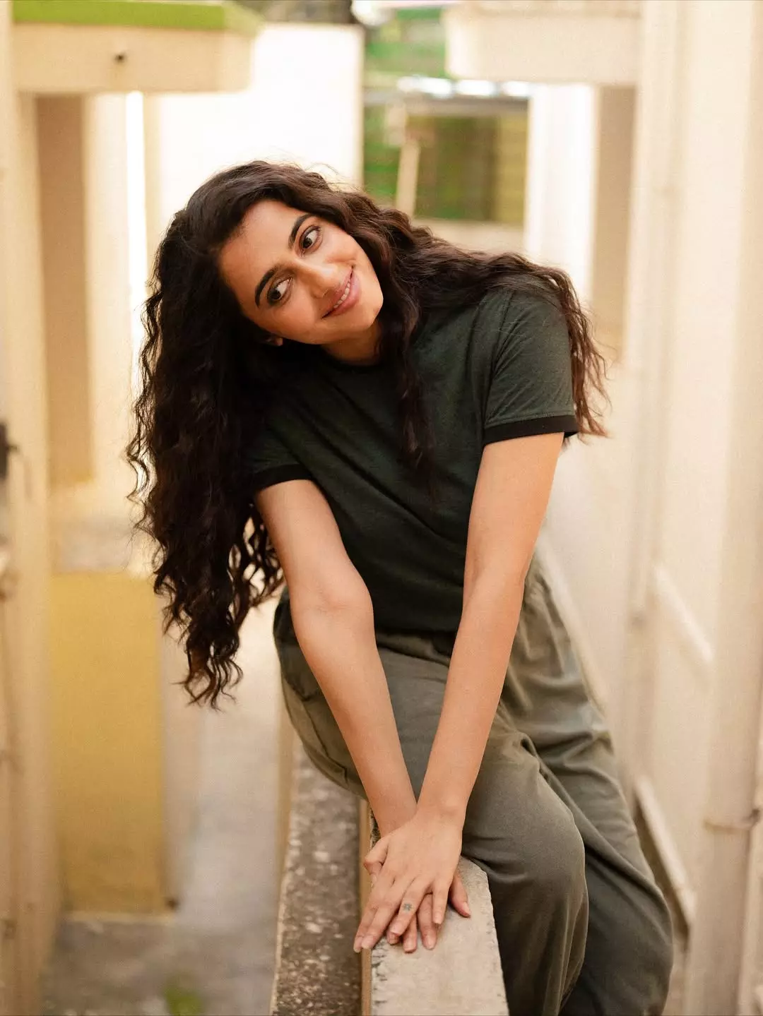 In the picture, she is seen wearing a dark green outfit, styled in a relaxed yet graceful manner.