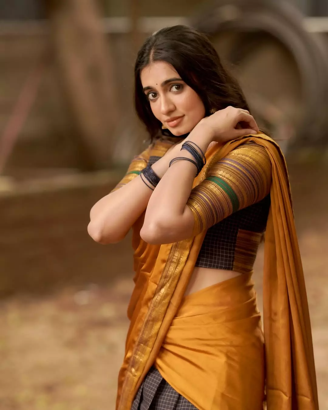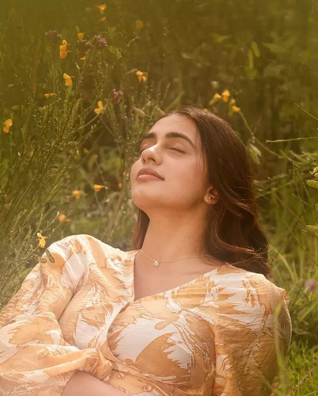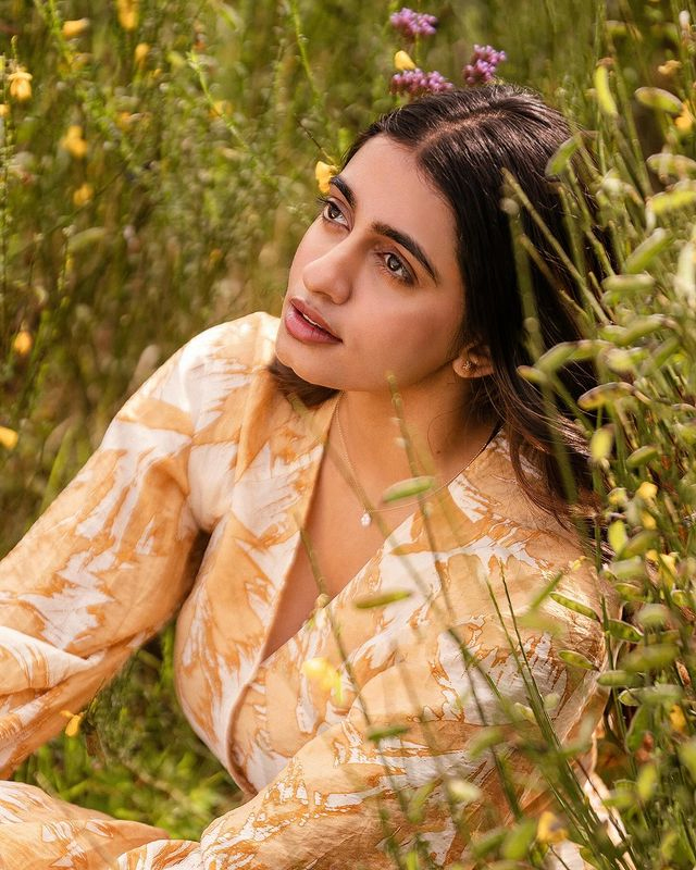Actress Maanasa Choudhary radiates grace and poise in her latest look, draped in a vibrant mustard-yellow saree. The intricate patterns and delicate border work add a touch of elegance, while the subtle blend of traditional craftsmanship with modern styling makes her appearance truly captivating. Paired with a statement necklace and a chic potli bag, her outfit beautifully reflects ethnic sophistication. The floral swing backdrop enhances her aura, making the entire frame look straight out of a classic movie scene.