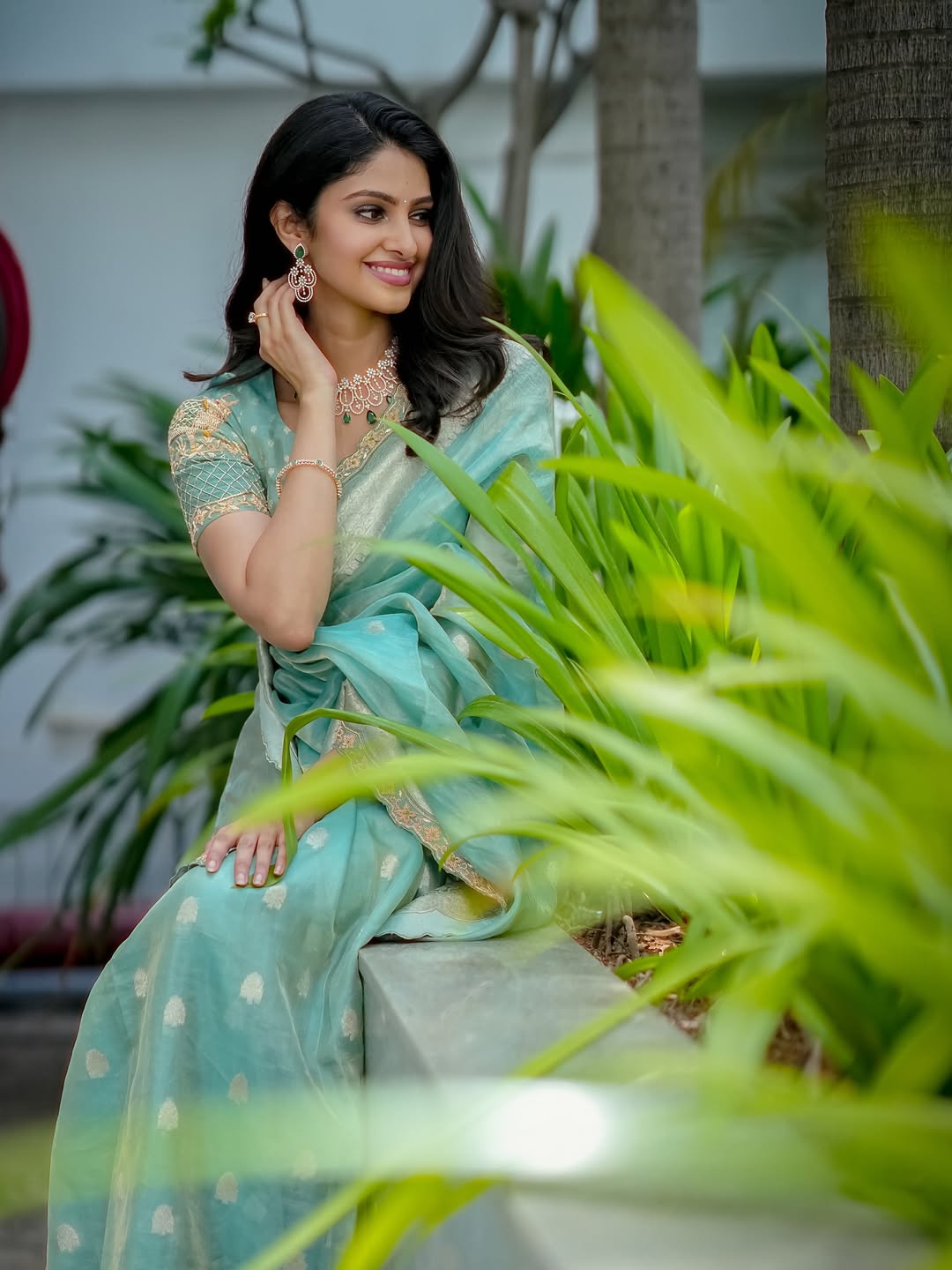 By: Tupaki Gallery Desk | 7 April 2026 7:06 PM ISTManasa Varanasi is once again winning hearts with her latest Instagram post. In the picture, she is seen sitting calmly among green plants, wearing a soft sky blue saree. The look is simple, graceful, and very refreshing. Her smile and natural pose make the photo even more beautiful. The caption of the post says, “Sky blue weaves in Nellore,” showing her love for traditional fashion.