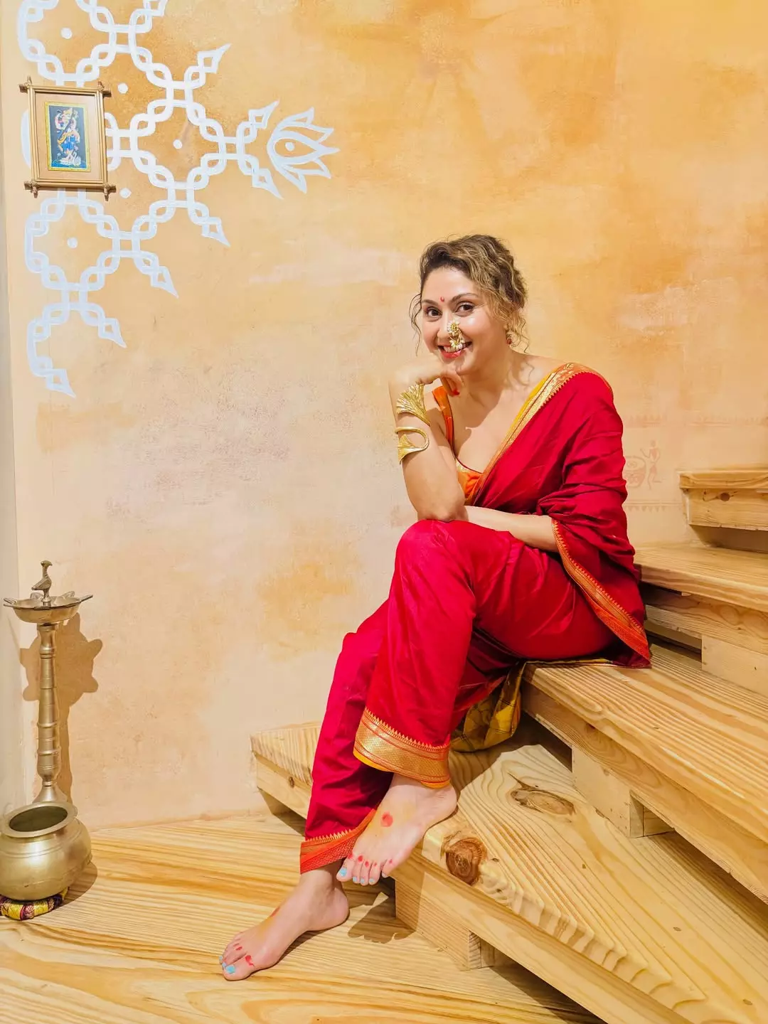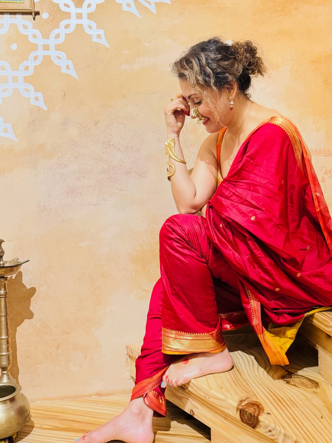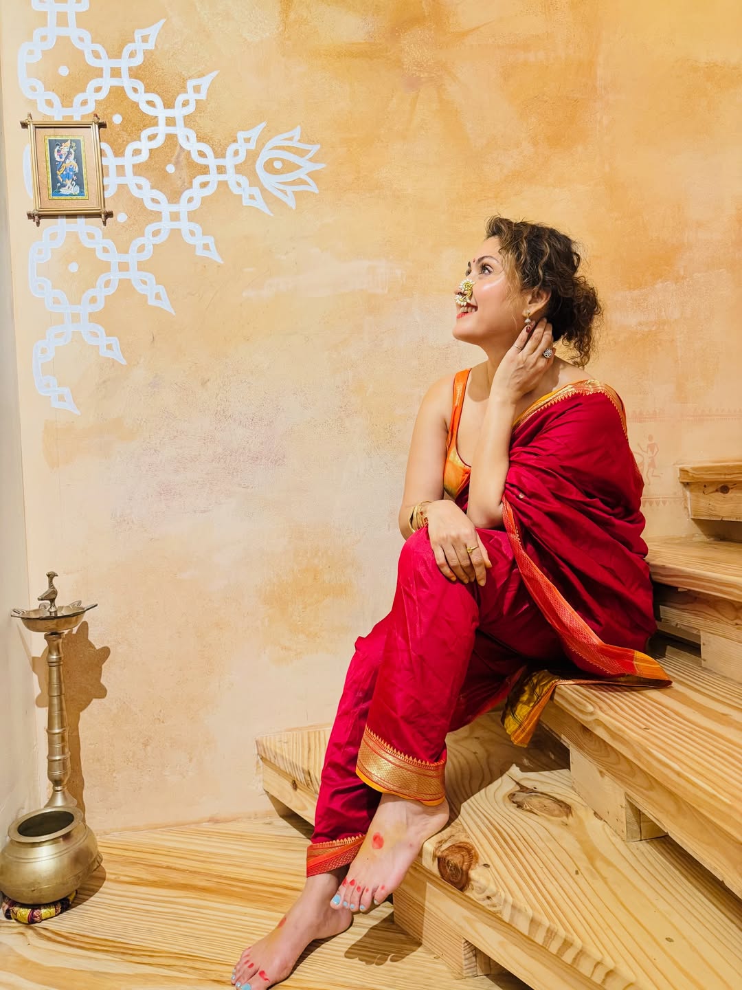 Actress Manjari Fadnis recently shared a beautiful picture on Instagram that caught the attention of her fans. In the photo, she is seen sitting gracefully on wooden stairs, dressed in a traditional red and yellow saree. Her caption reads, “Marathi Mulgi😊”, which means Marathi girl. She completed her look with traditional jewellery including a nose ring and bangles by highlighting her Maharashtrian roots.