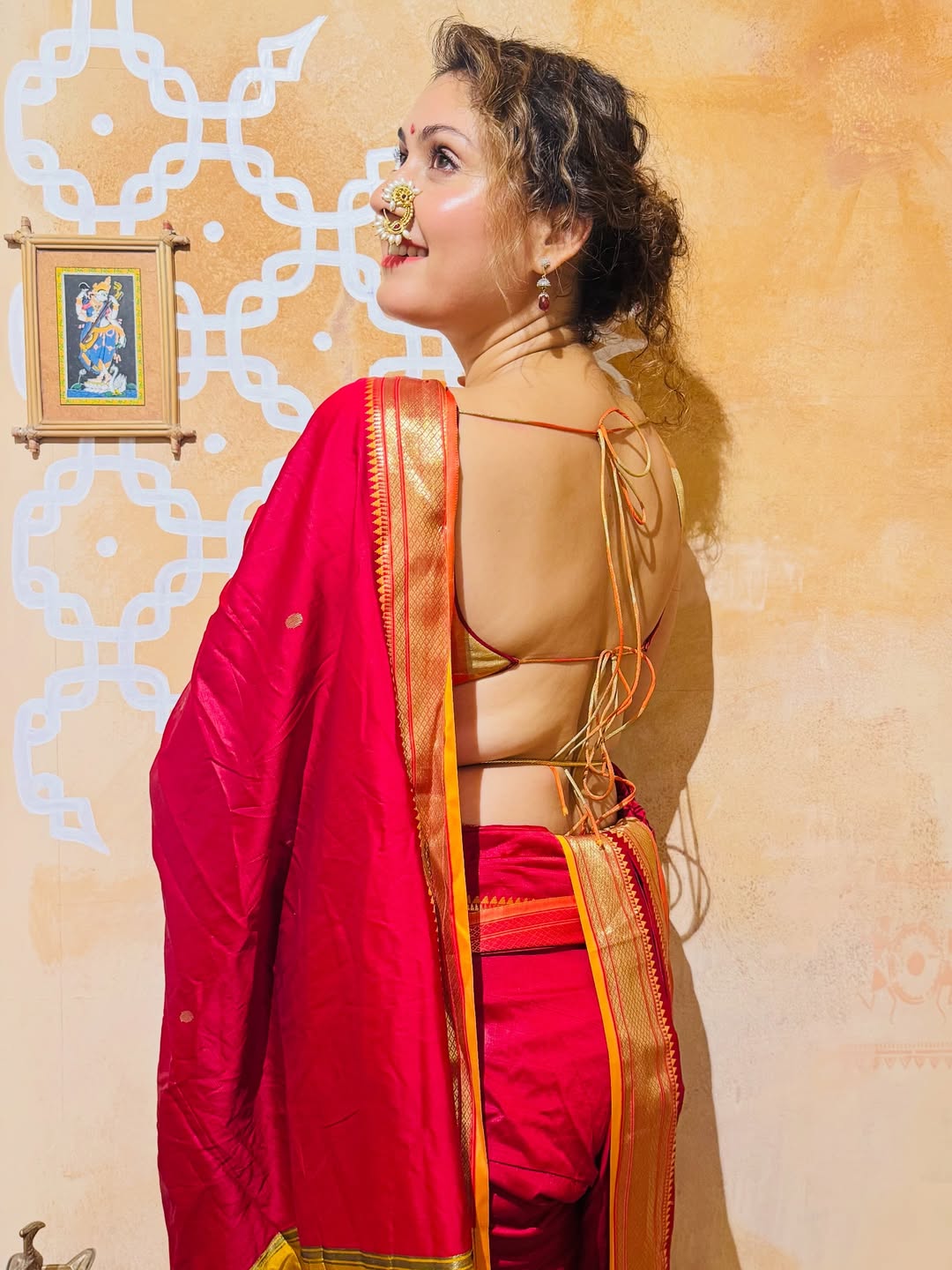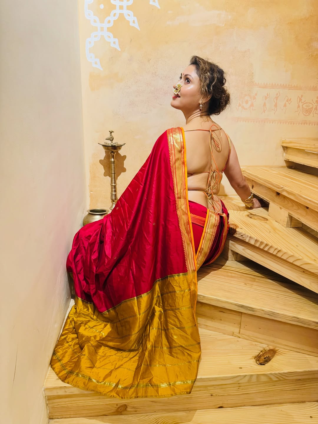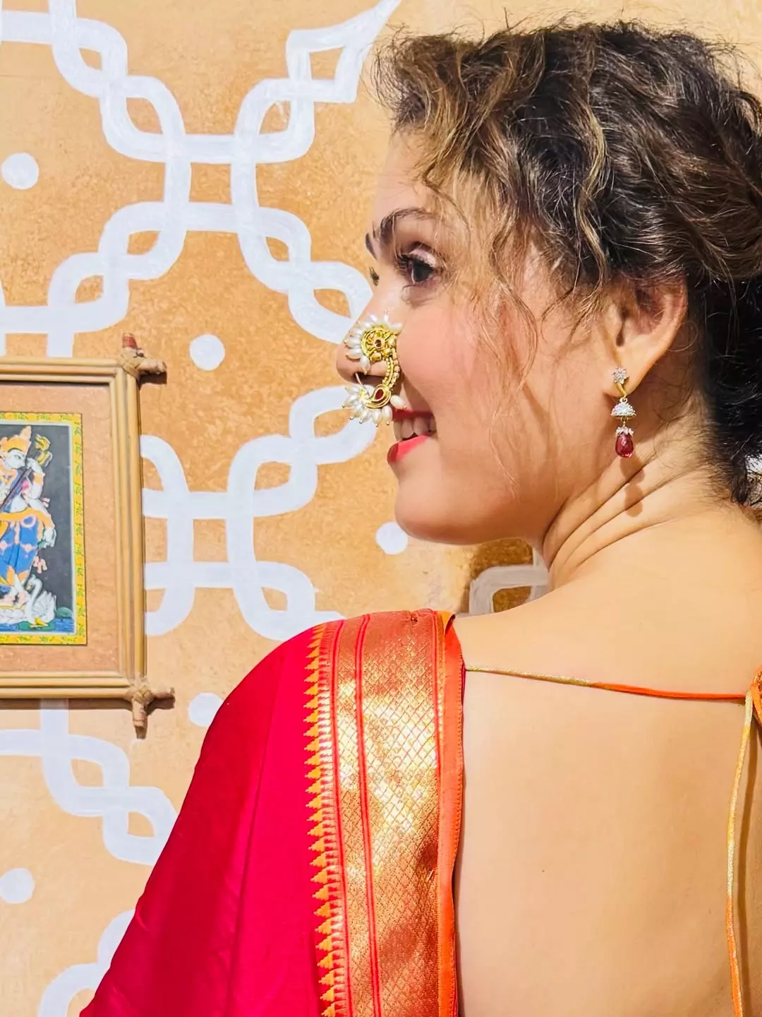 Actress Manjari Fadnis recently shared a beautiful picture on Instagram that caught the attention of her fans. In the photo, she is seen sitting gracefully on wooden stairs, dressed in a traditional red and yellow saree. Her caption reads, “Marathi Mulgi😊”, which means Marathi girl. She completed her look with traditional jewellery including a nose ring and bangles by highlighting her Maharashtrian roots.