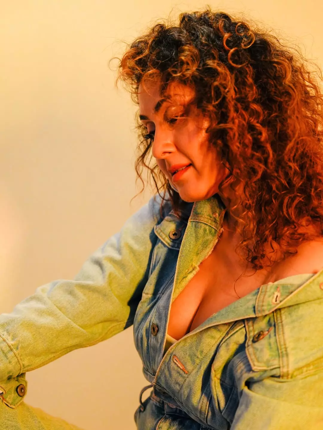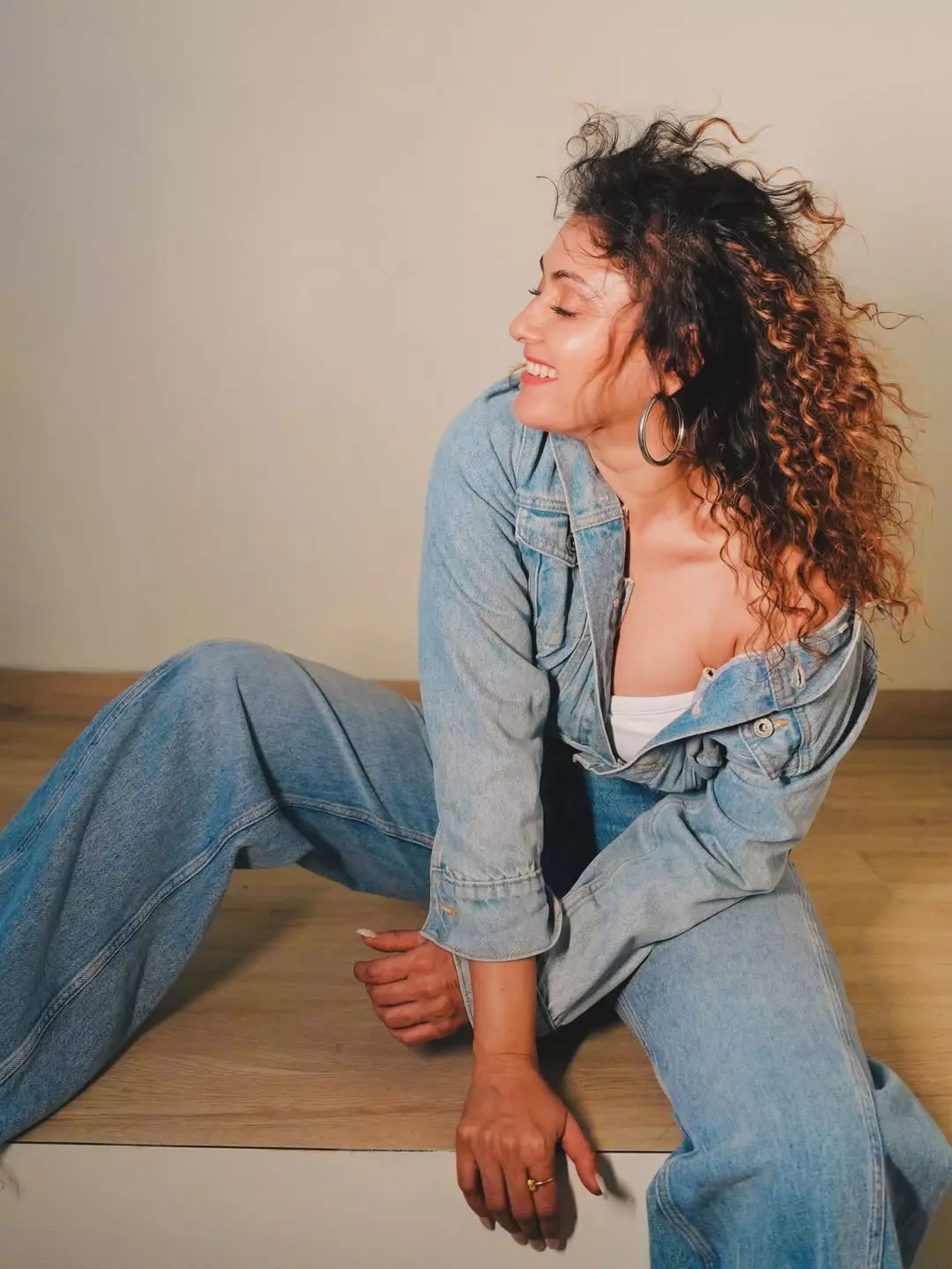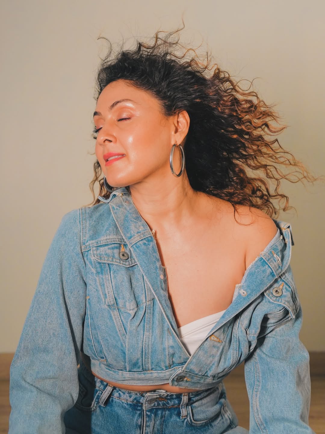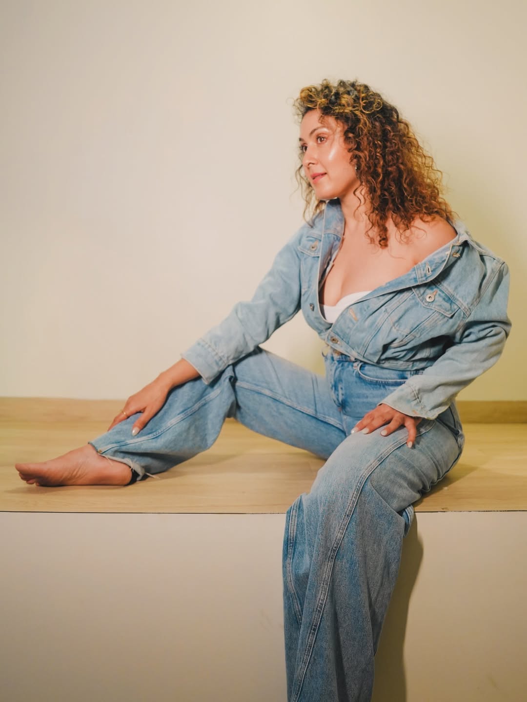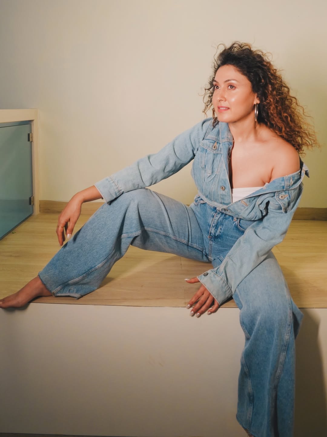 Here's a stylish denim look capturing Manjari Fadnnis in a relaxed, confident vibe under warm golden lighting. The actress rocks a full denim-on-denim ensemble with an off-shoulder jacket, exuding effortless charm and poise.