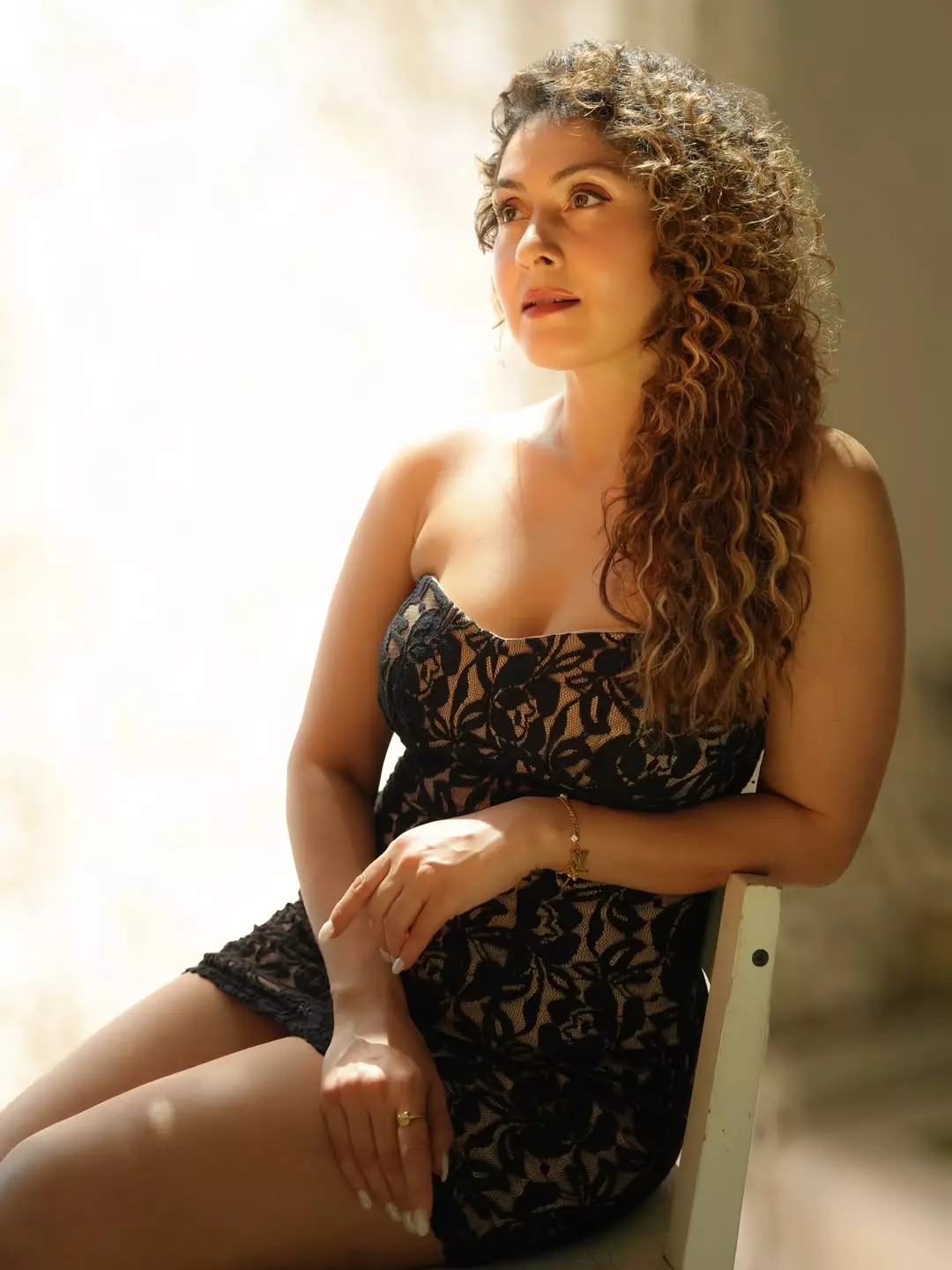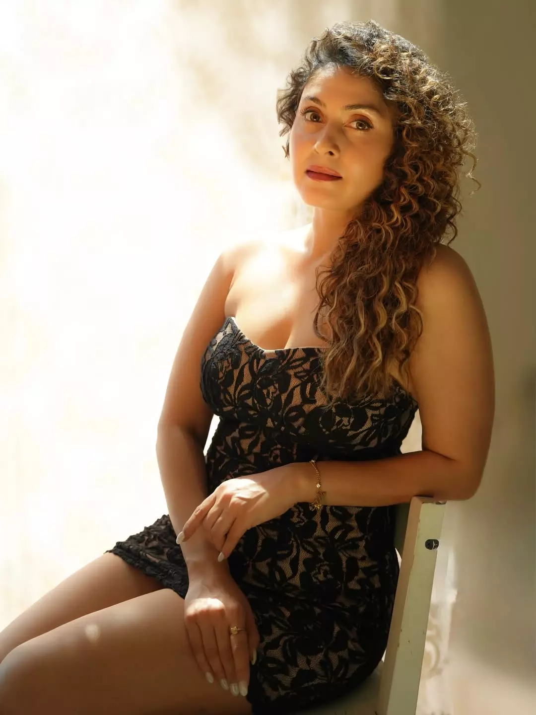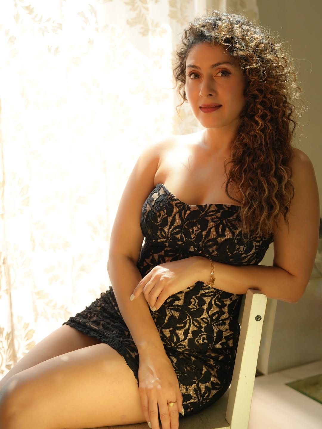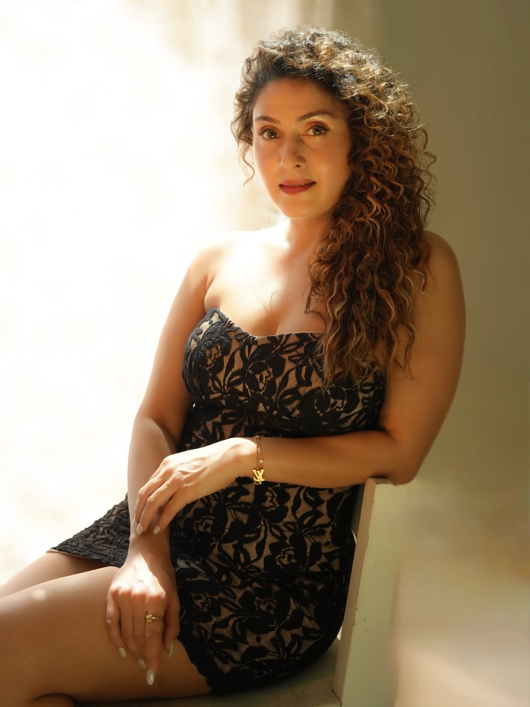 In a dazzling display of elegance and poise, Manjari Fadnnis captivates once again in this stunning photograph. Radiating confidence and timeless beauty, the actress sits gracefully in a black lace strapless dress, her voluminous curly hair cascading over one shoulder. The soft golden light illuminates her features, highlighting her expressive eyes and warm smile — a true queen in every frame.