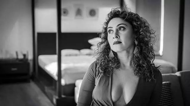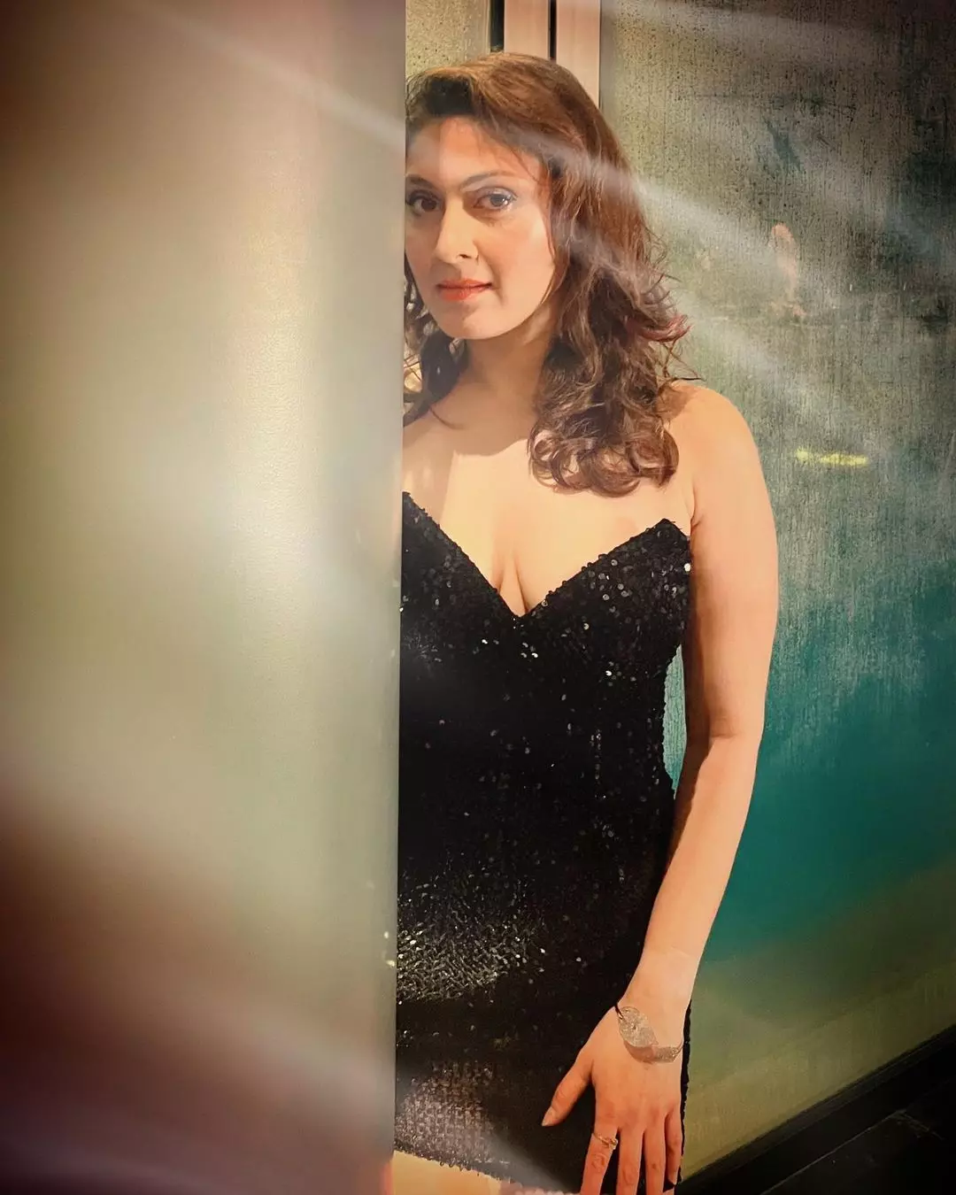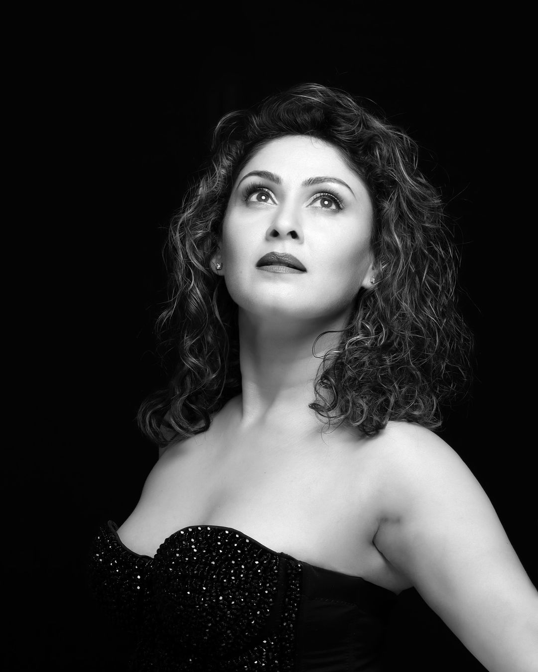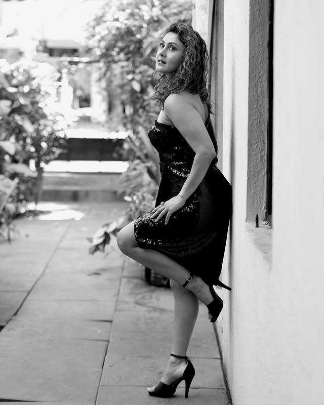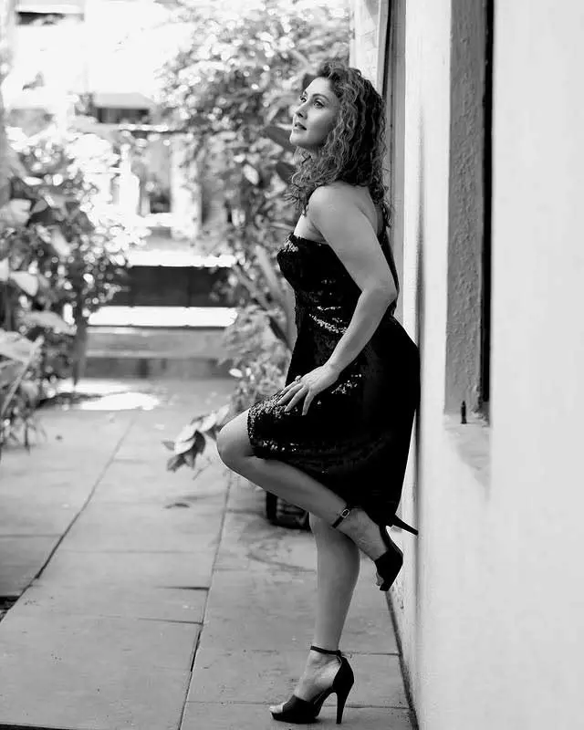 In a dazzling display of elegance and poise, Manjari Fadnnis captivates once again in this stunning photograph. Radiating confidence and timeless beauty, the actress sits gracefully in a black lace strapless dress, her voluminous curly hair cascading over one shoulder. The soft golden light illuminates her features, highlighting her expressive eyes and warm smile — a true queen in every frame.
