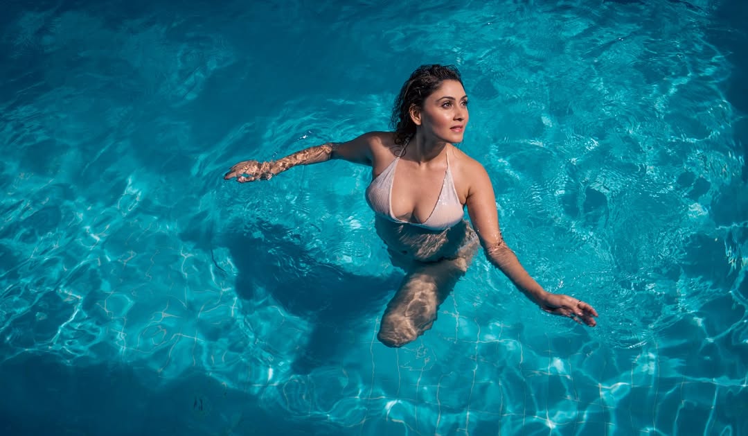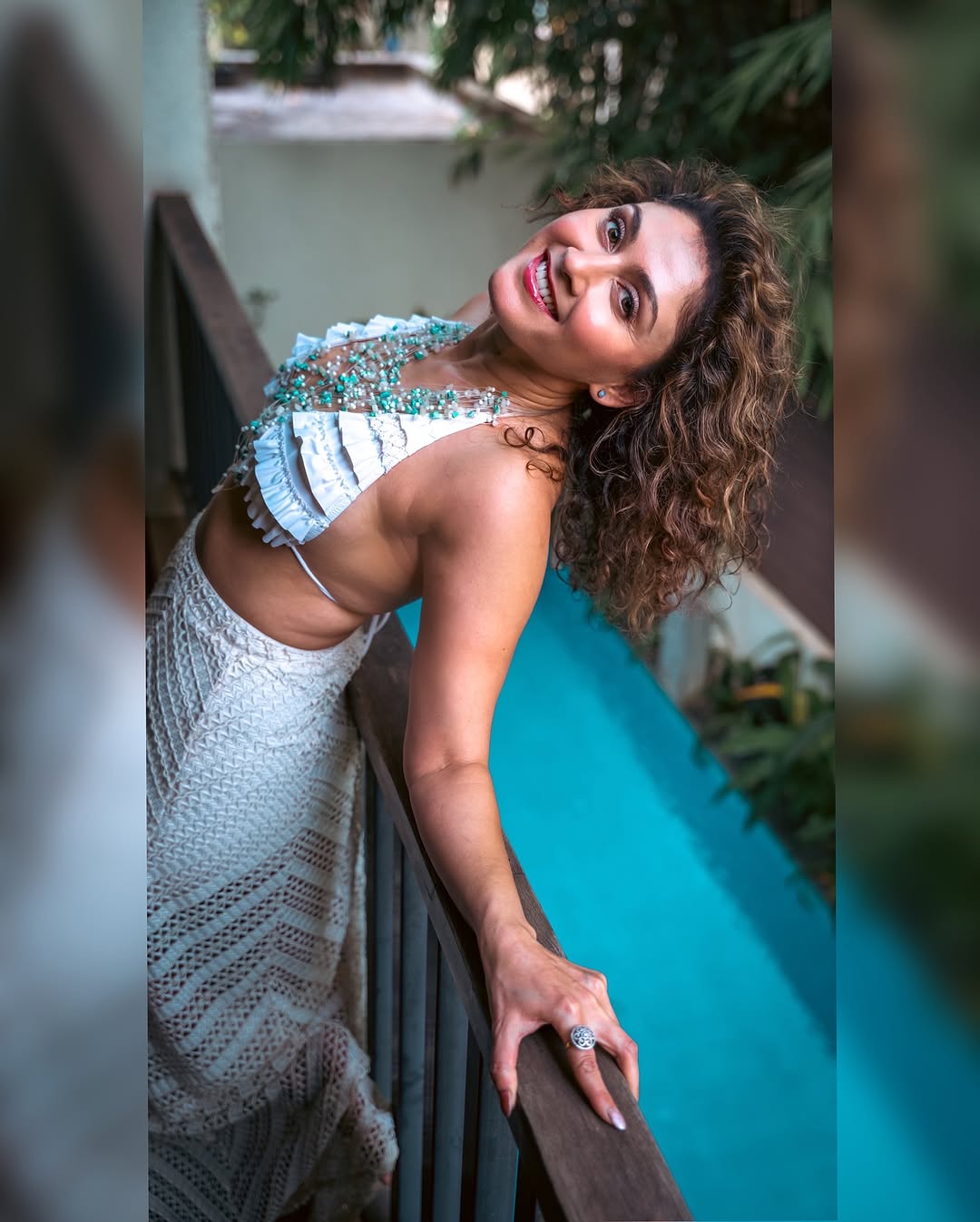 In this mesmerizing poolside portrait, Bollywood actress Manjari Fadnnis emerges as a vision of ethereal grace, her lithe form partially submerged in crystalline blue waters that mirror the boundless sky.