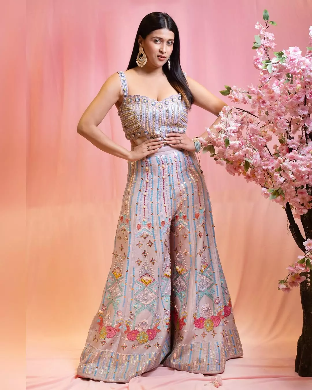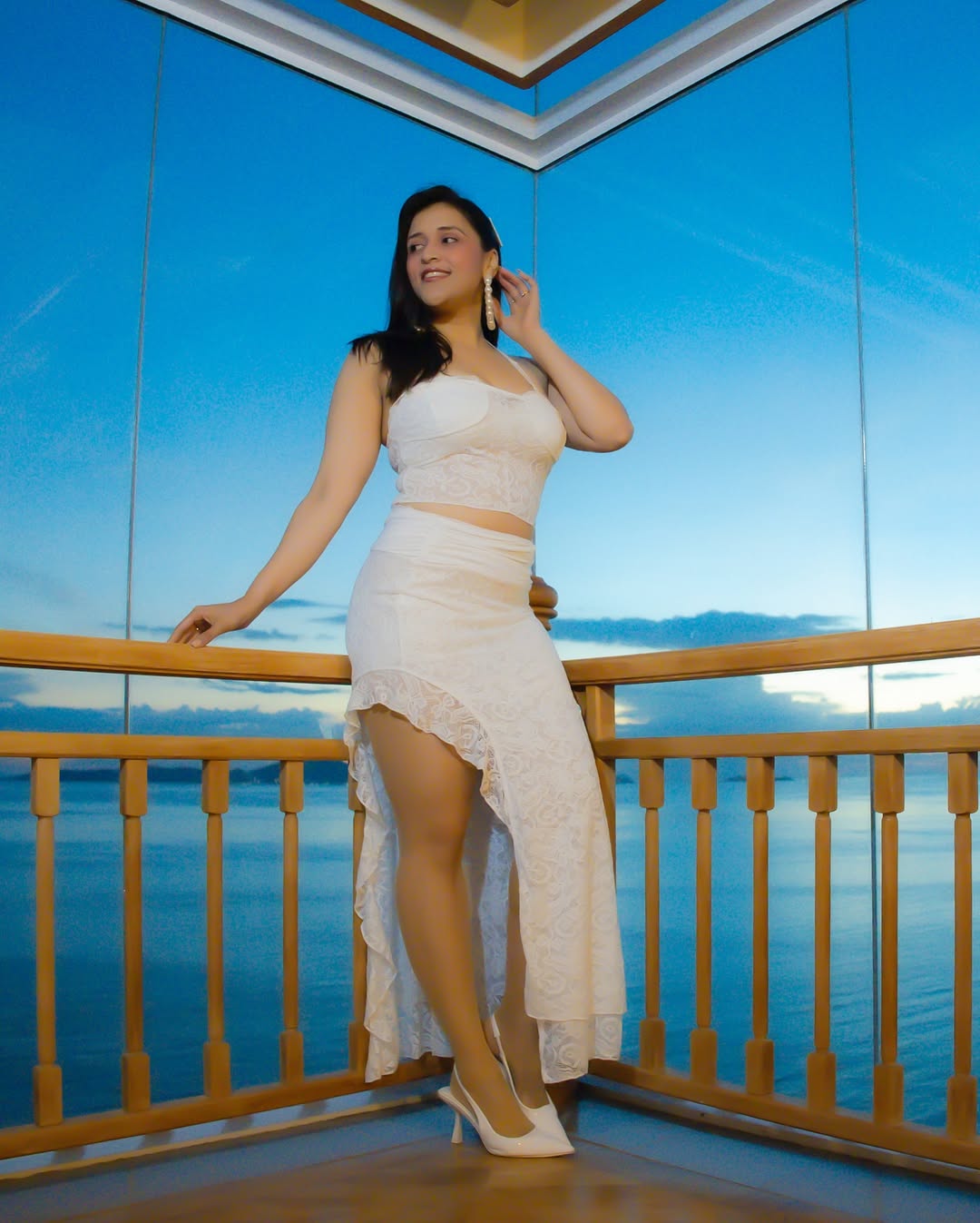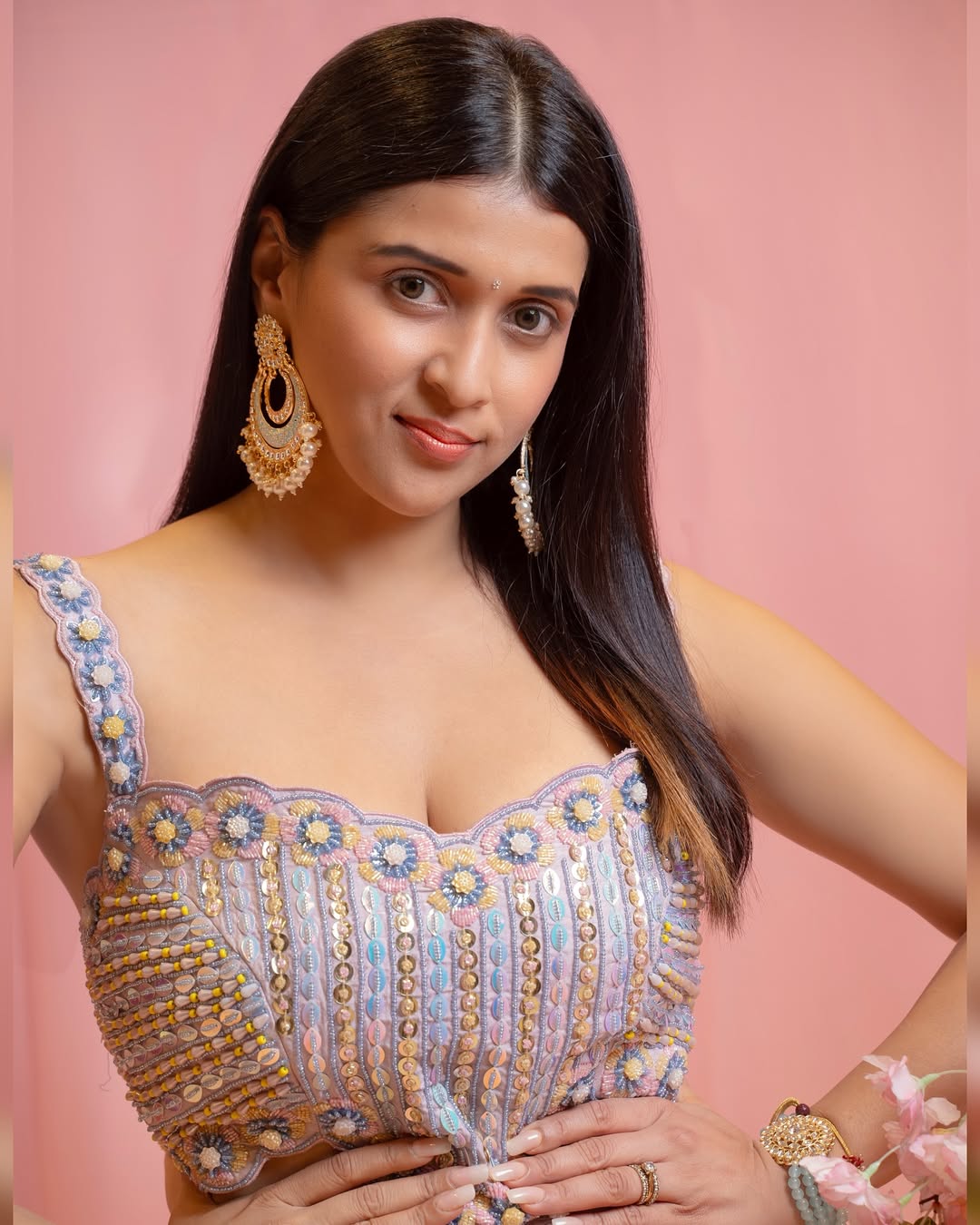 In a recent photoshoot, Mannara keeps things simple and striking in a pastel floral dress. The strapless cut and flowy design give it a soft, easy look. She pairs it with just a set of bold earrings, no heavy styling, no fuss. Her poses are calm and confident, captured in a mix of candid and composed frames.