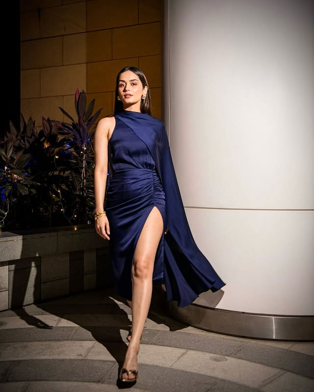 Dressed in a stunning one-shoulder navy blue dress with a stylish cape sleeve, Manushi looked gorgeous.