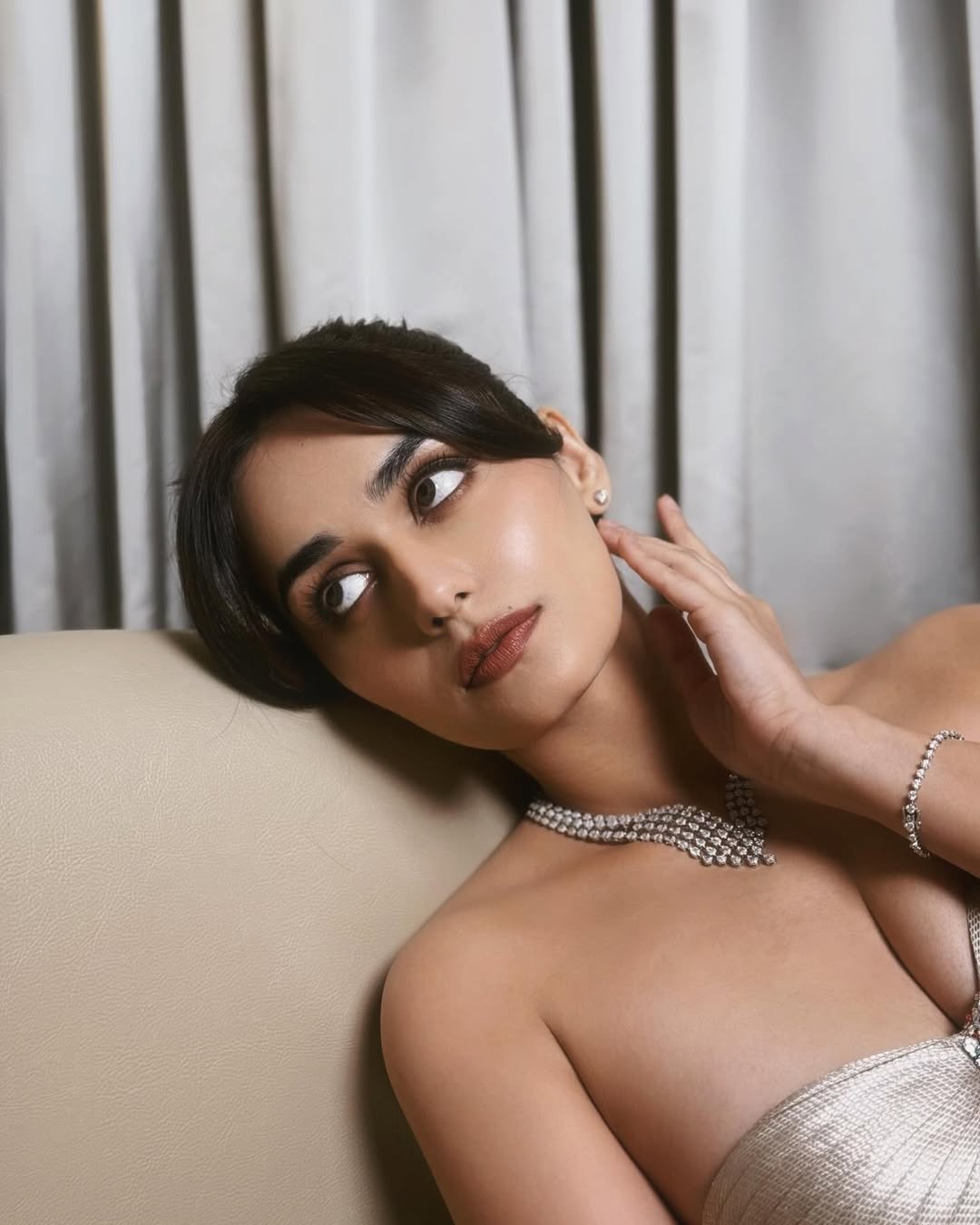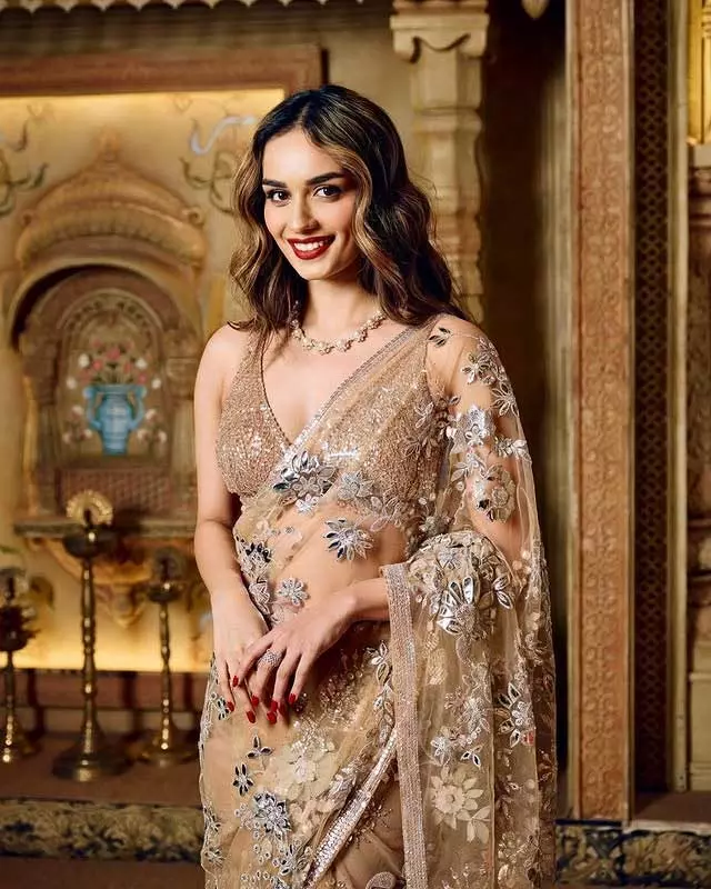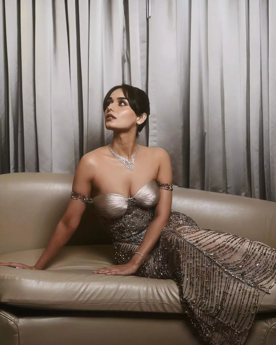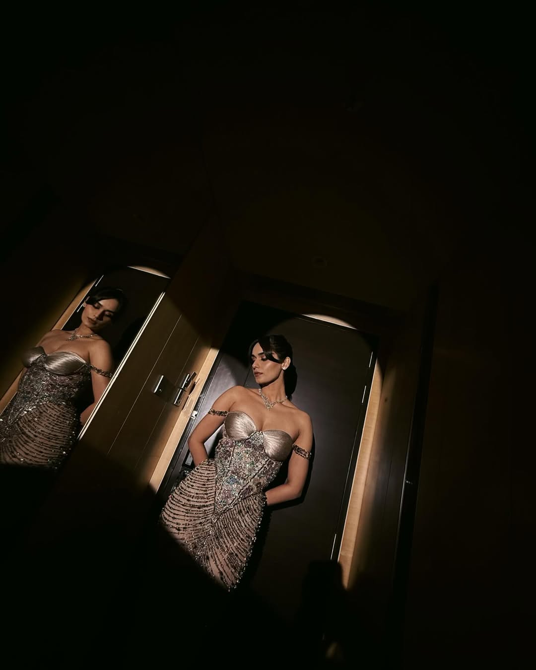 Manushi Chhillar shared a striking new picture and in the photo, Manushi is seen standing near a mirror in a shimmering gown. The dress has a soft metallic tone on the top and detailed beadwork all over the lower half. Her hair is styled neatly in an elegant updo, and she completes the look with a diamond necklace and simple earrings.