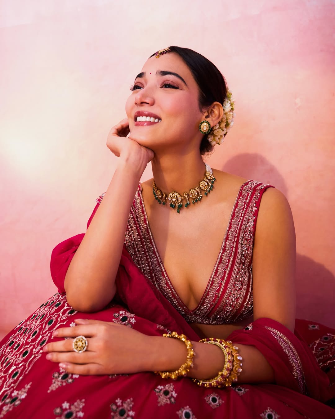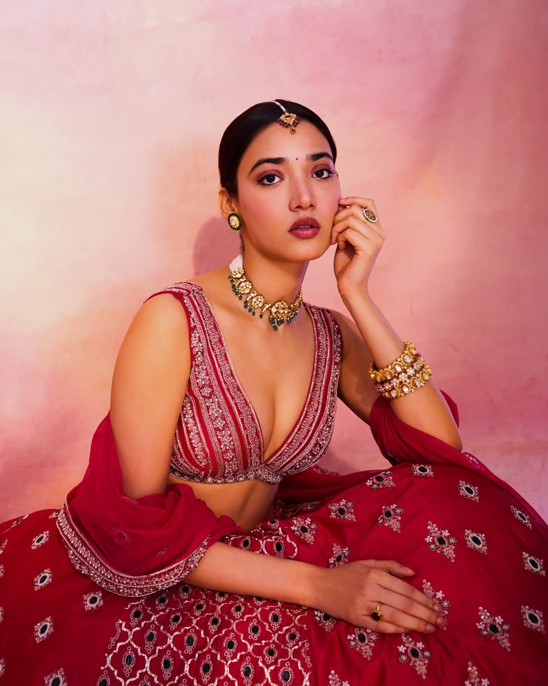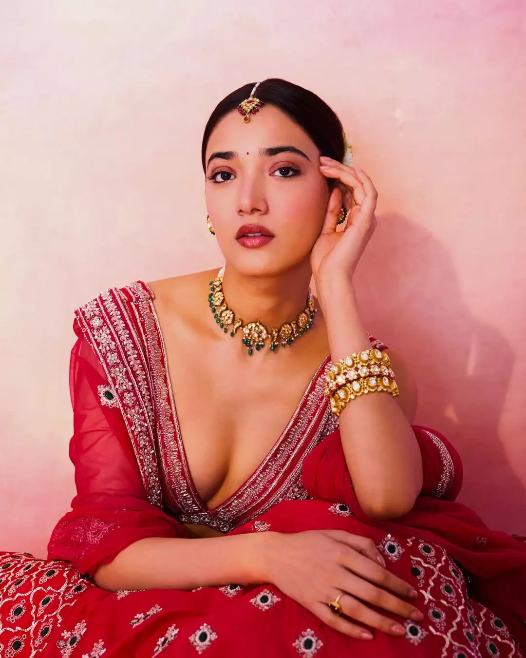 In this breathtaking photograph, Medha Shankr looks absolutely mesmerizing in a deep red traditional lehenga choli, paired with intricate silver embroidery, heavy gold jewelry, emerald-green accents, and a classic maang tikka. Her elegant pose, soft gaze, and glowing skin radiate pure grace and charm. Bohttt khushiiiiii — fans can’t stop swooning over her royal desi look!