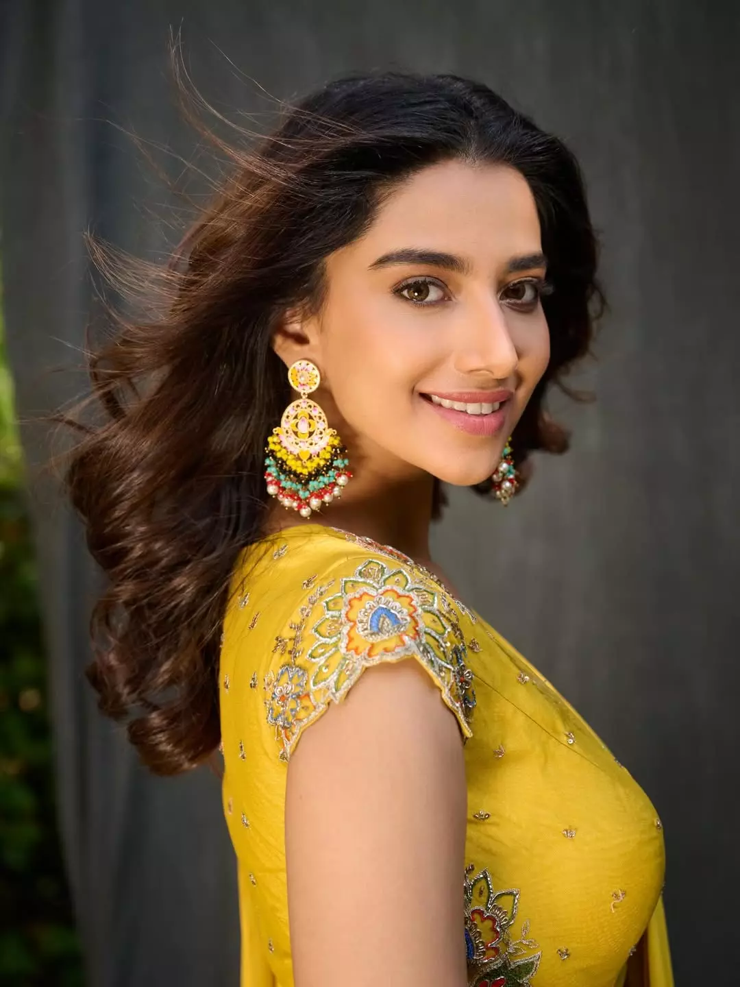 In the picture, Meenakshi wears a beautiful ruffled yellow saree that moves softly with each fold. The blouse has delicate embroidery and her jewellery is simple yet striking. She credited her team in the caption. Her styling was done by Kalyanik and her dress is from Issa Designer Studio, jewellery by Shold Sherni, styling support from Shivarathri and Tanu chettiar. Photos are taken by kalyanyasaswi, and makeup and hair is by Rajabali.
