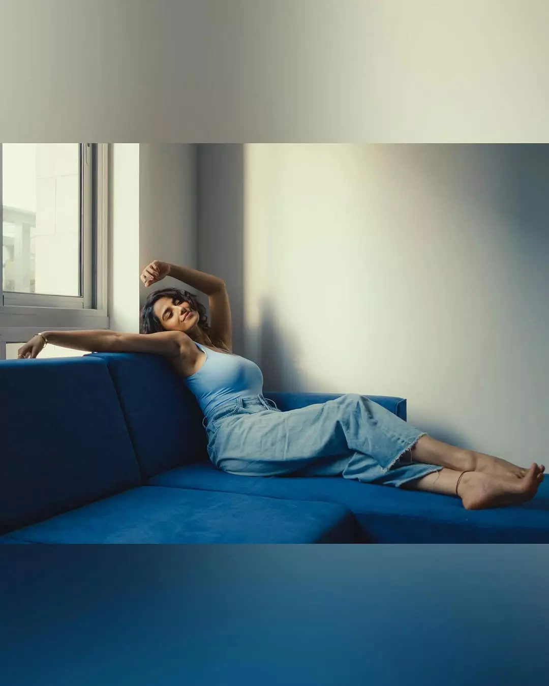 By: Tupaki Desk | 22 Jun 2025 8:44 PM ISTMeenakshi Chaudhary recently shared a calm and dreamy moment on Instagram where she’s seen relaxing on a blue couch near a window. She is seen wearing a light blue tank top and loose denim. Her caption read, “The last one is my favourite 😜🦋💙.”