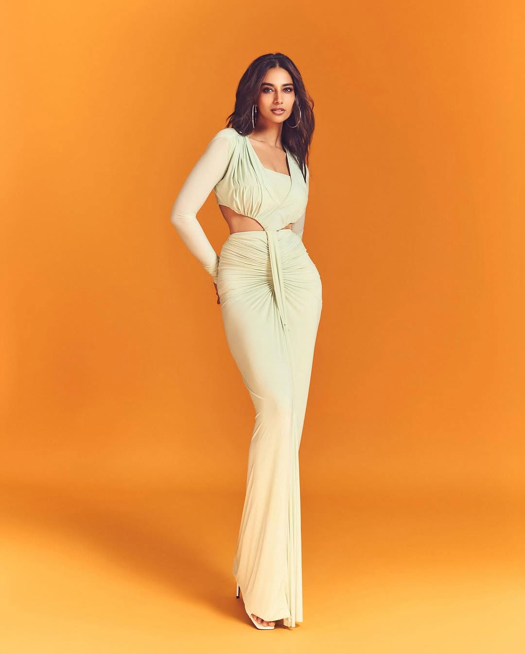 Meenakshi Chaudhary shared a new picture on Instagram. She wore a light pink saree with large floral prints. The flowers on the saree were in orange and green and she matched it with a sleeveless blouse. The blouse had orange and green patterns. She styled her hair simply and she looks like a Athiloka Sundari.