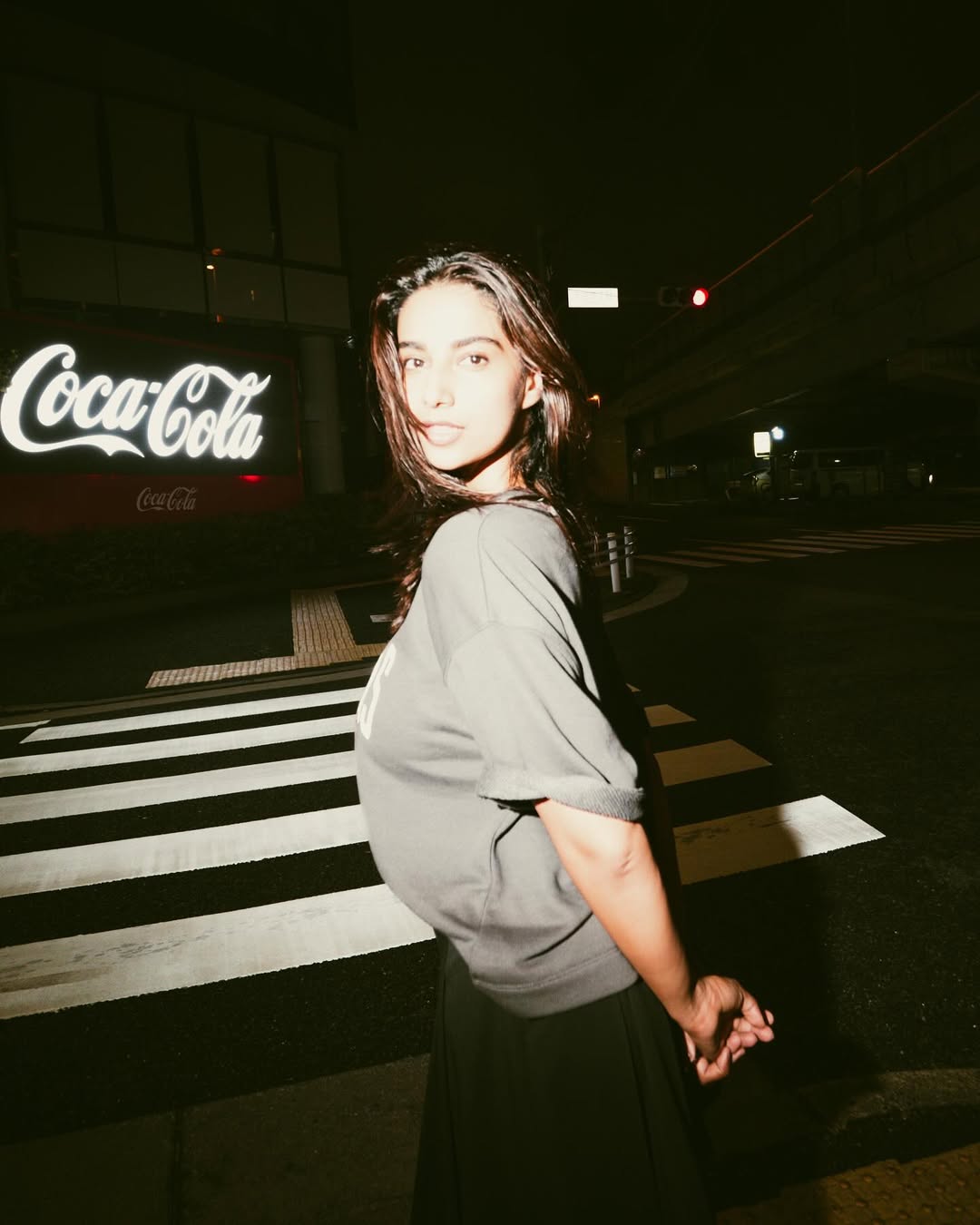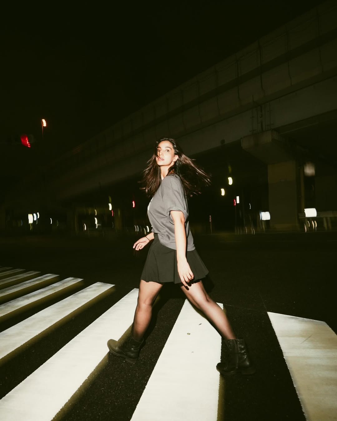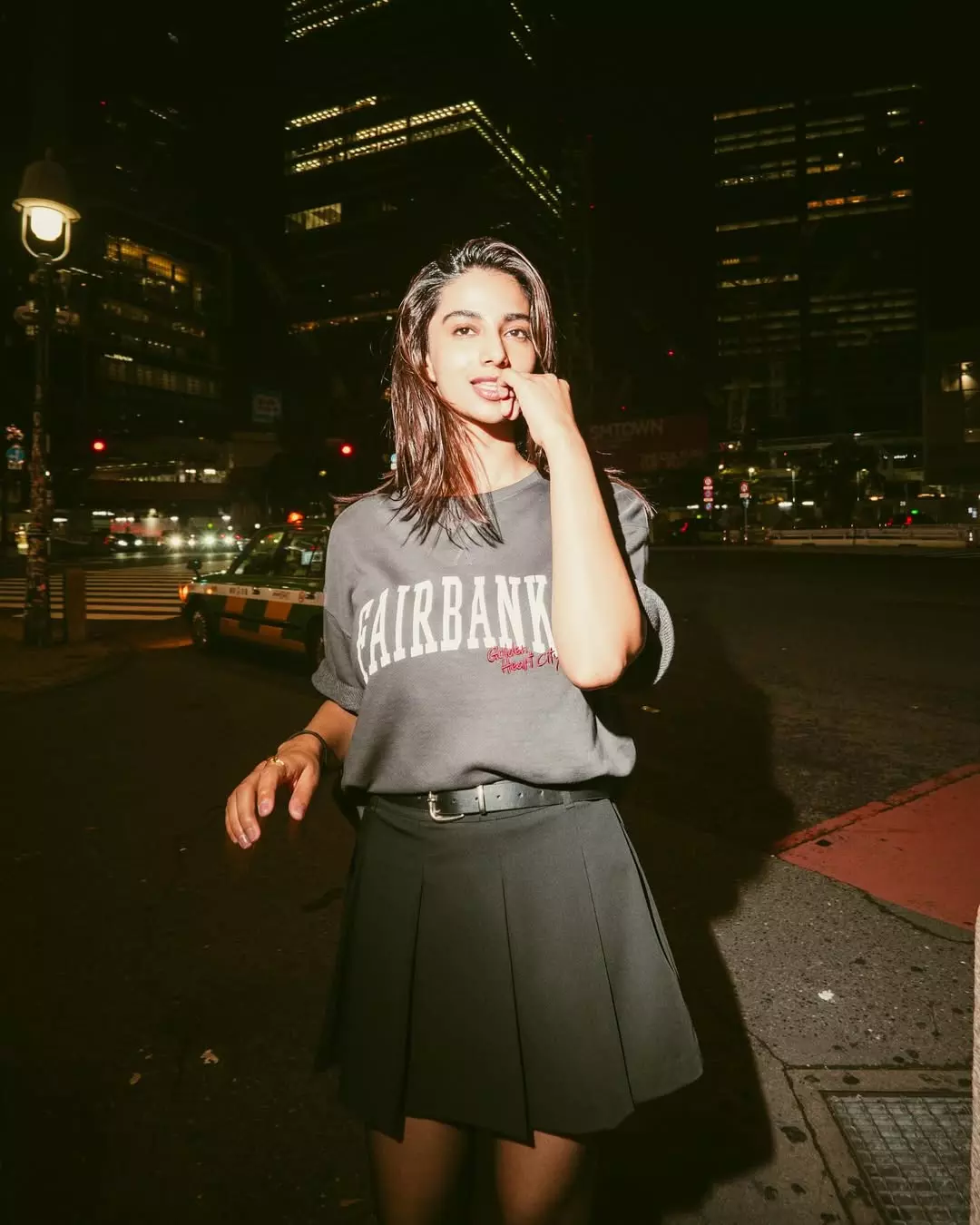 Meenakshi Chaudhary shared new photos on her Instagram. She looked casual and stylish in the night street backdrop. She wore a grey top with the word “Fairbanks” written on it. She paired it with a black skirt that gave her a neat and trendy look. The dim street lights and city background added charm to her pictures. Her caption read, “The last picture is my favourite 🥺🤎.” The photographer tagged in the post was @afrographer.