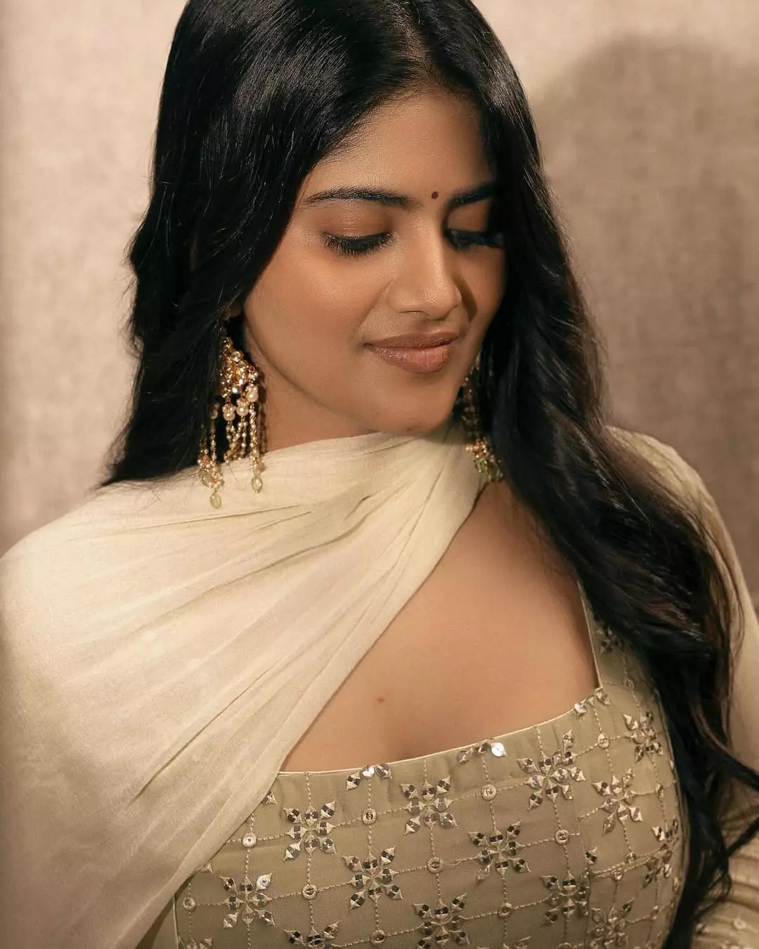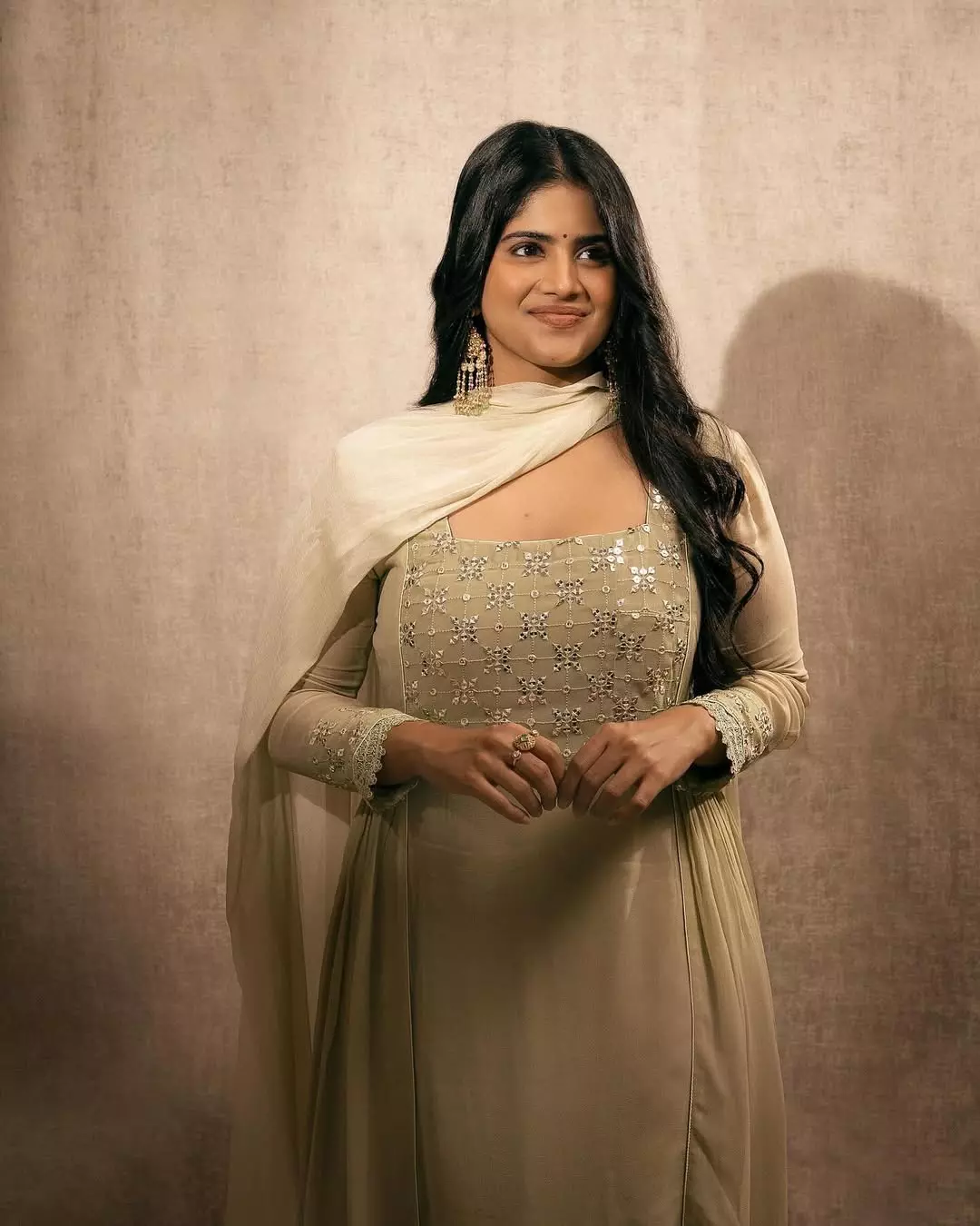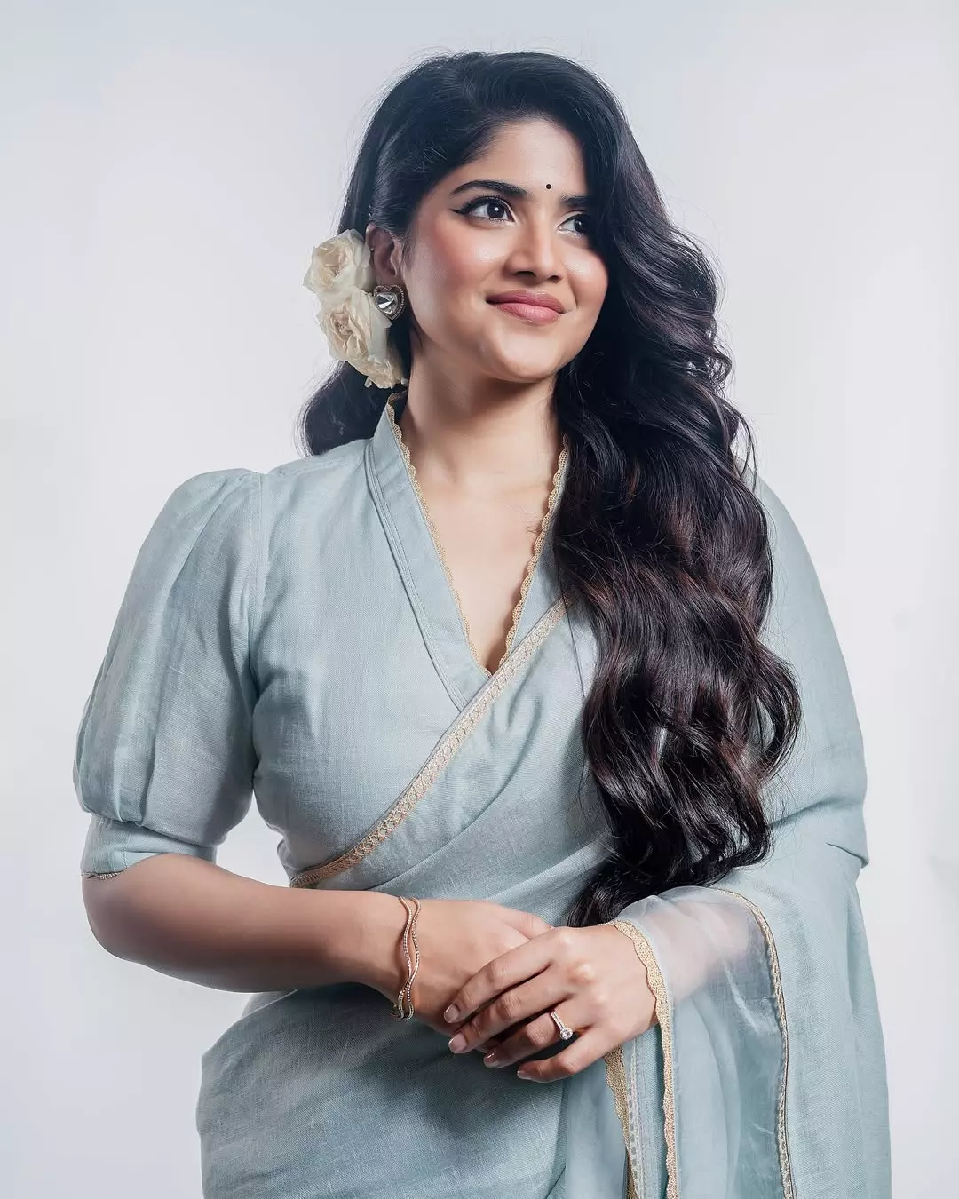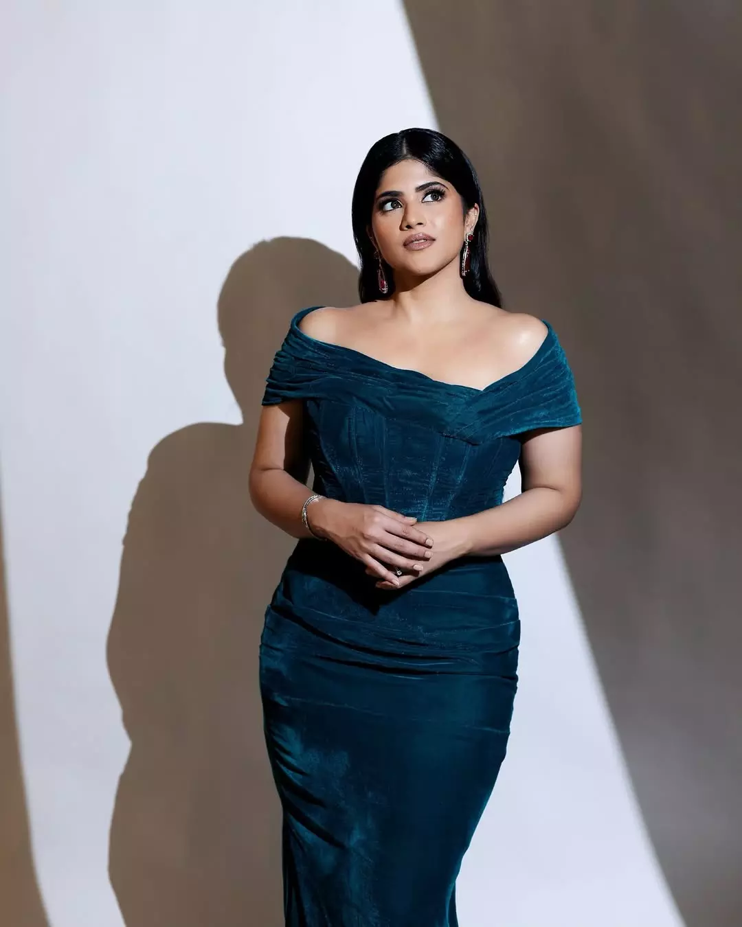 In this look, Megha dazzles in an off-shoulder emerald green velvet gown, exuding elegance and grace. The flawless draping and perfect fit elevate her regal presence, while her soft waves, minimal makeup, and statement earrings add sophistication. She seamlessly blends timeless beauty with modern fashion.