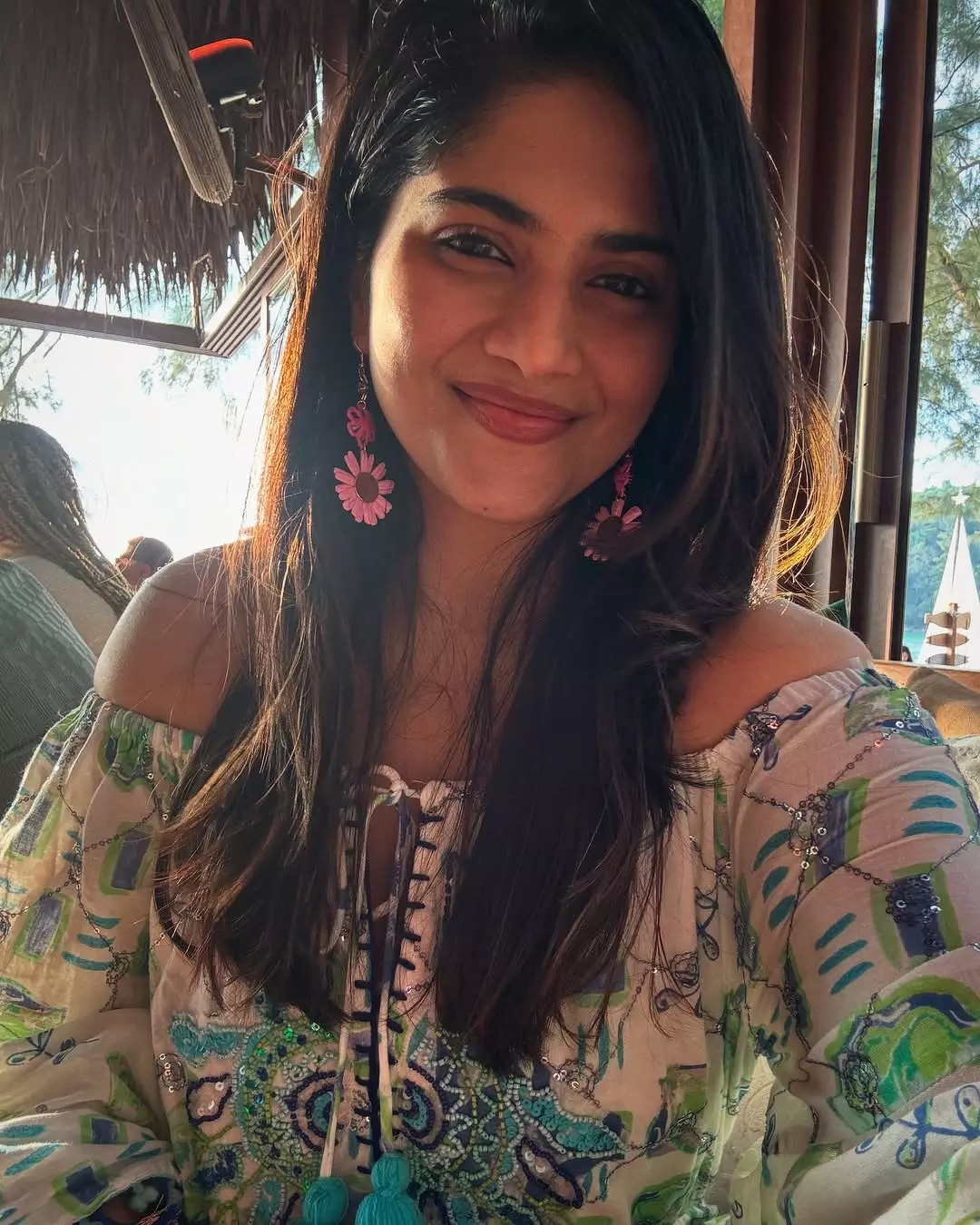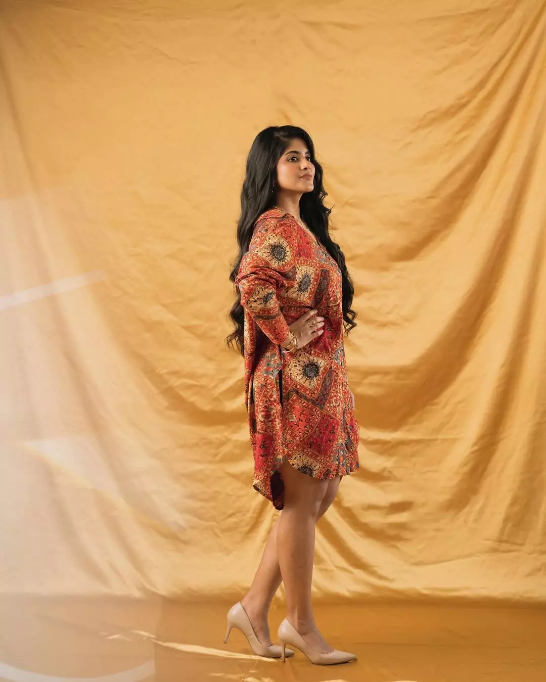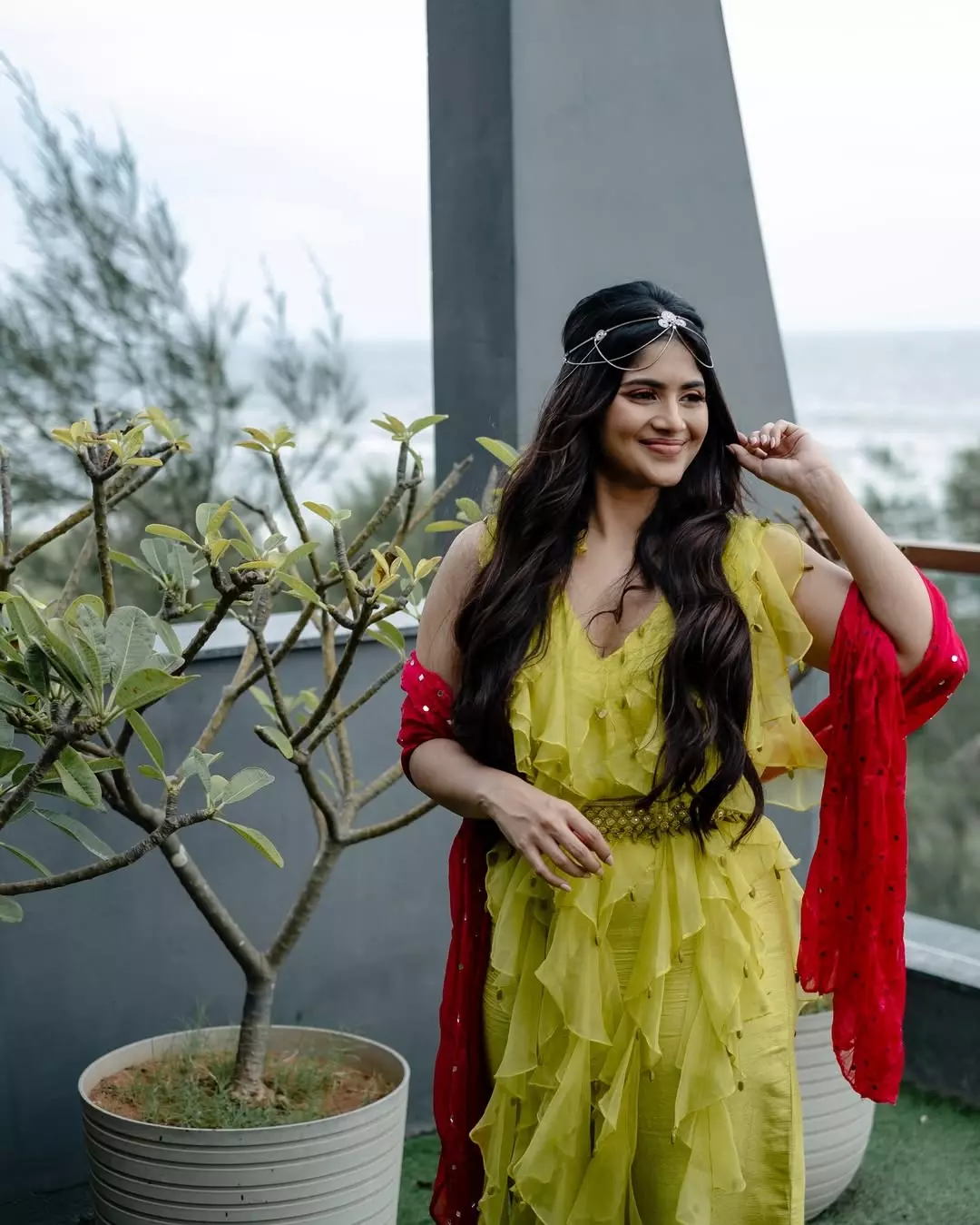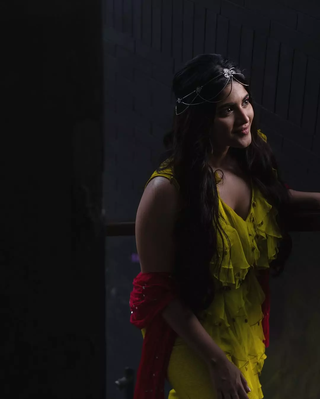 In this look, Megha dazzles in an off-shoulder emerald green velvet gown, exuding elegance and grace. The flawless draping and perfect fit elevate her regal presence, while her soft waves, minimal makeup, and statement earrings add sophistication. She seamlessly blends timeless beauty with modern fashion.