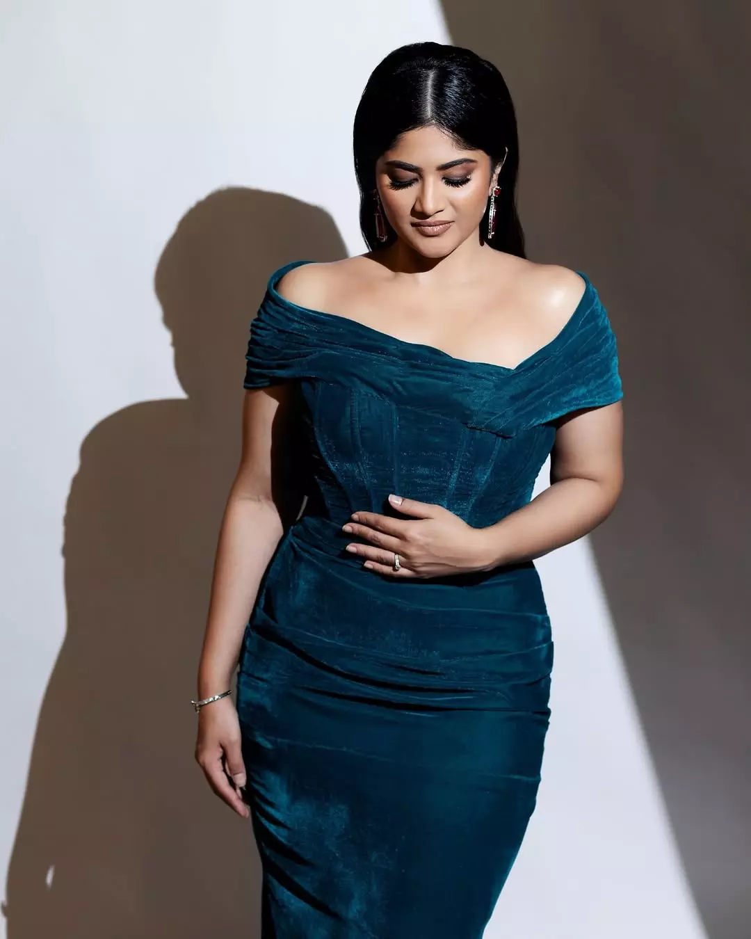 Megha dazzles in an off-shoulder emerald green velvet gown
