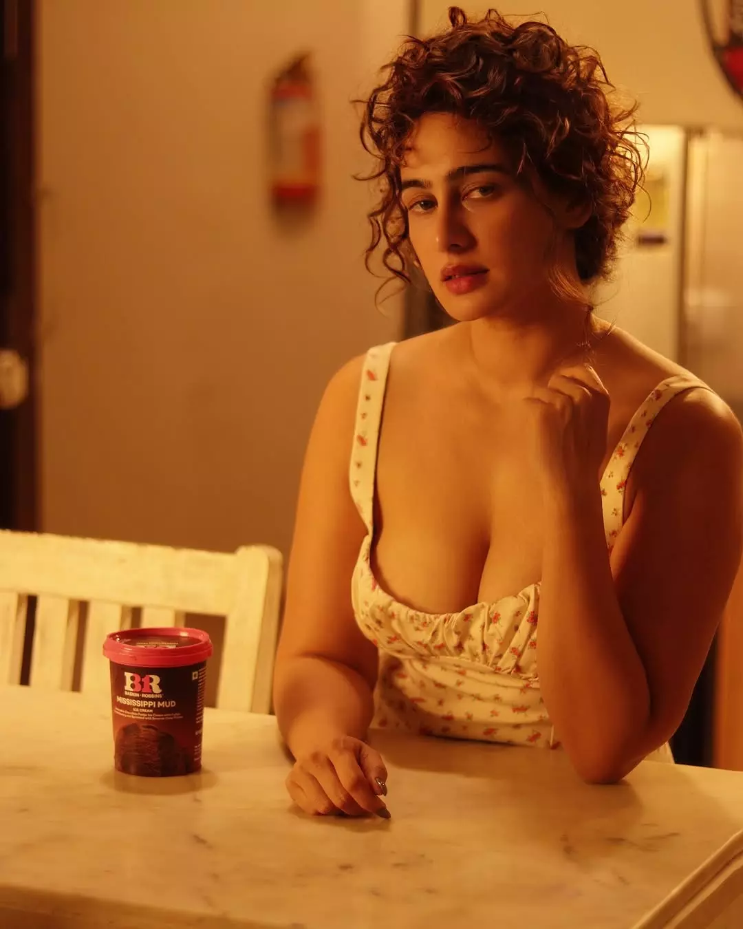 Megha Shukla looks effortlessly radiant in this dreamy frame, exuding charm and grace in a delicate polka-dot dress with black lace detailing.