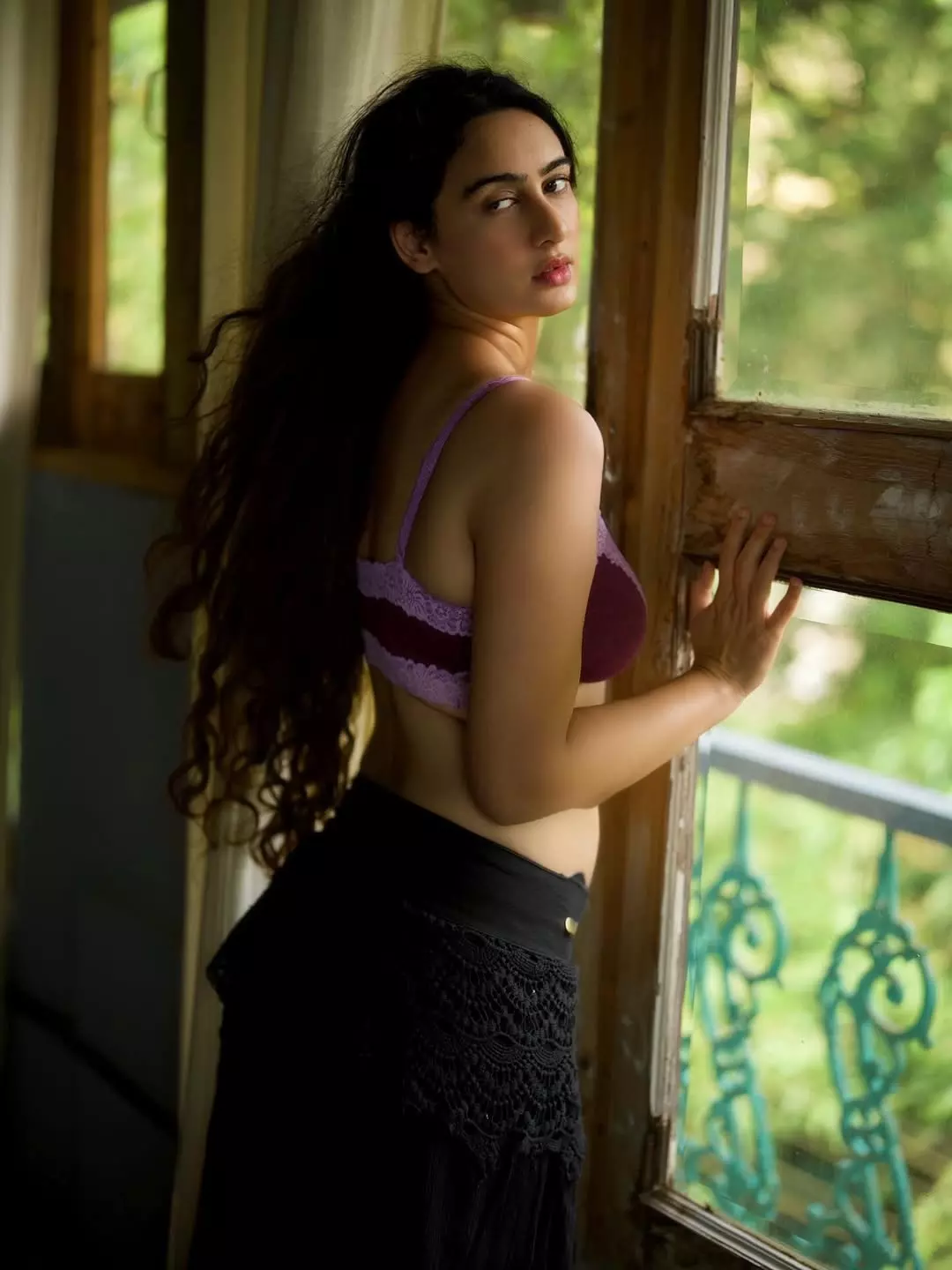 In the quiet moments of a lush, verdant afternoon, where sunlight filters through gauzy curtains and wooden shutters frame the embrace of nature, Megha Shukla stands as a vision of serene allure. Her raven waves cascade softly over one shoulder, framing a face lit with a subtle, knowing smile that hints at secrets shared with the whispering breeze. Clad in a delicate maroon lace bra that accentuates her graceful curves and a flowing black fringed skirt that sways like midnight shadows, she embodies an effortless blend of vulnerability and strength—her toned midriff a canvas of quiet confidence, her eyes inviting the viewer into this intimate reverie amid the verdant hush.