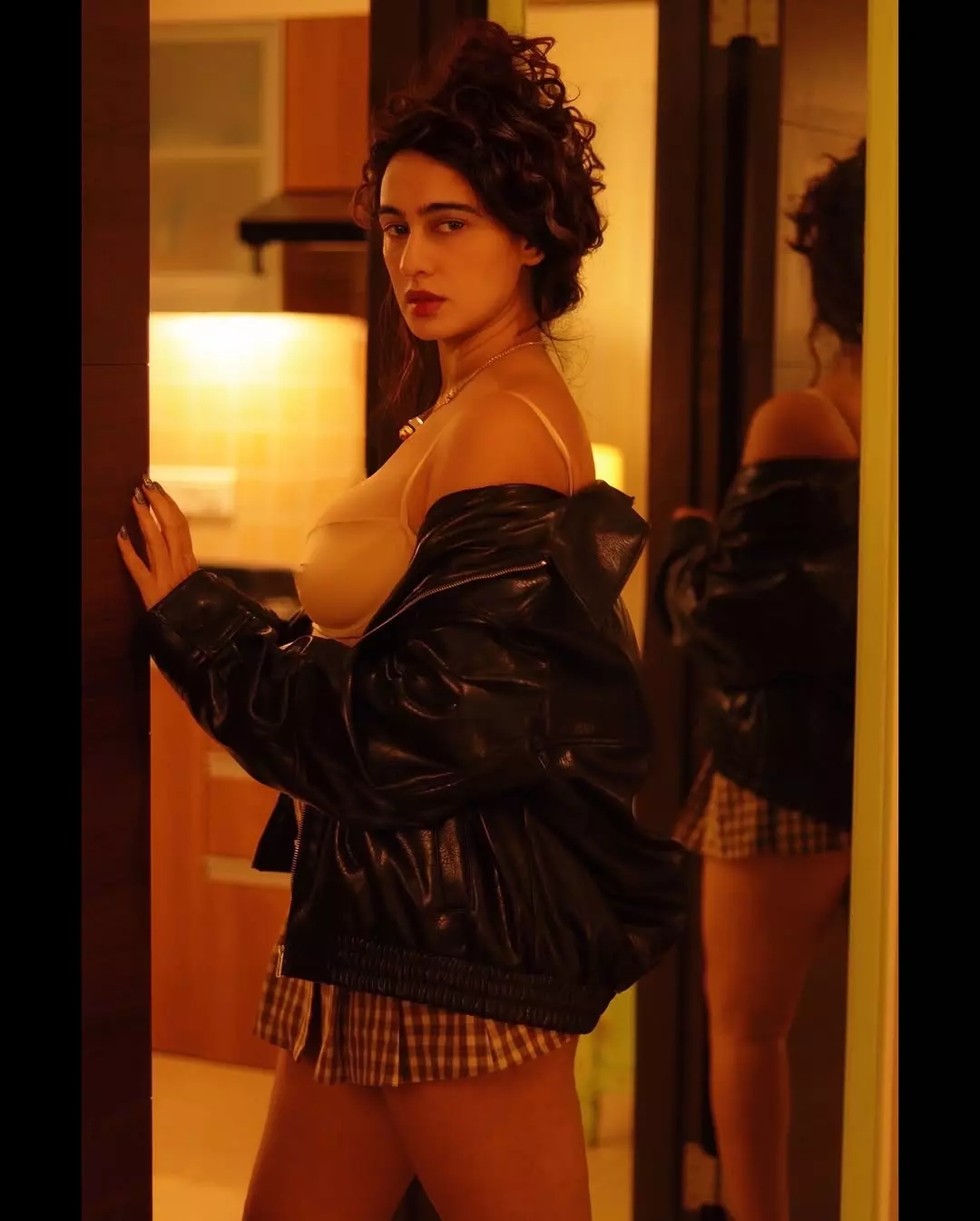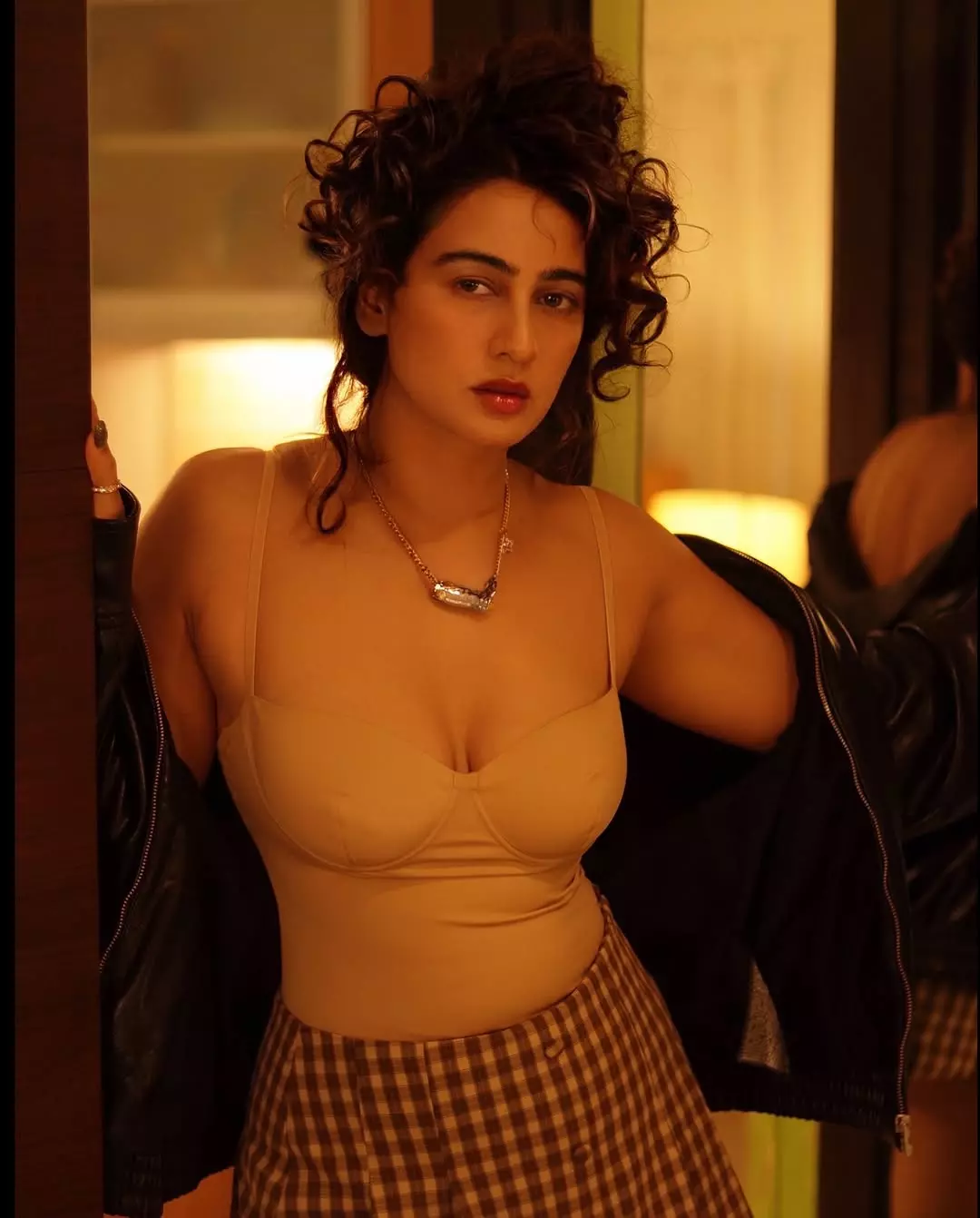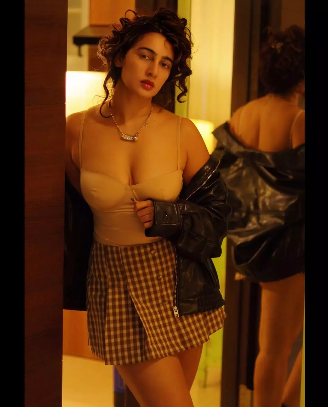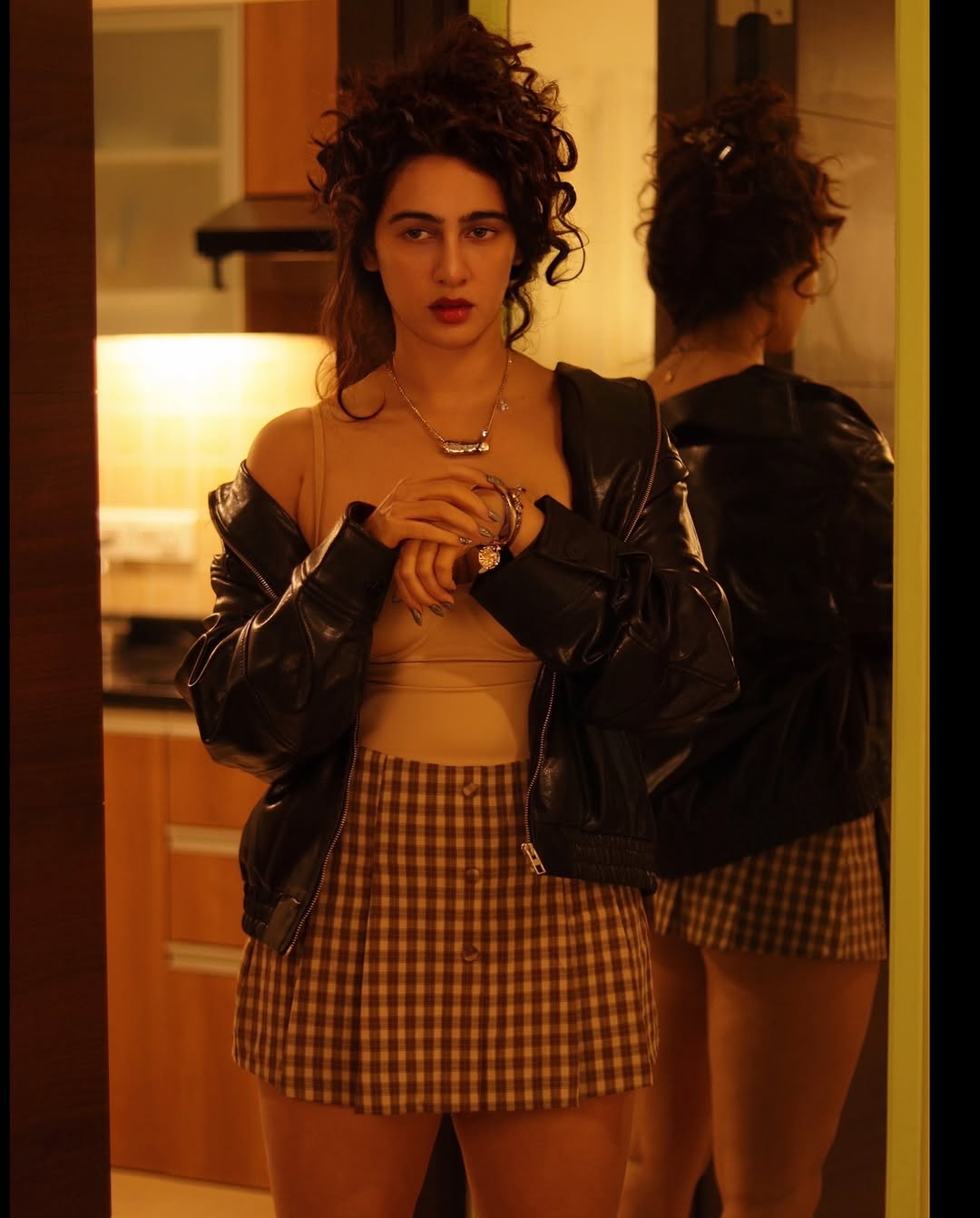Recently Megha shared a set of captivating photos on her Instagram. She wore a beige corset top paired with a checkered skirt. She added a black leather jacket for an edgy touch. Her voluminous curls and bold red lip color enhanced the look further.