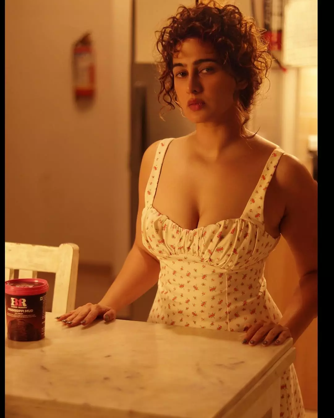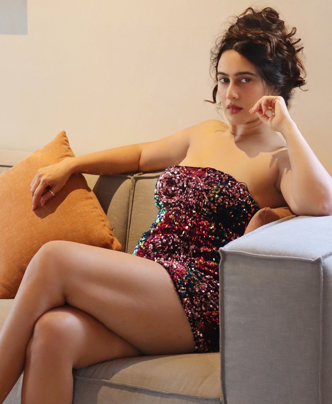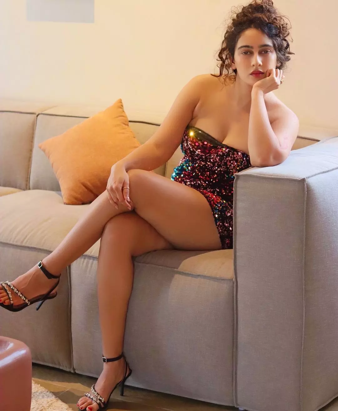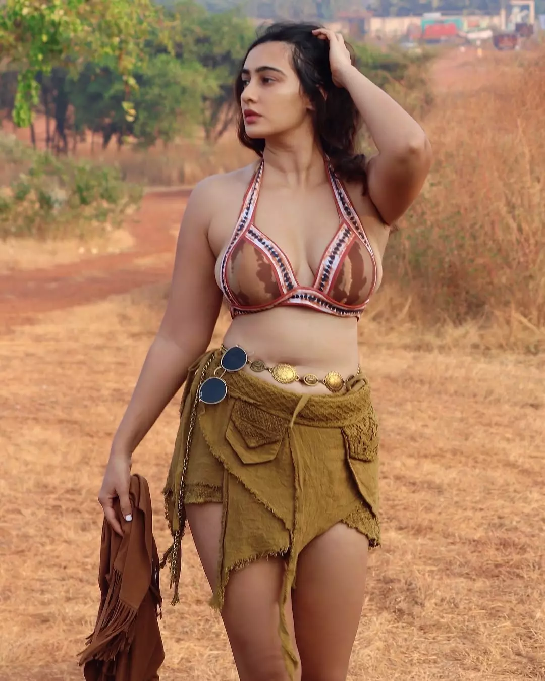 Recently Megha shared a set of captivating photos on her Instagram. She wore a beige corset top paired with a checkered skirt. She added a black leather jacket for an edgy touch. Her voluminous curls and bold red lip color enhanced the look further.