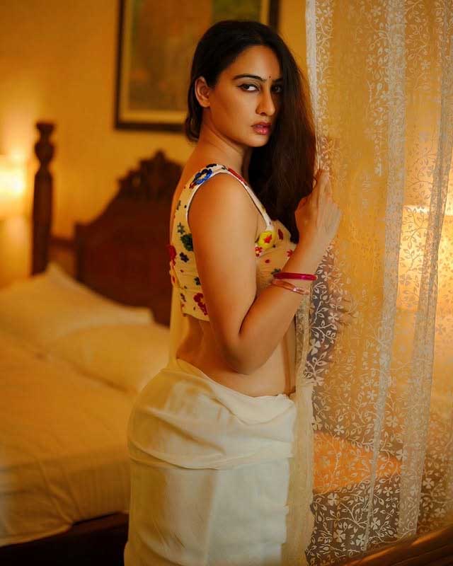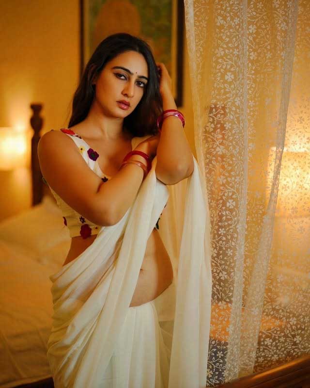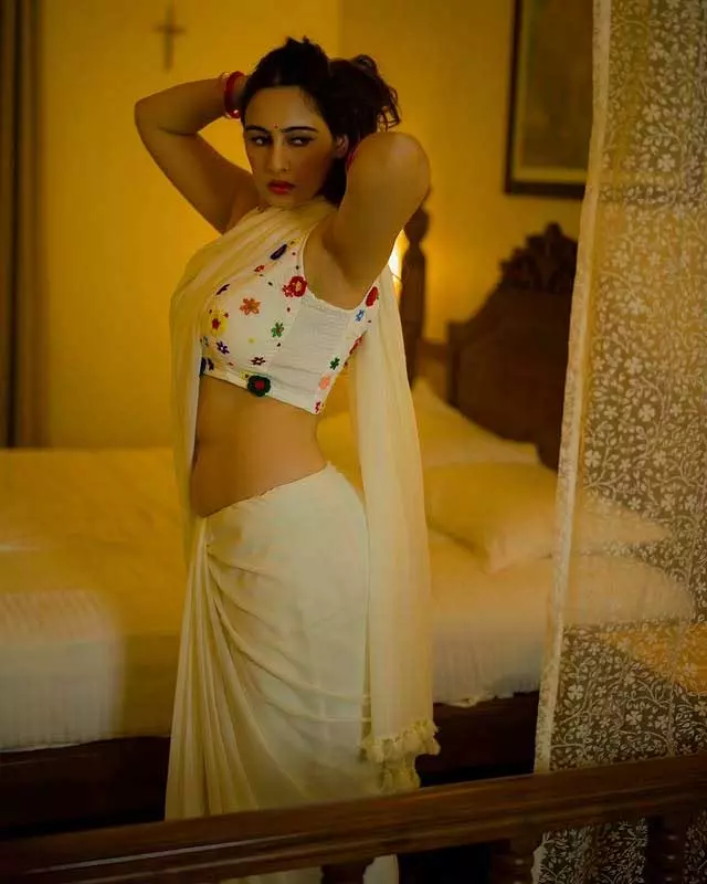 In the soft golden glow of the room, Megha Shukla stands as a vision of timeless beauty. Draped in a pristine white saree, she redefines elegance with every fold, every glance. Her floral blouse blooms with the vibrancy of tradition meeting modern charm each flower a symbol of confidence, color, and femininity.