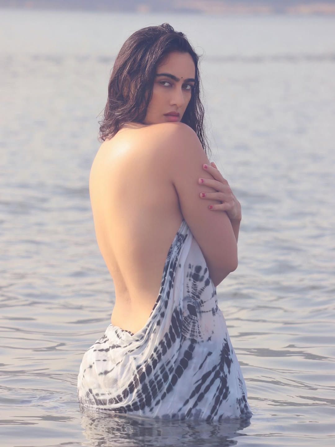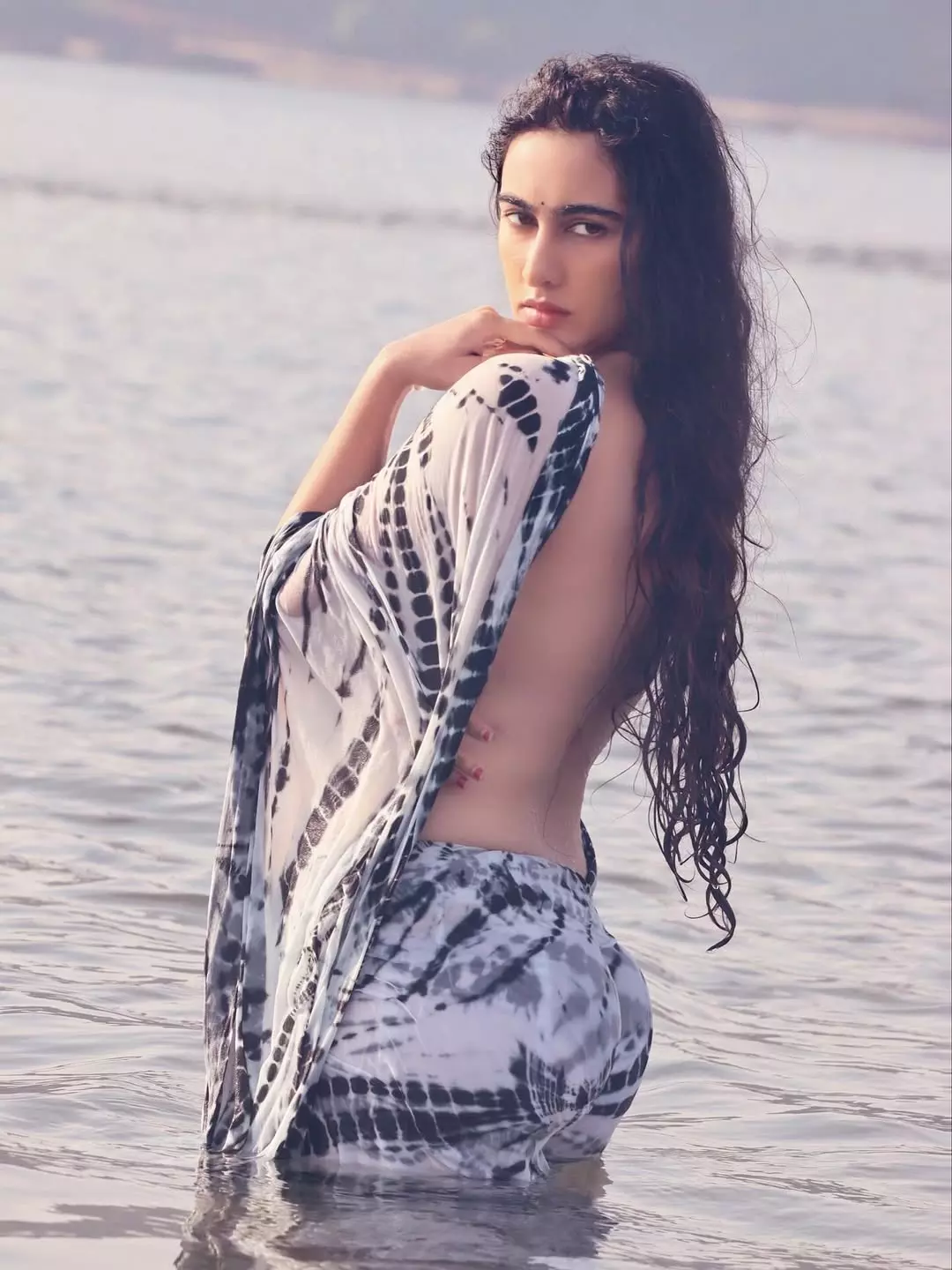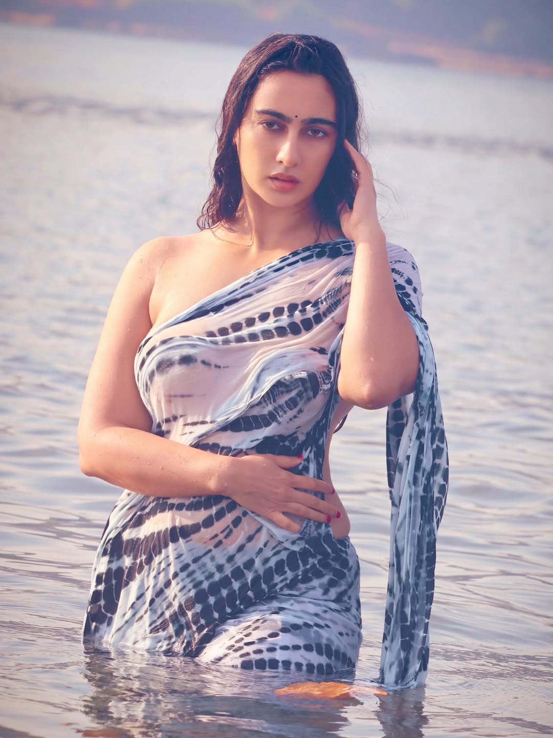 Draped in a striking monochrome wrap with tie-dye patterns, Megha effortlessly combined elegance with bold styling. Her look captured the essence of natural beauty, with her wet, wavy hair cascading freely and her radiant skin glowing under the soft sunlight. The serene backdrop of the water perfectly complemented her striking presence, making every frame look cinematic and breathtaking.