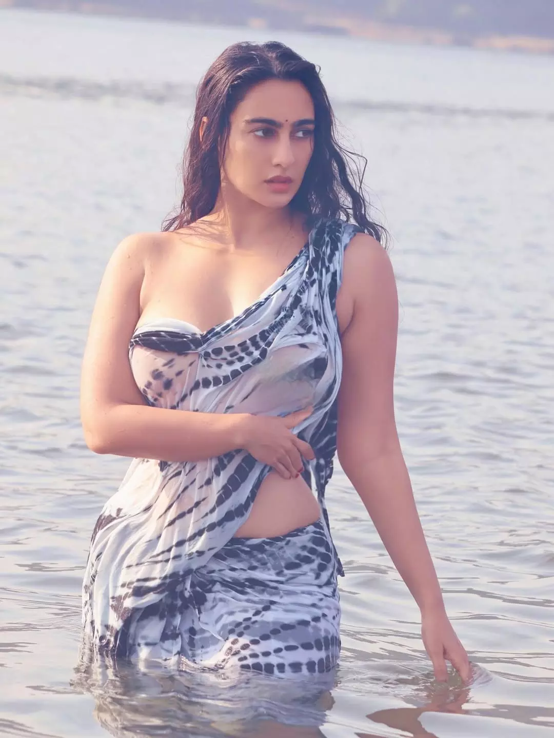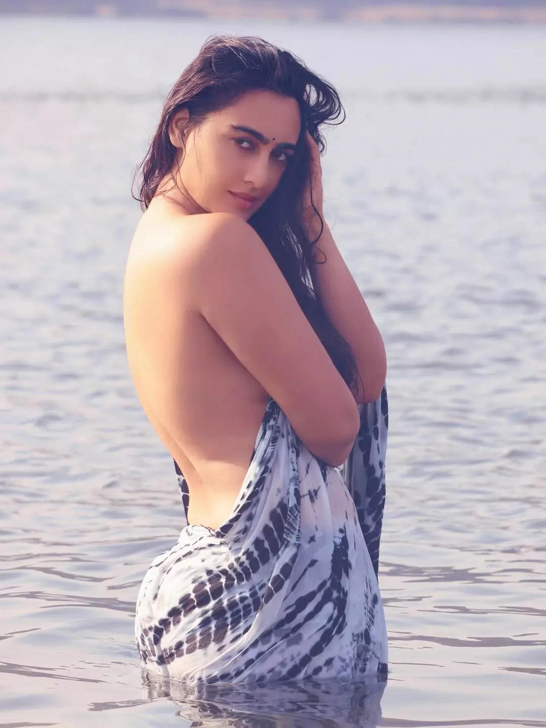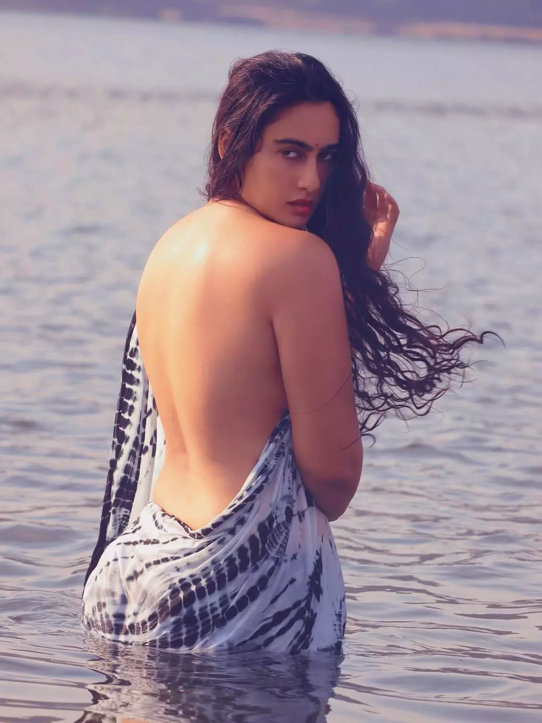 Draped in a striking monochrome wrap with tie-dye patterns, Megha effortlessly combined elegance with bold styling. Her look captured the essence of natural beauty, with her wet, wavy hair cascading freely and her radiant skin glowing under the soft sunlight. The serene backdrop of the water perfectly complemented her striking presence, making every frame look cinematic and breathtaking.