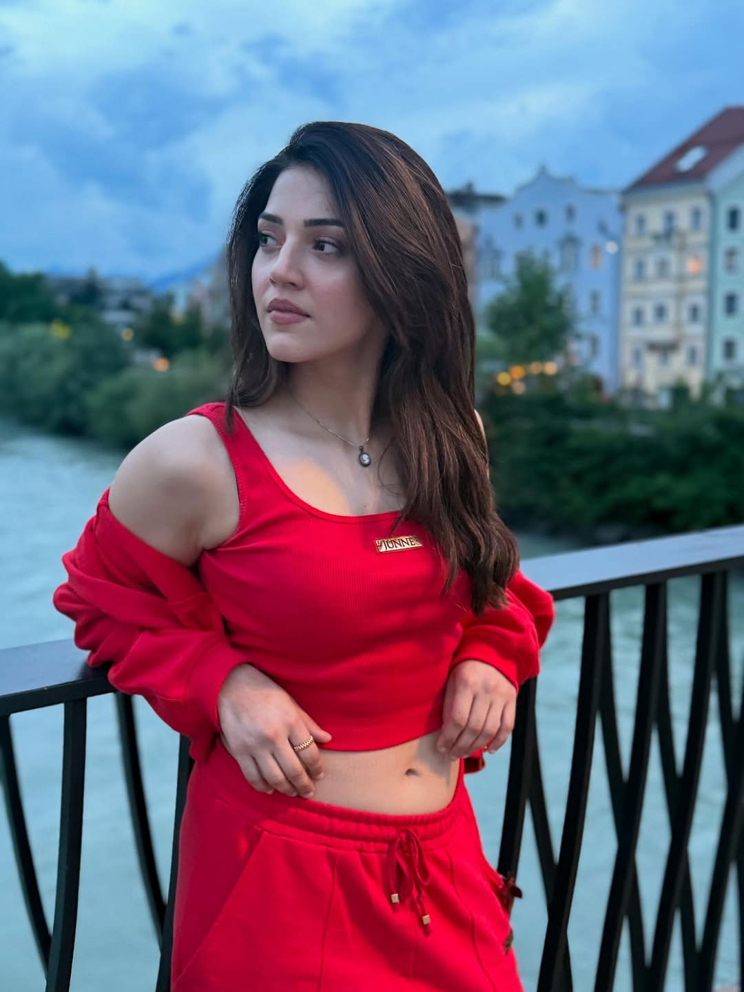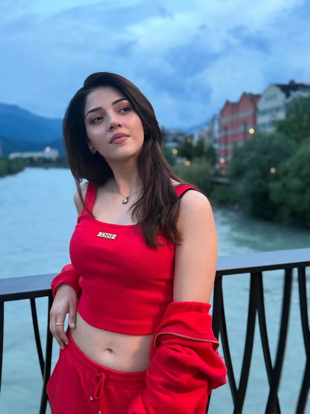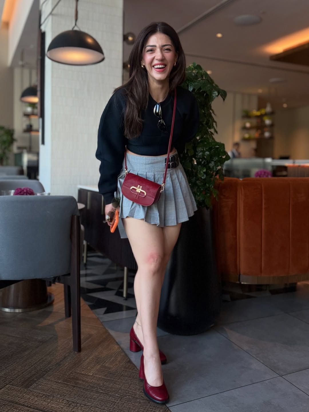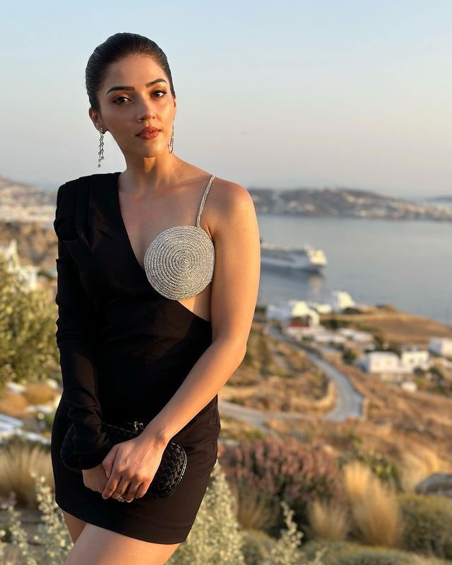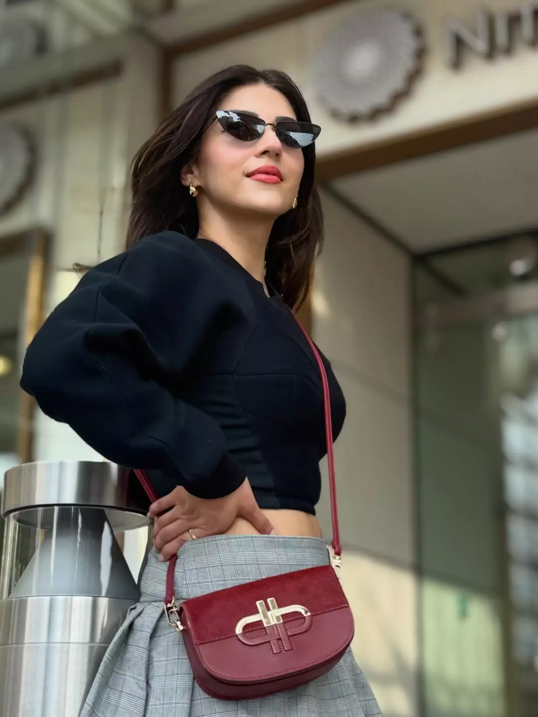 In the photo, Mehreen is seen standing outdoors in a stylish dress. She is wearing a black full-sleeve crop top paired with a grey skirt. She also carries a small red handbag that matches well with her look.