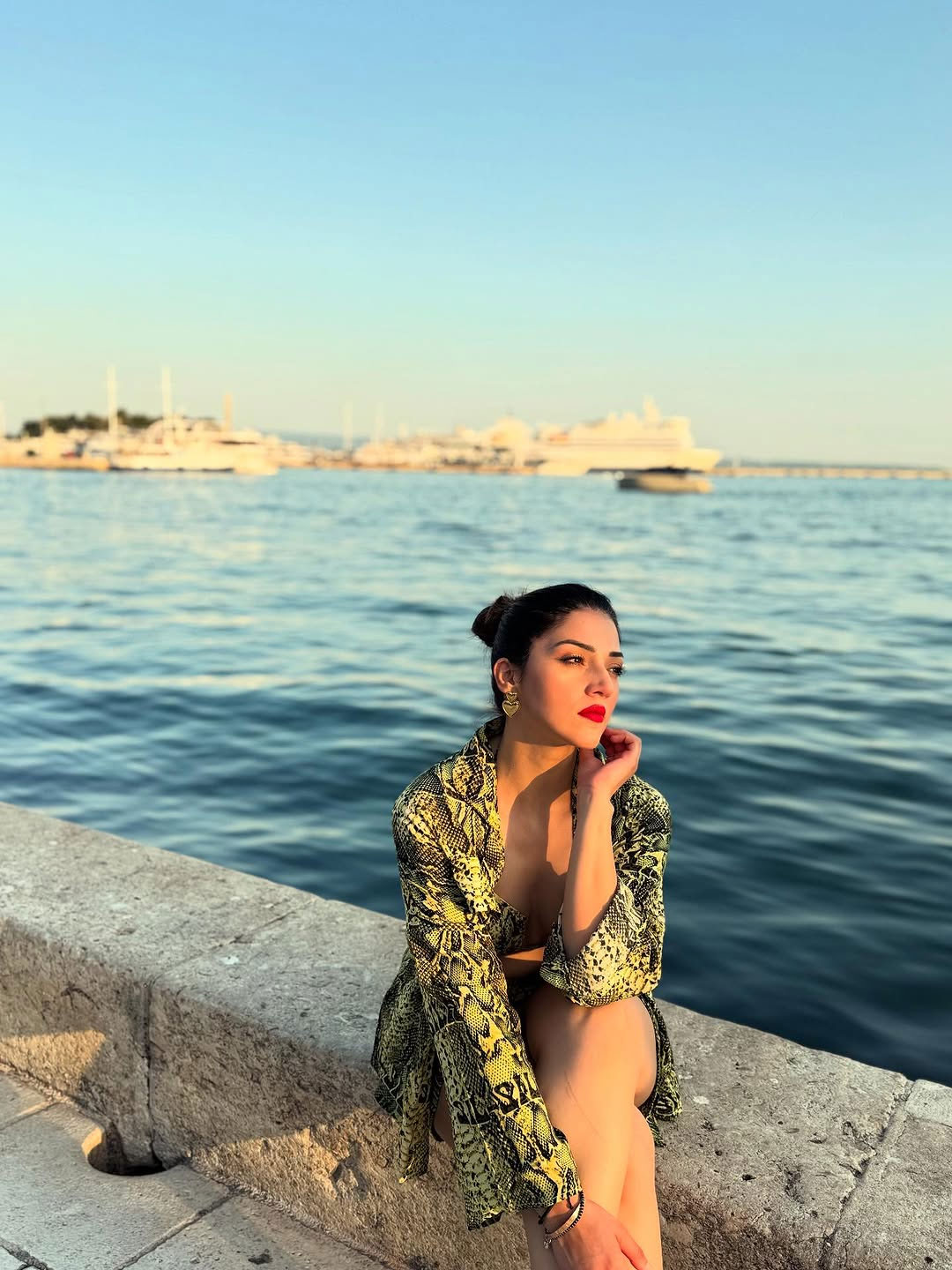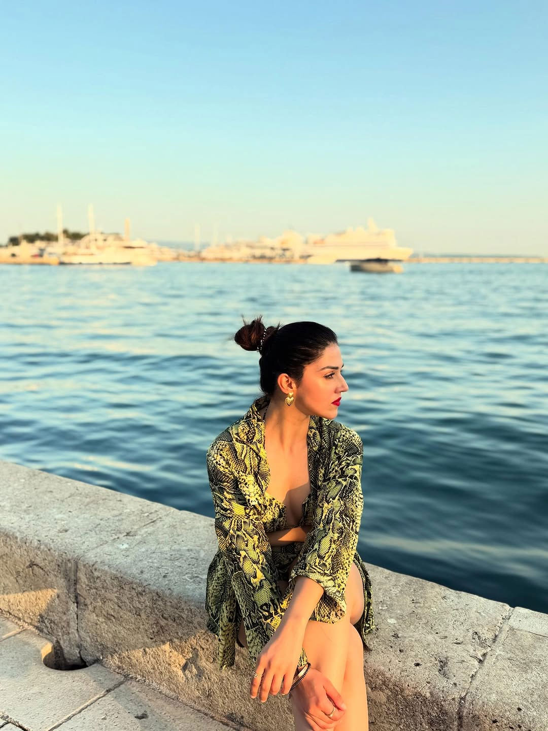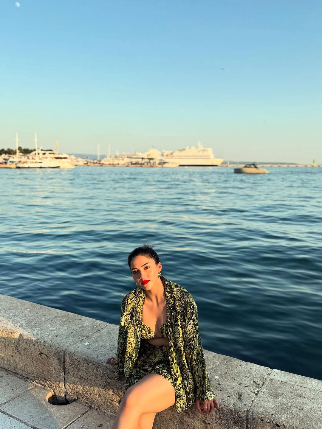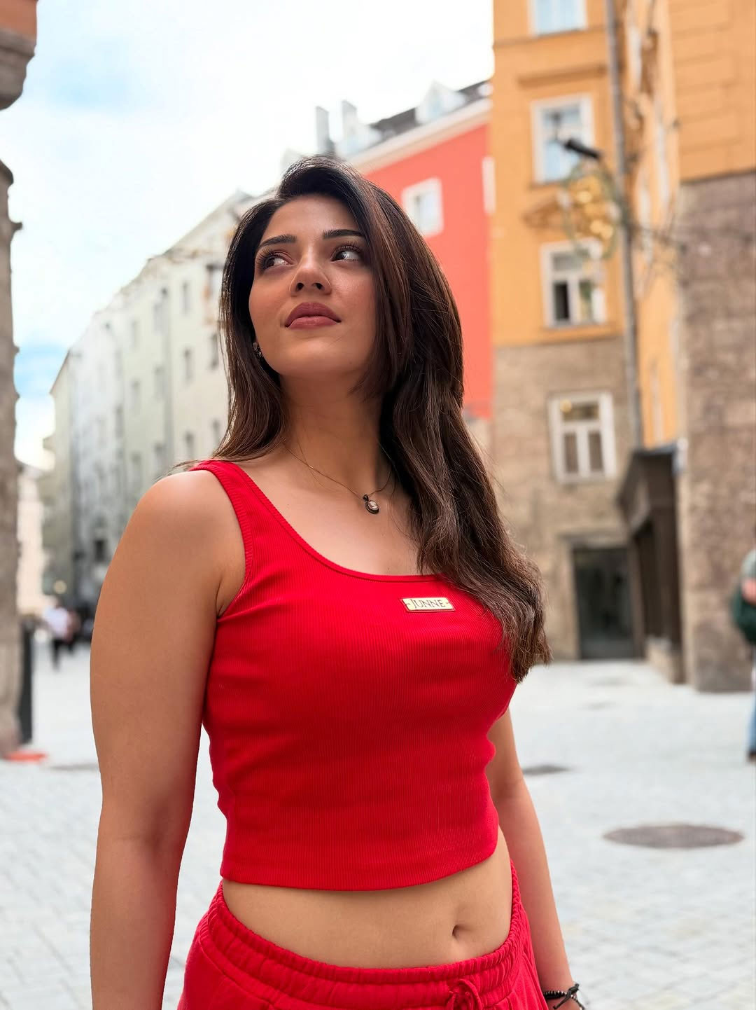 In the photo, Mehreen is seen standing outdoors in a stylish dress. She is wearing a black full-sleeve crop top paired with a grey skirt. She also carries a small red handbag that matches well with her look.