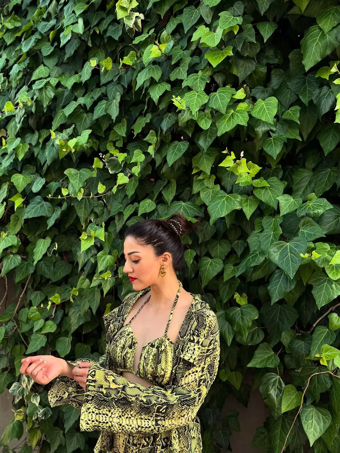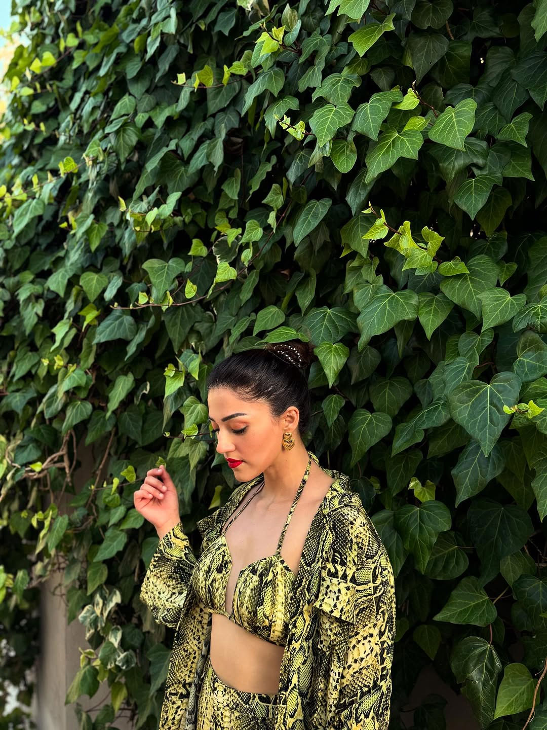She is seen in a snake-print co-ord and sporting a sleek top knot with red lipstick looking classy. The photo glows with a warm filter matching the summer caption and her chilled-out mood. Overall her all the style has given a picture you’ll keep staring at.