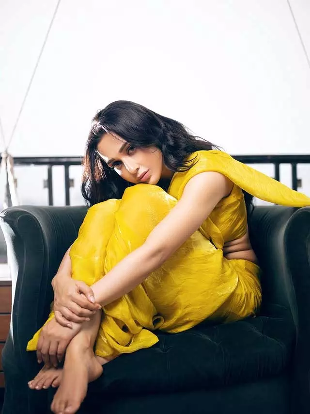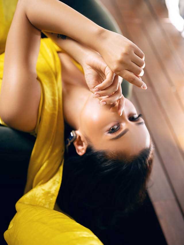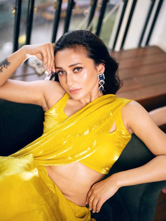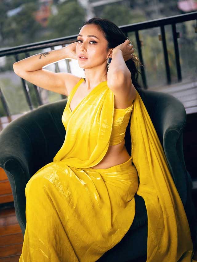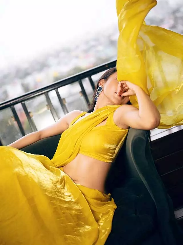 Mimi Chakraborty looks completely at ease in her latest photo shared on a popular news gallery. She is dressed in a bright yellow ensemble. Mimi is seen relaxing on a couch with her eyes closed and one arm resting over her head. Her blue earrings and visible tattoo add personal touches to the frame.