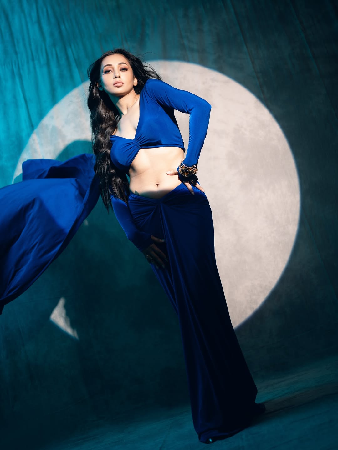 Mimi Chakraborty has recently shared a picture on Instagram capturing everyone's attention with her bold and elegant look. In the photo, she is wearing a striking blue dress that emphasizes her figure, paired with loose, flowing fabric. With her confident pose and serene expression, Mimi truly captivates her audience, effortlessly blending grace and strength.