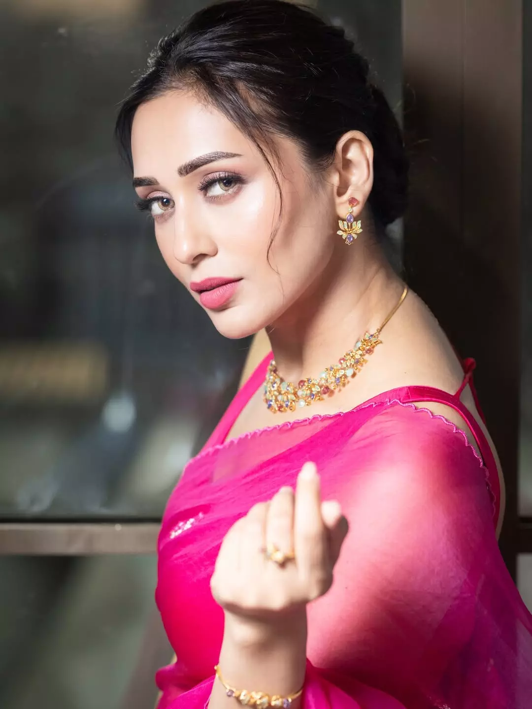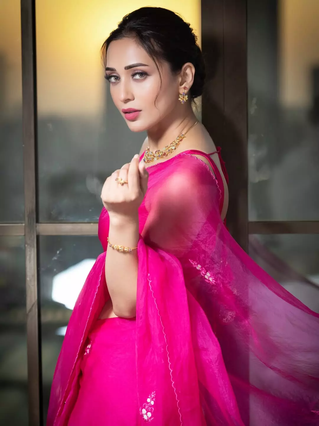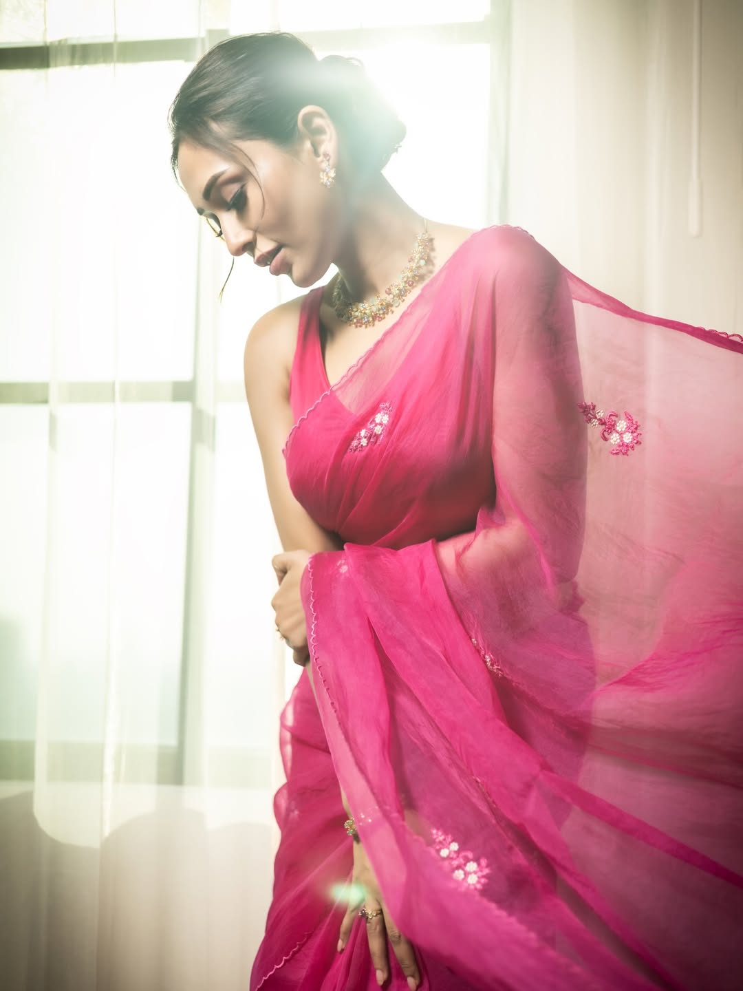 In this ethereal photoshoot, Mimi Chakraborty looks radiant and dreamy in a vibrant hot pink saree that flows gracefully with the breeze. The soft natural light creates a beautiful halo effect around her, highlighting her elegant neckline, delicate jewellery, and serene expression.