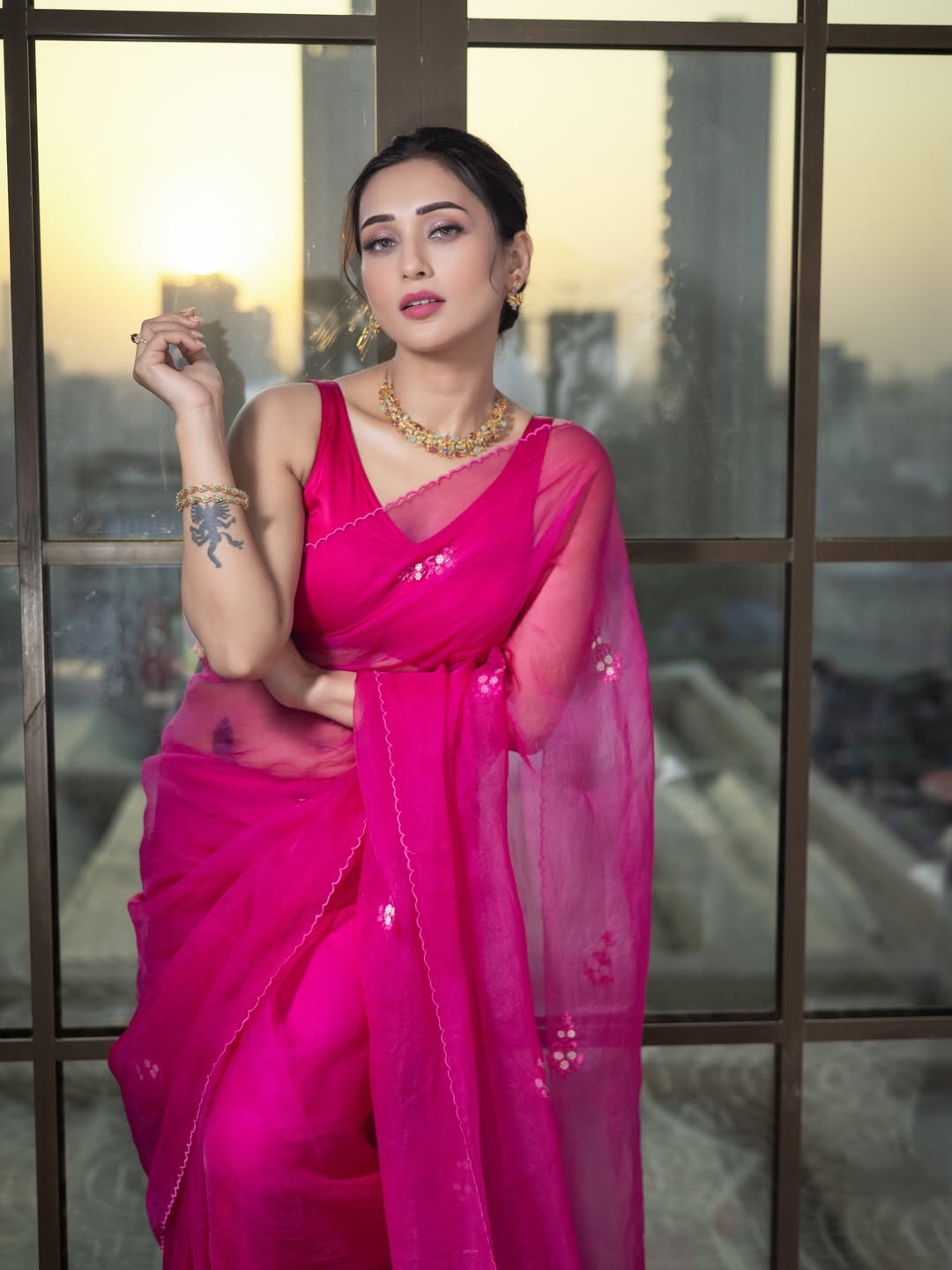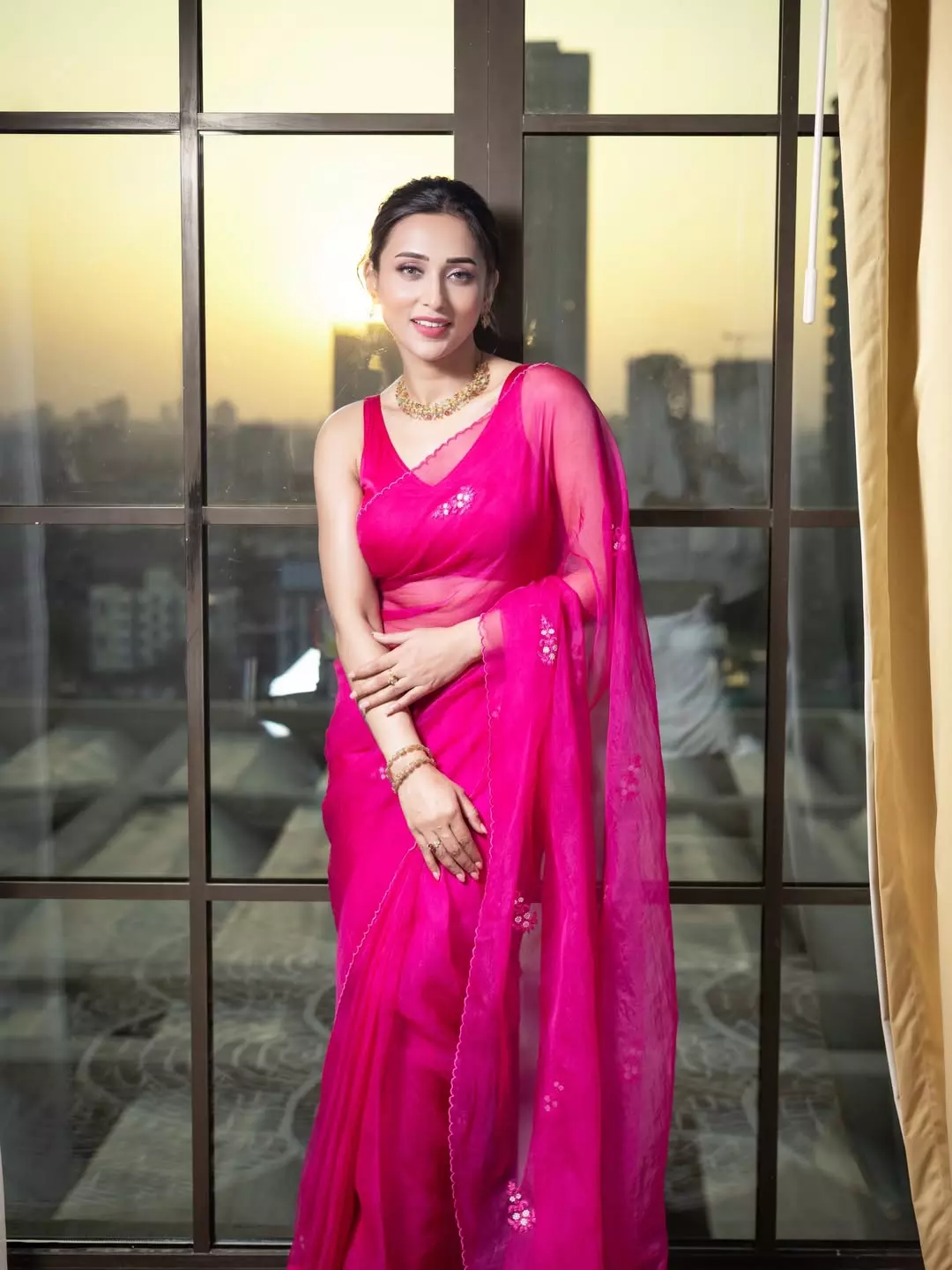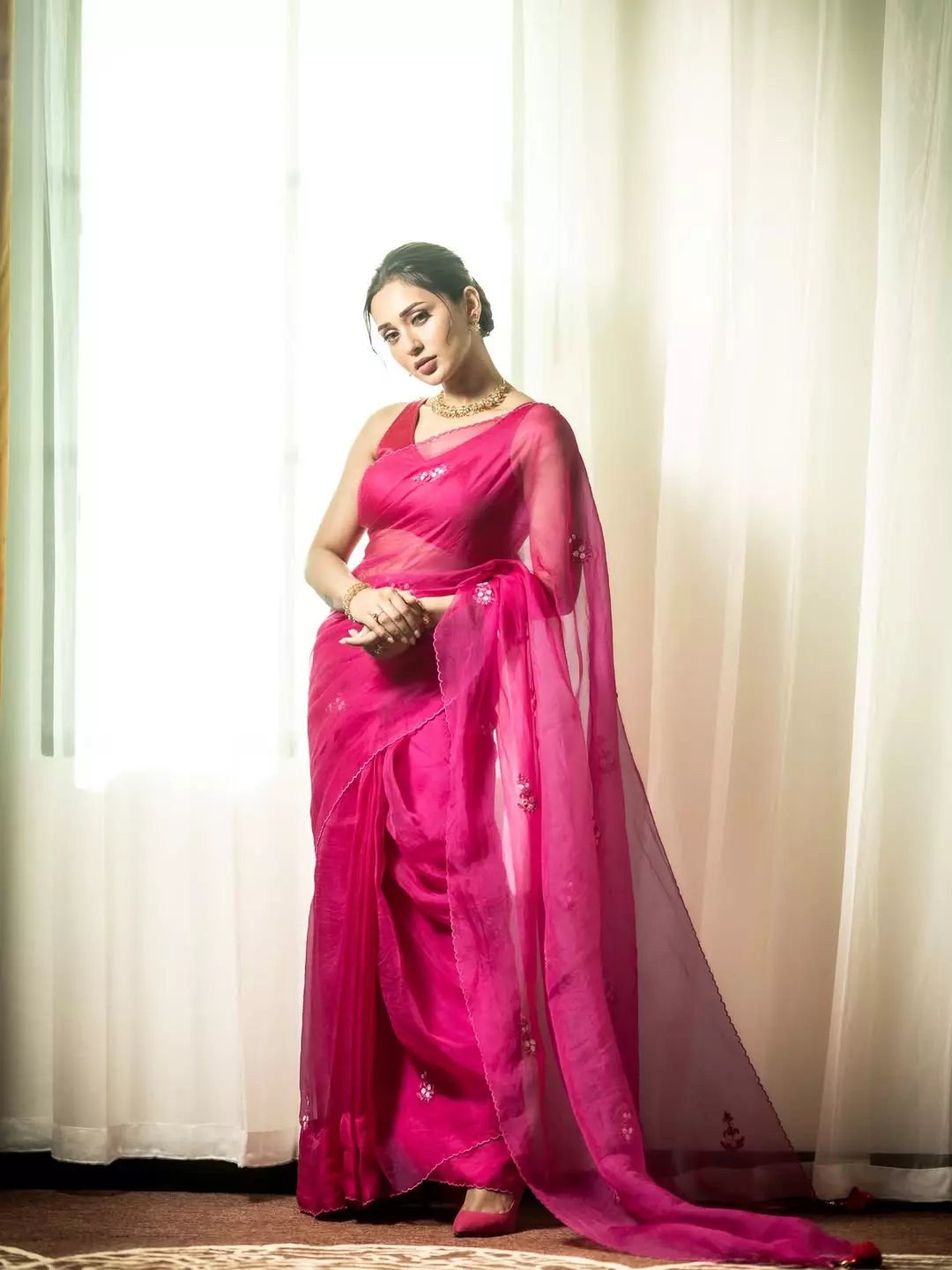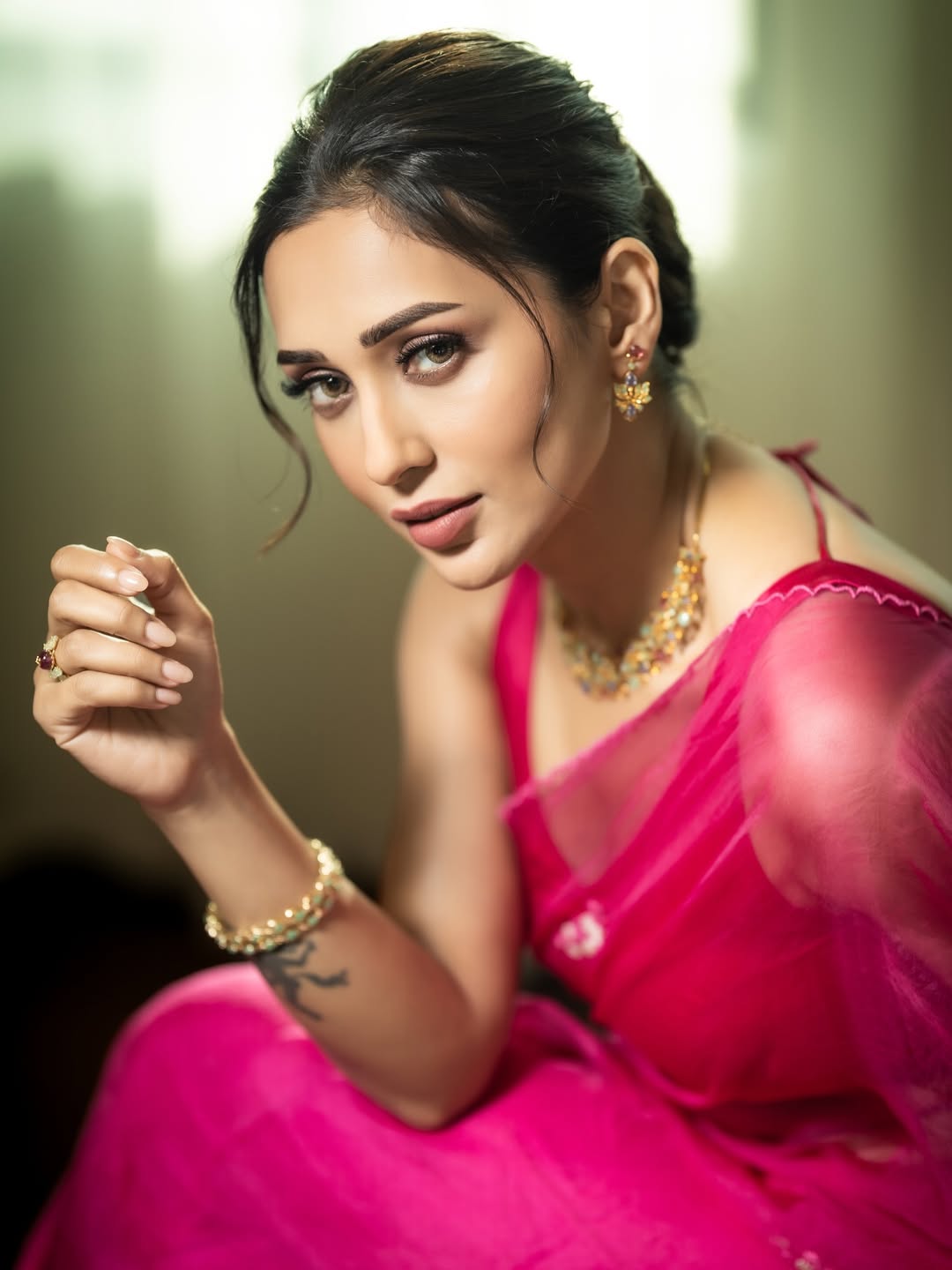 In this ethereal photoshoot, Mimi Chakraborty looks radiant and dreamy in a vibrant hot pink saree that flows gracefully with the breeze. The soft natural light creates a beautiful halo effect around her, highlighting her elegant neckline, delicate jewellery, and serene expression.