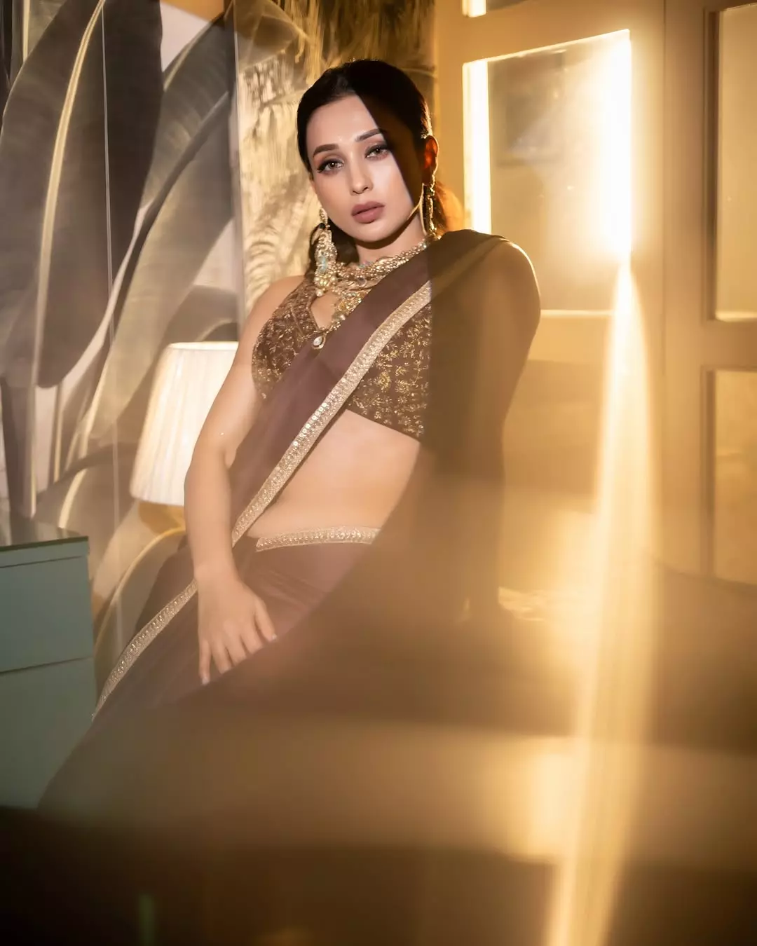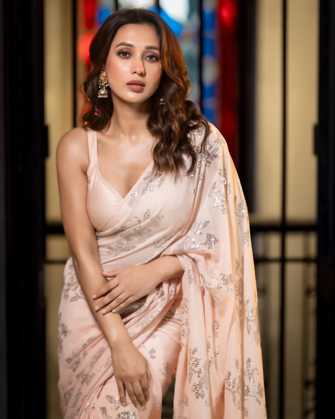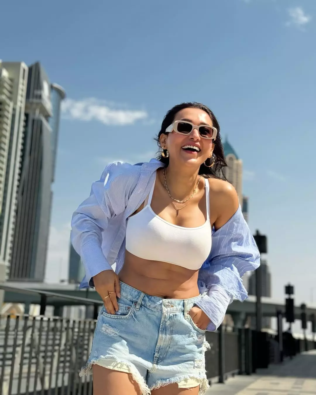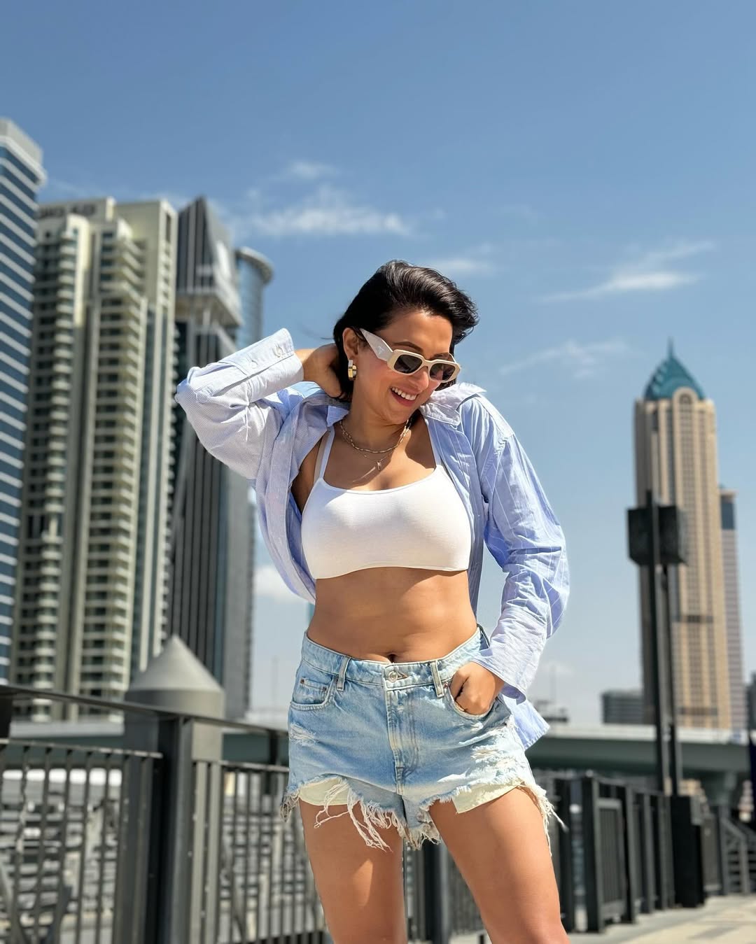 Mimi Chakraborty owns the frame with her signature blend of bold and breezy. Rocking a fitted chocolate-brown top tucked into a high-waisted grey plaid mini skirt with an asymmetric wrap detail, she strikes a cool, confident pose against a weathered wall. Oversized sunglasses, tousled waves, a tiny palm-tree tattoo peeking from her arm, and sky-high nude stilettos elevate the look from street-style chic to pure fire. One hand on her hip, the other casually behind her head, Mimi serves unapologetic attitude and legs-for-days glamour that only the Tollywood queen-turned-MP can pull off so effortlessly.