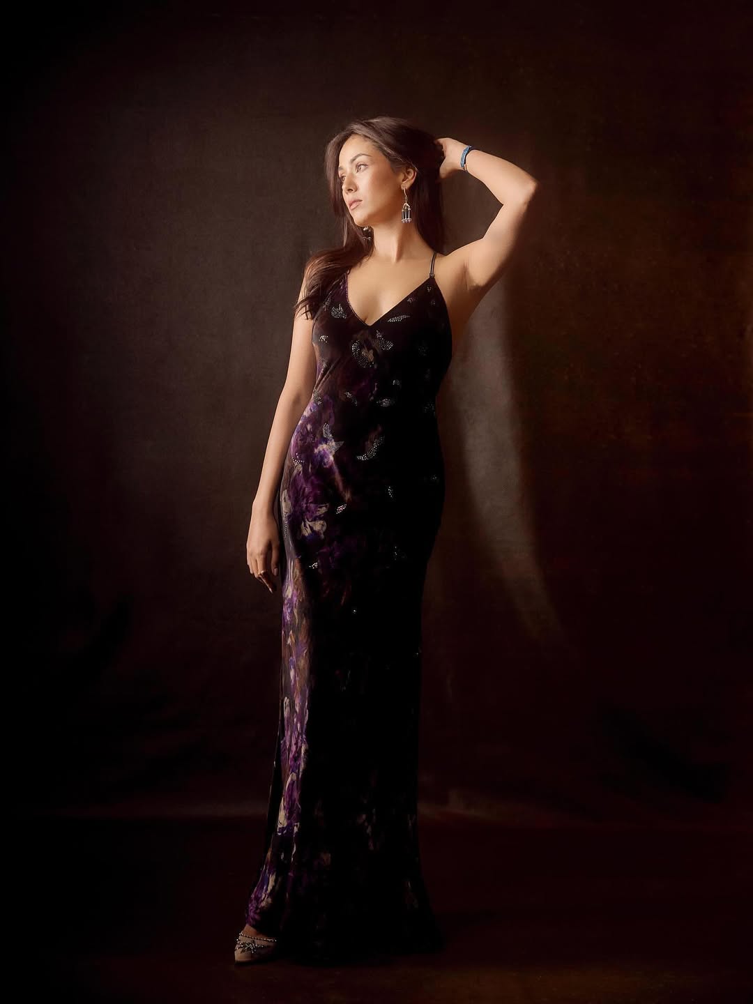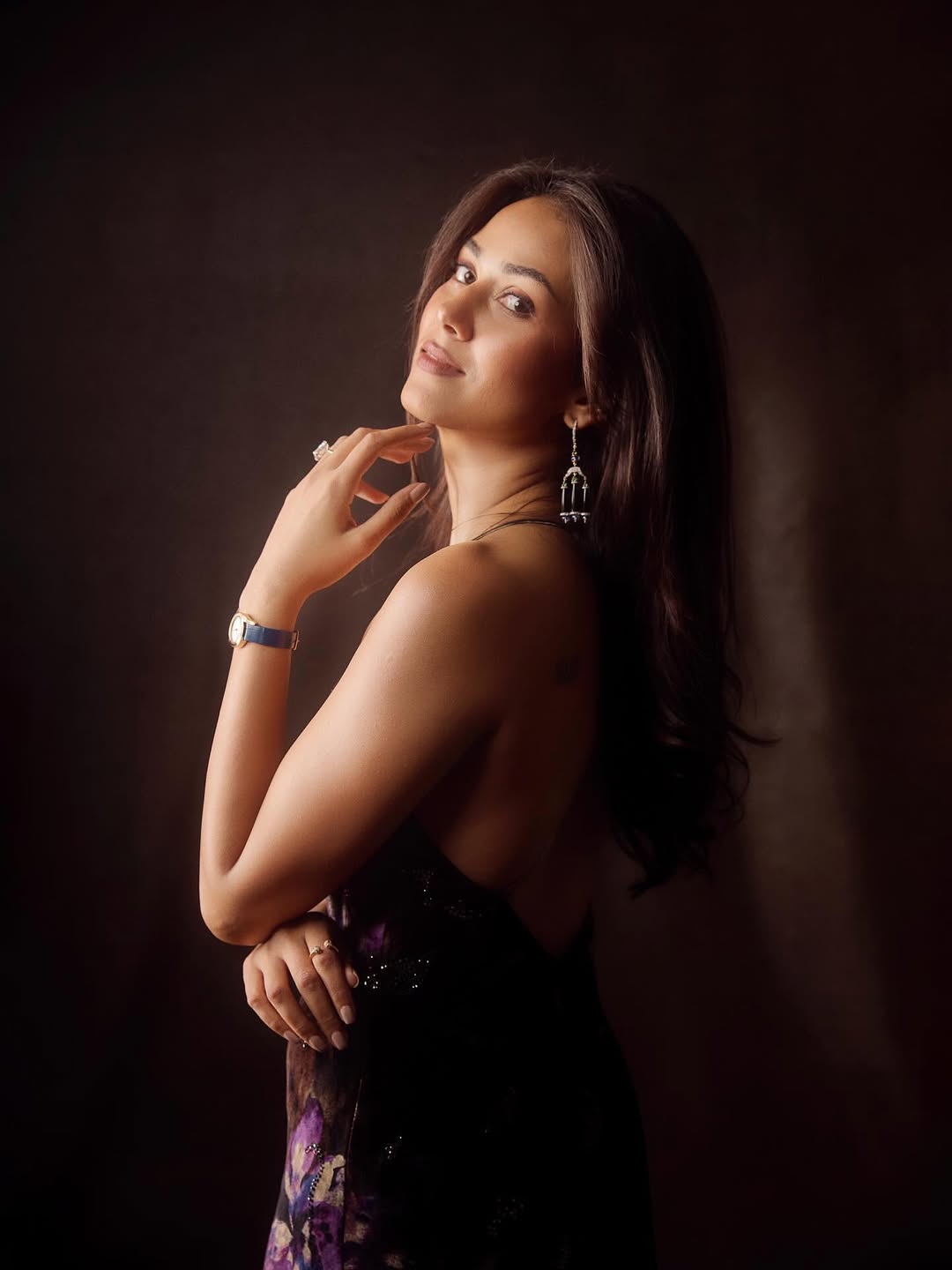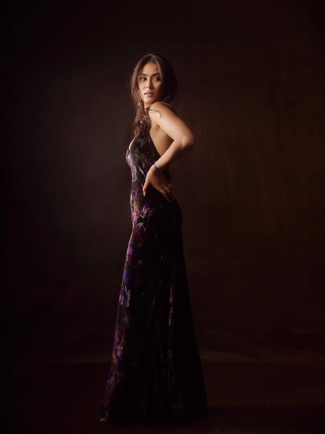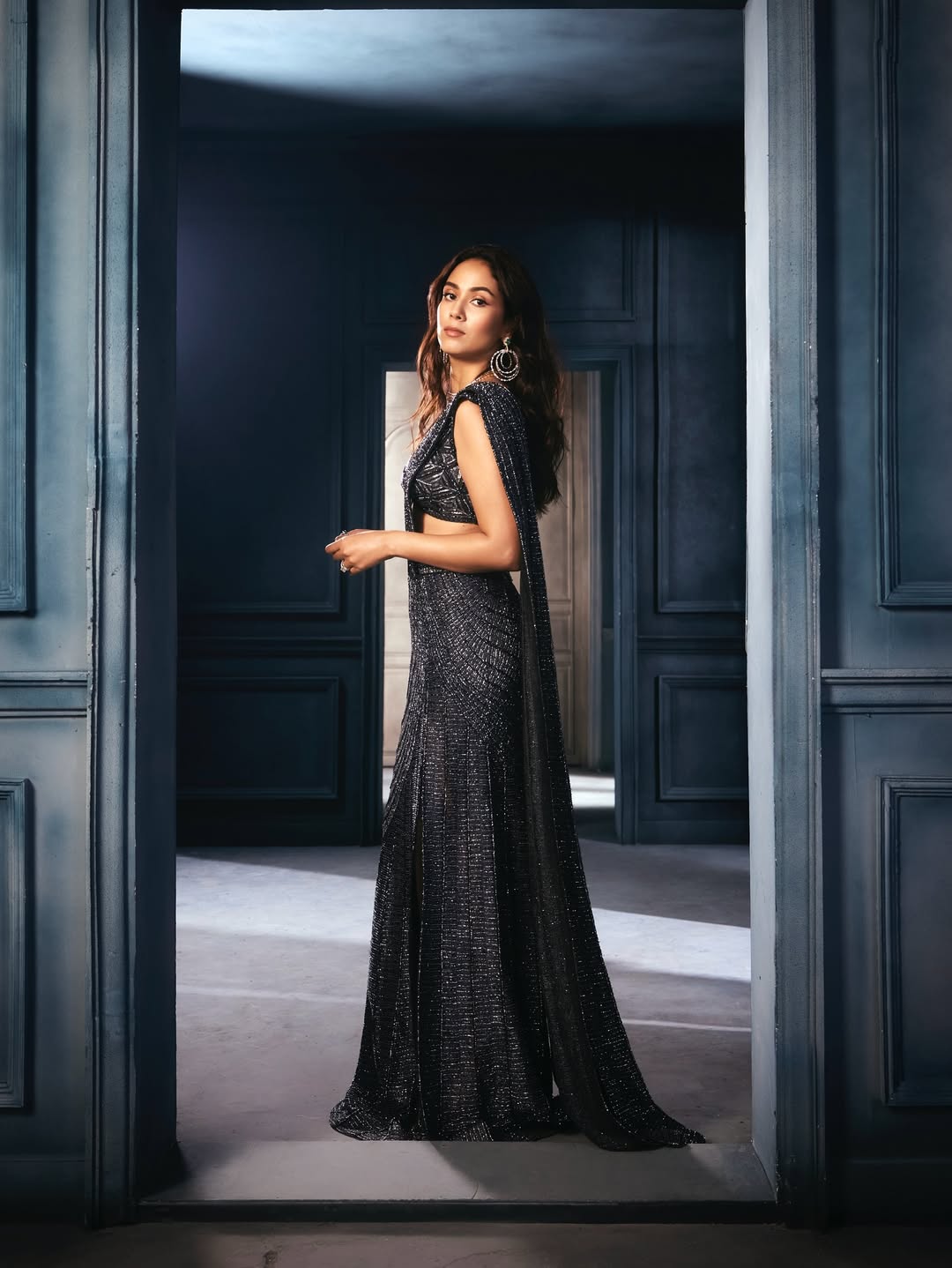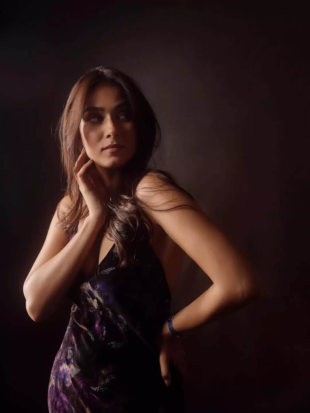 The picture shows Mira in a dark background. The dress has shades of purple and black. Her style looks elegant and calm. She stands with a simple pose. The image highlights her fashion sense.