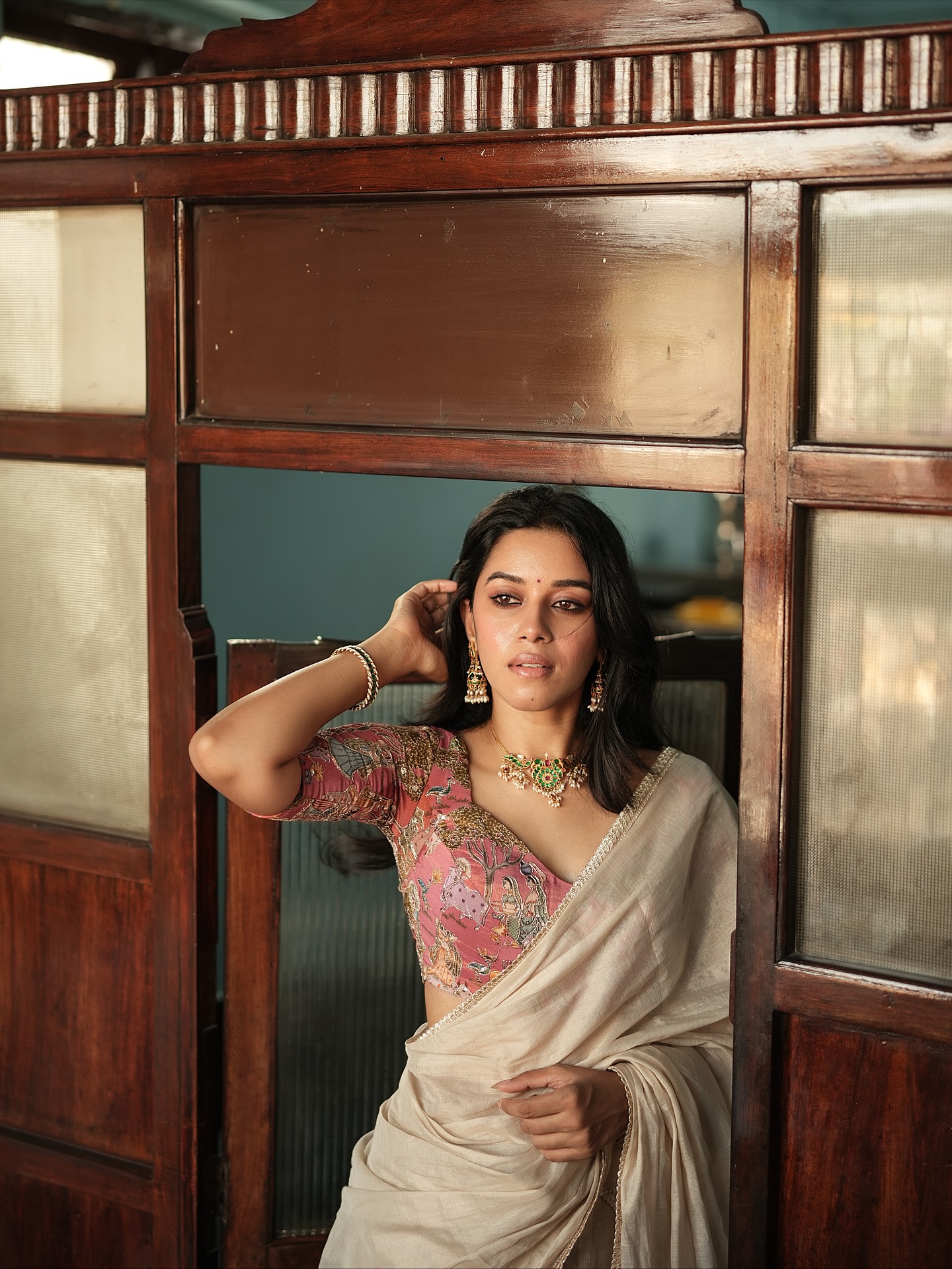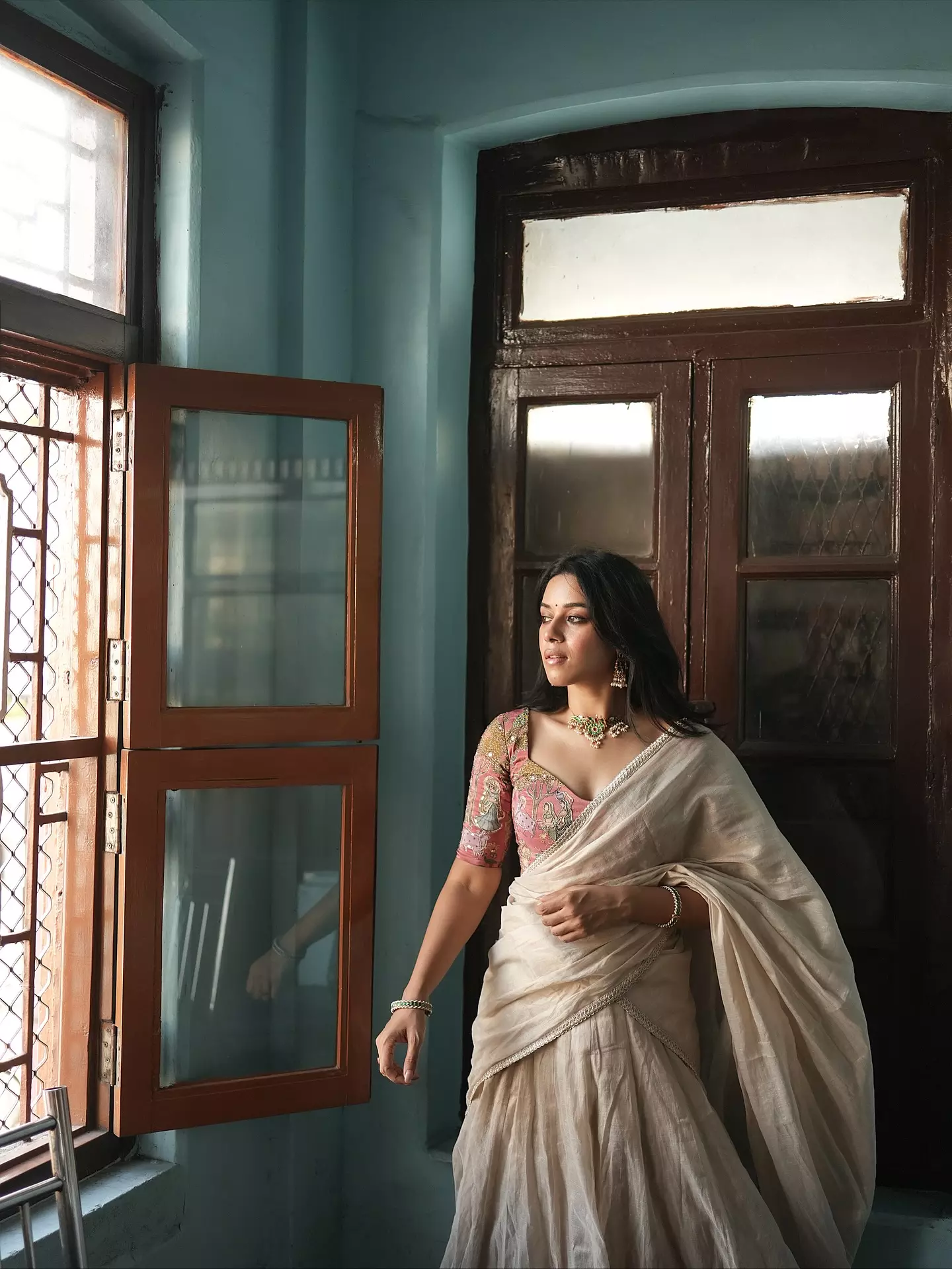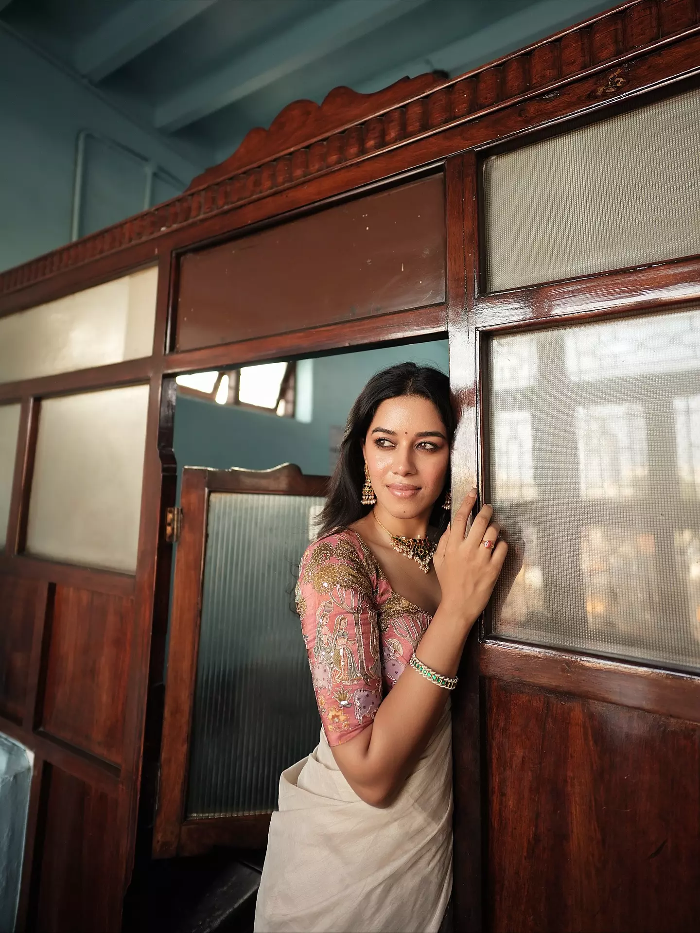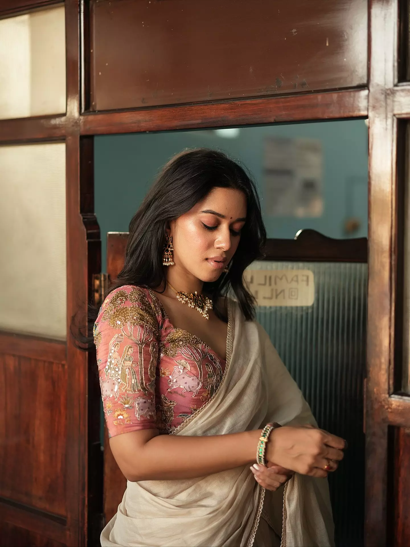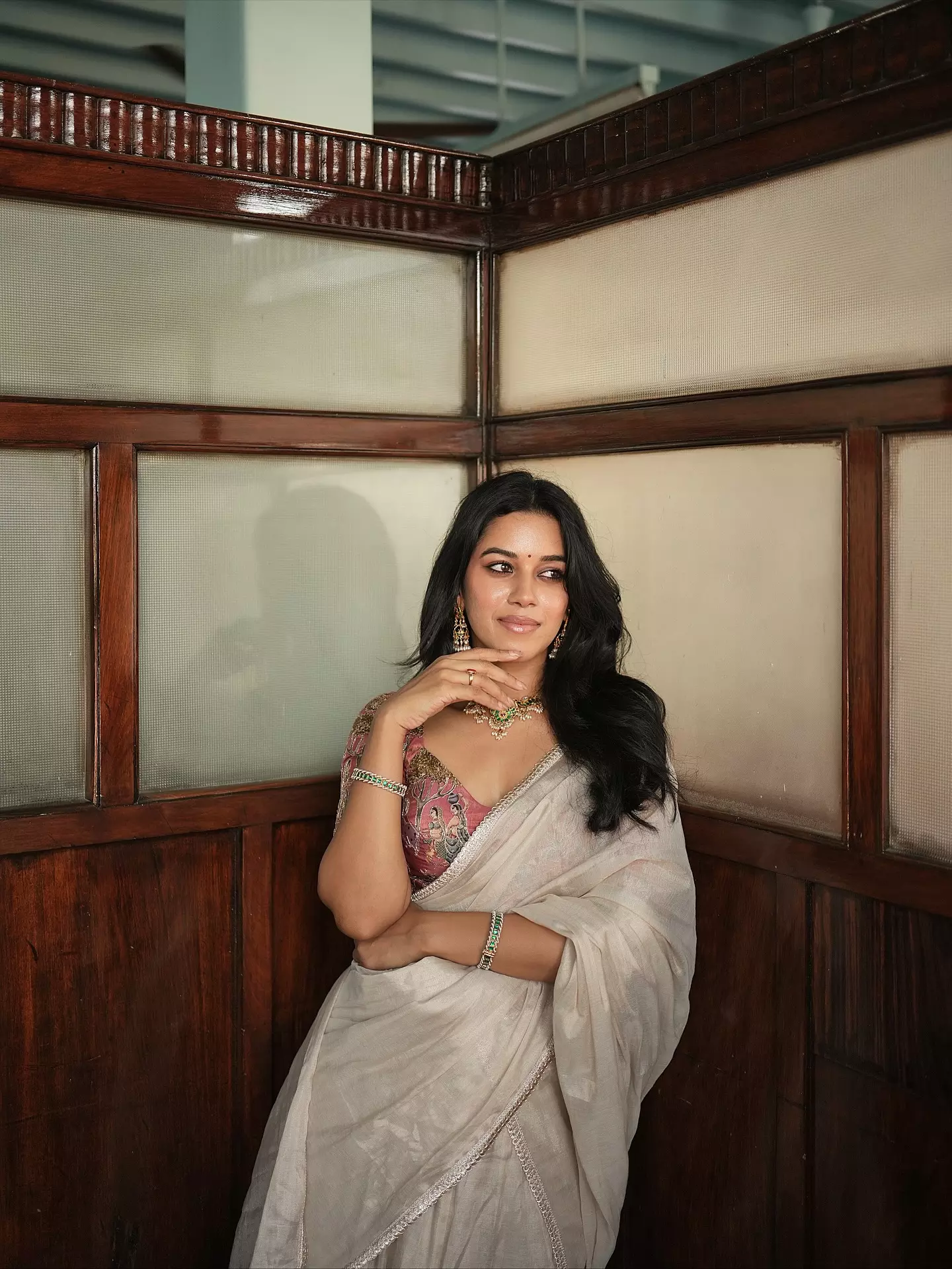 Actress Mirnalini Ravi embodies elegance and sophistication in her latest traditional look. Draped in a soft ivory saree paired with a vibrant, embroidered blouse, she strikes a perfect balance between classic and contemporary. Her minimal yet striking jewelry and soft glam makeup elevate the entire ensemble, making her a vision of understated beauty.