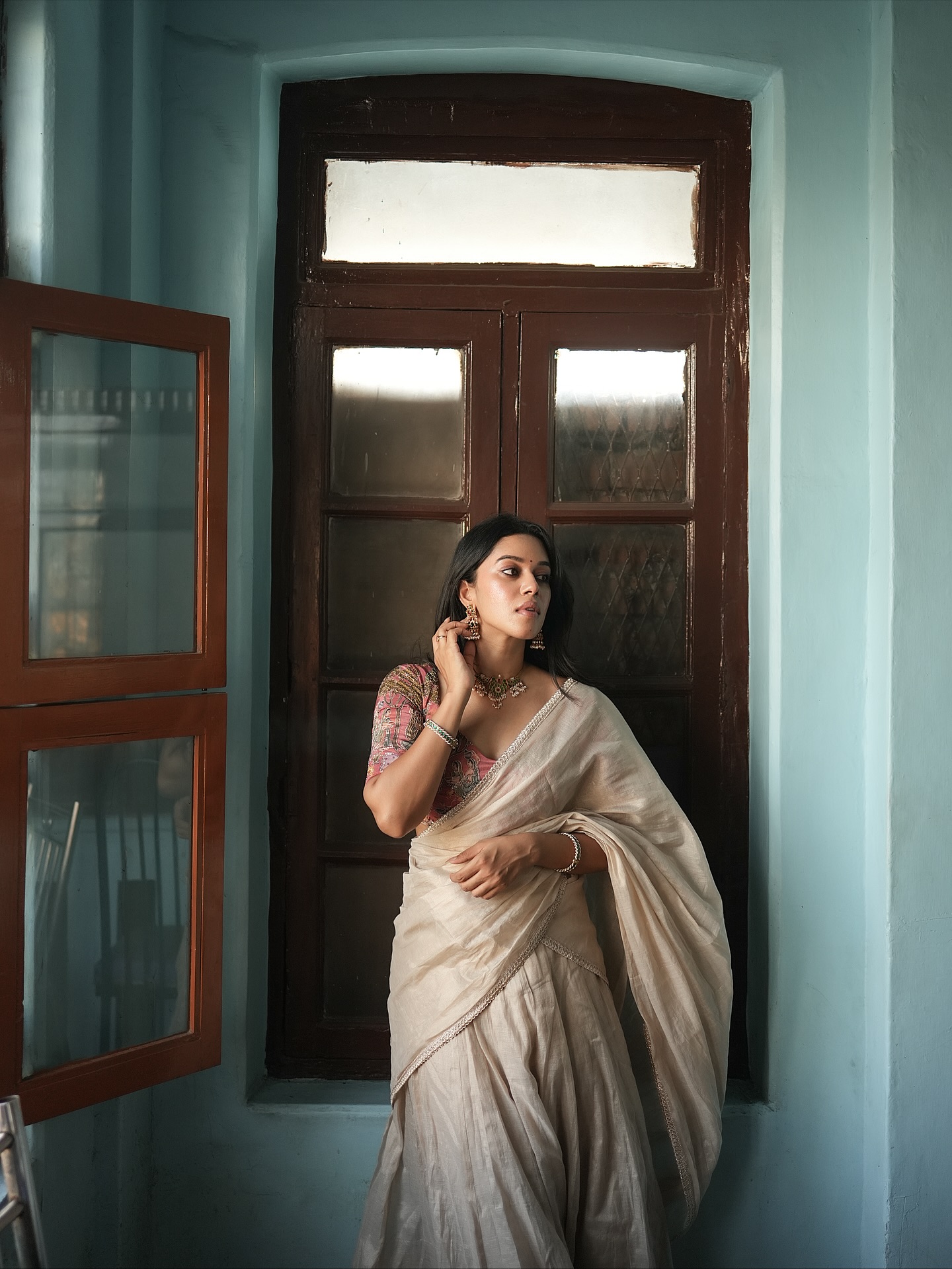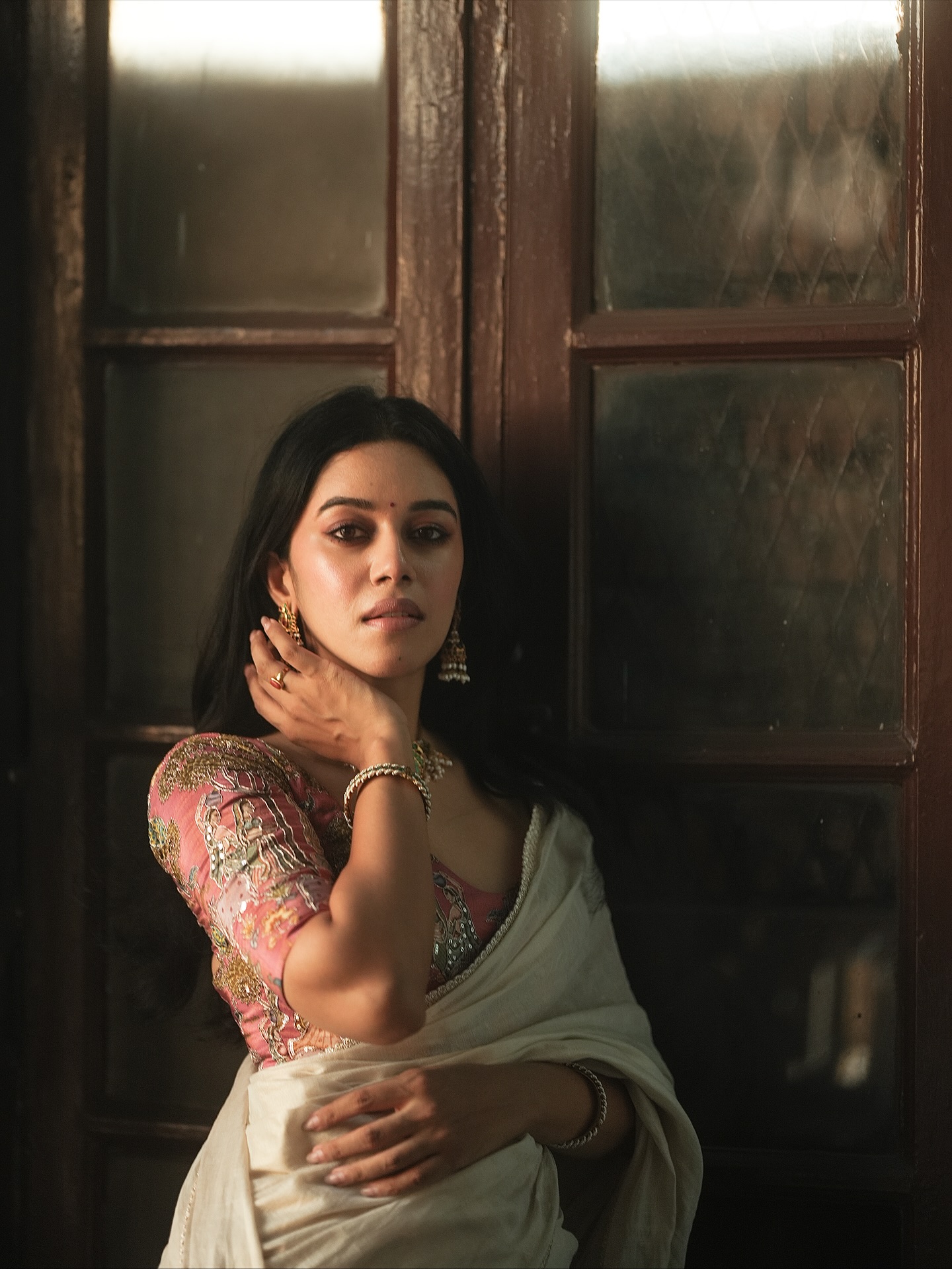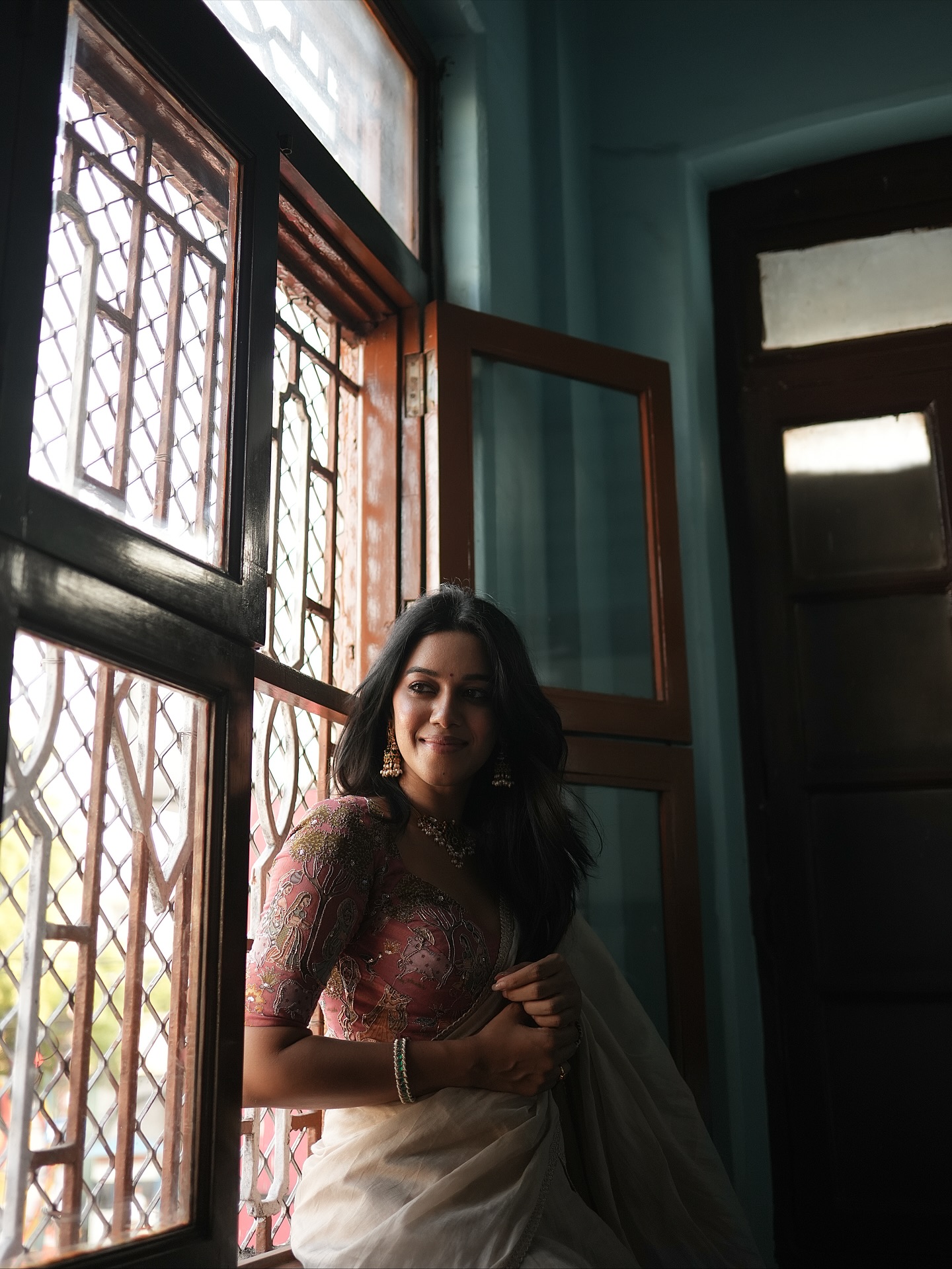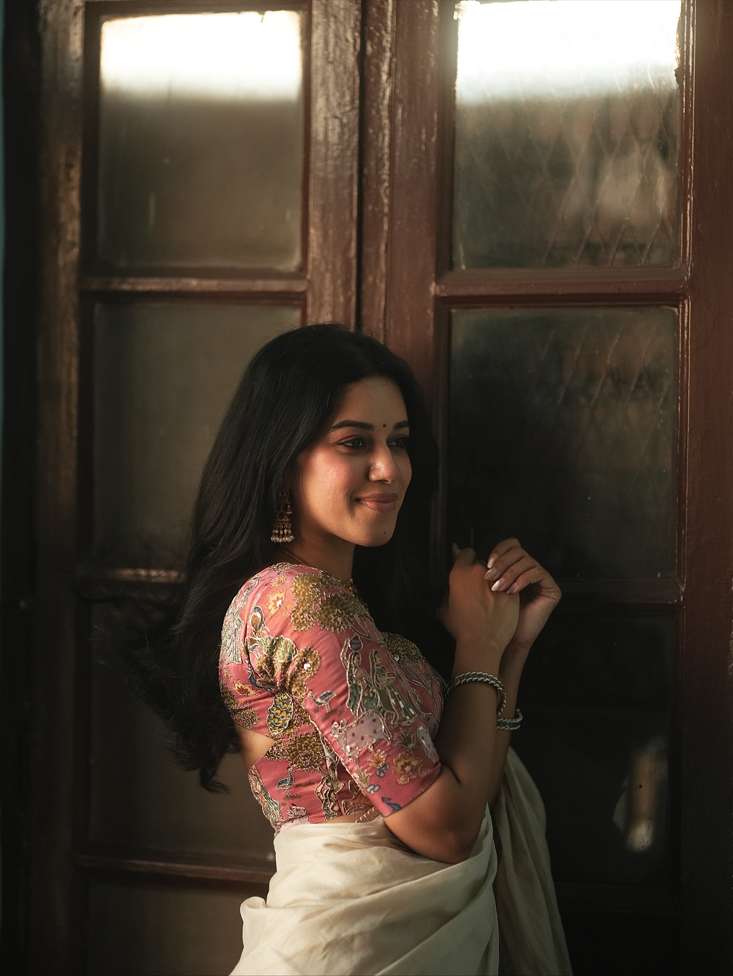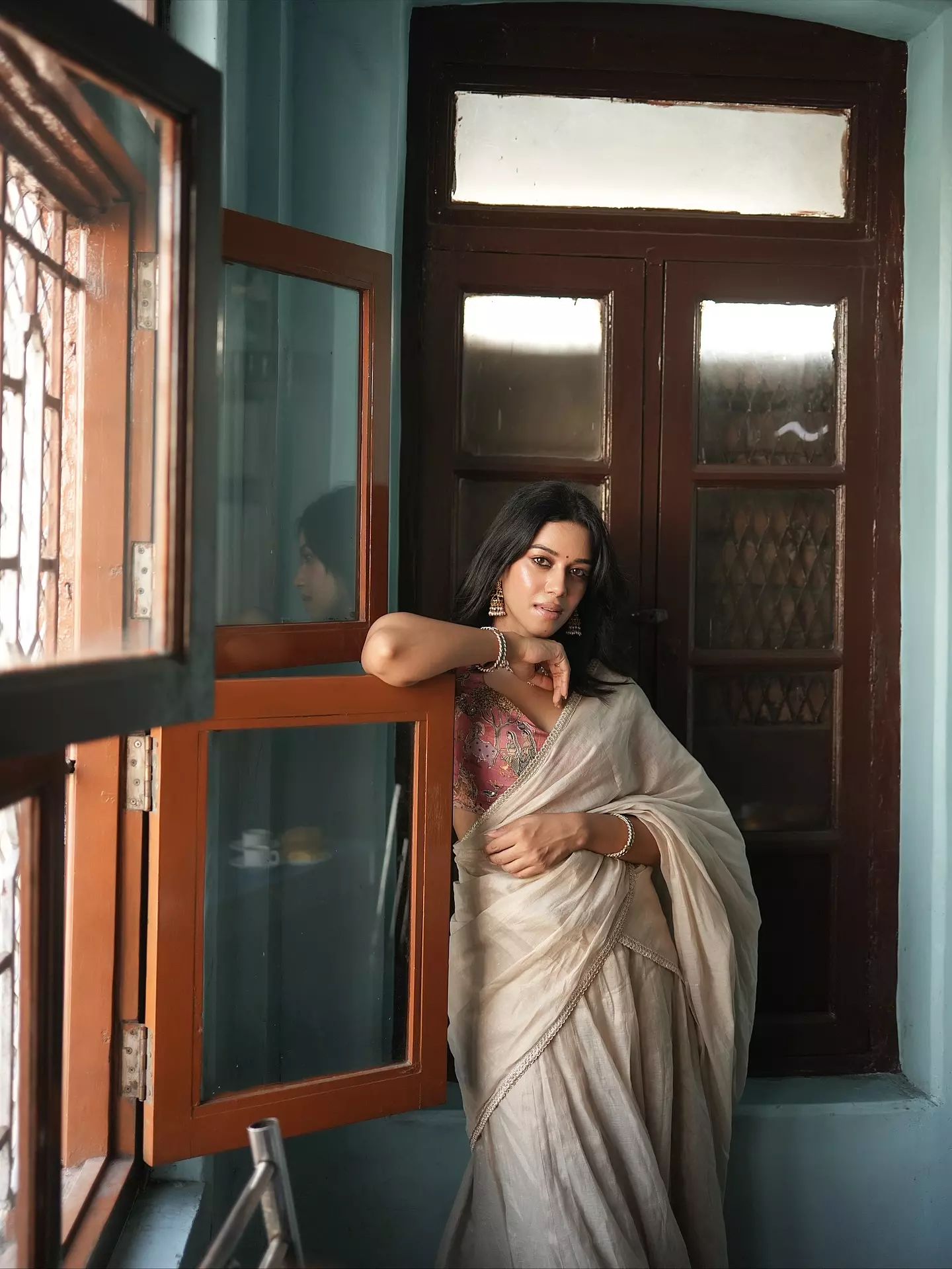 Actress Mirnalini Ravi embodies elegance and sophistication in her latest traditional look. Draped in a soft ivory saree paired with a vibrant, embroidered blouse, she strikes a perfect balance between classic and contemporary. Her minimal yet striking jewelry and soft glam makeup elevate the entire ensemble, making her a vision of understated beauty.