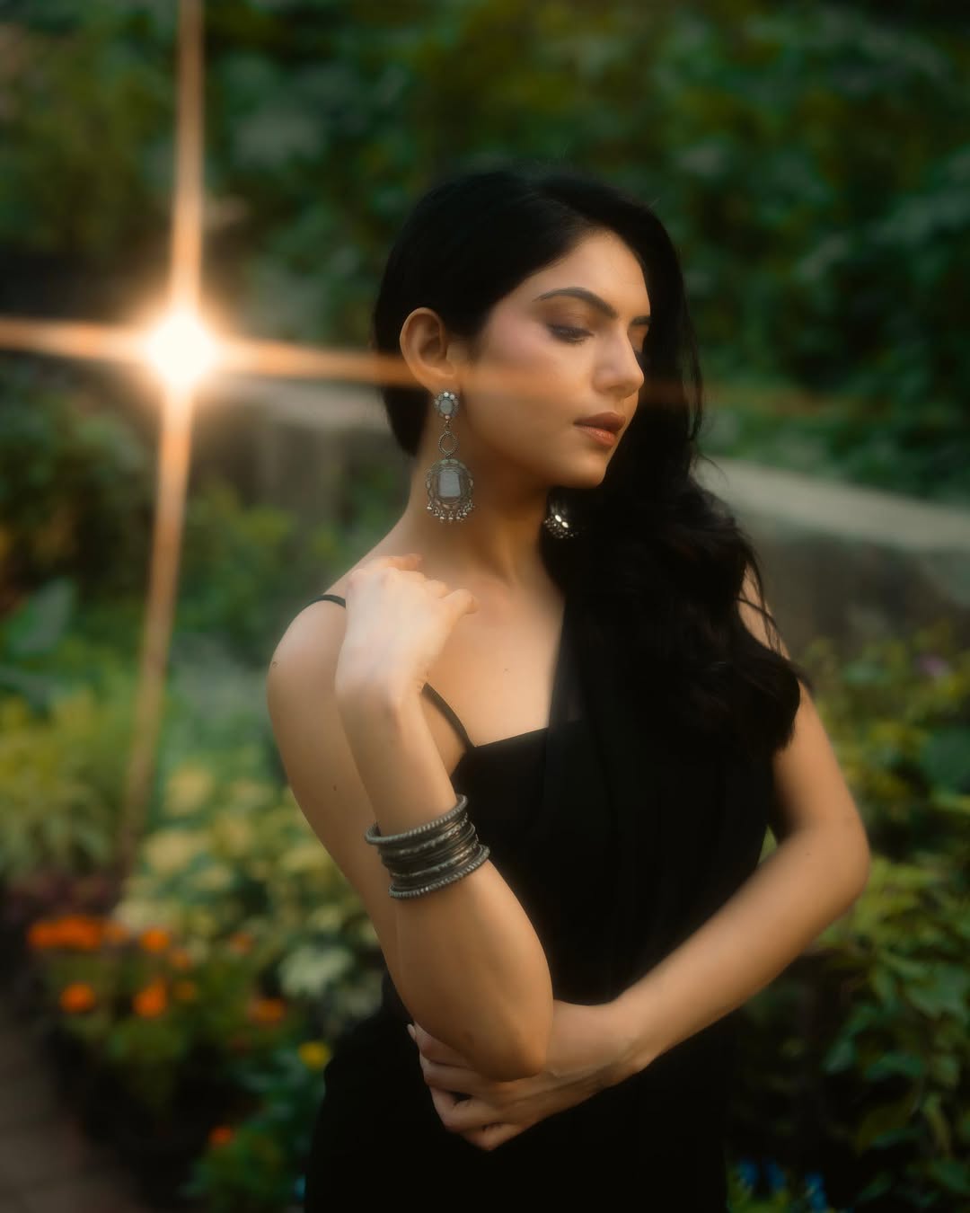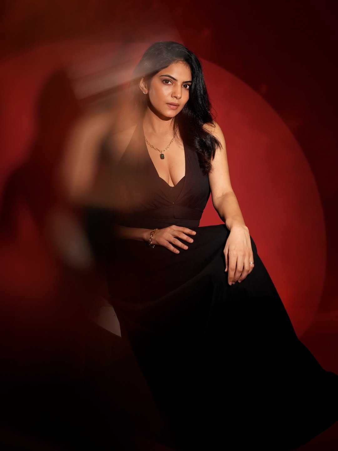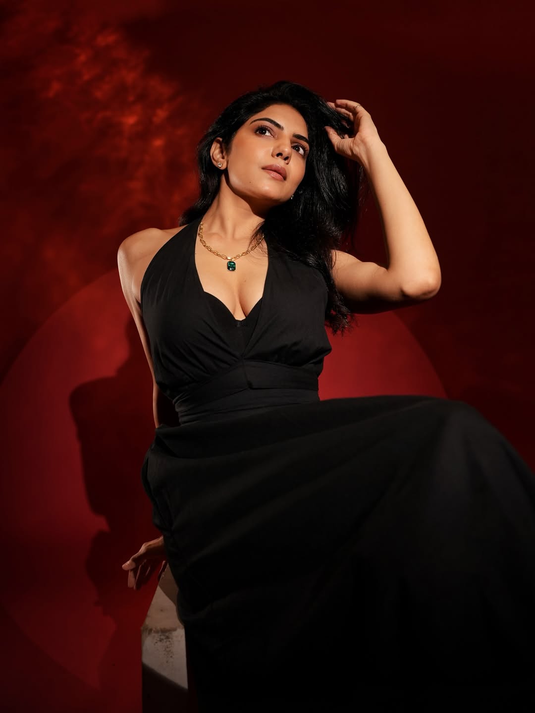 Misha Narang owns the frame in a sultry black halter-neck dress that plunges just enough to turn heads.