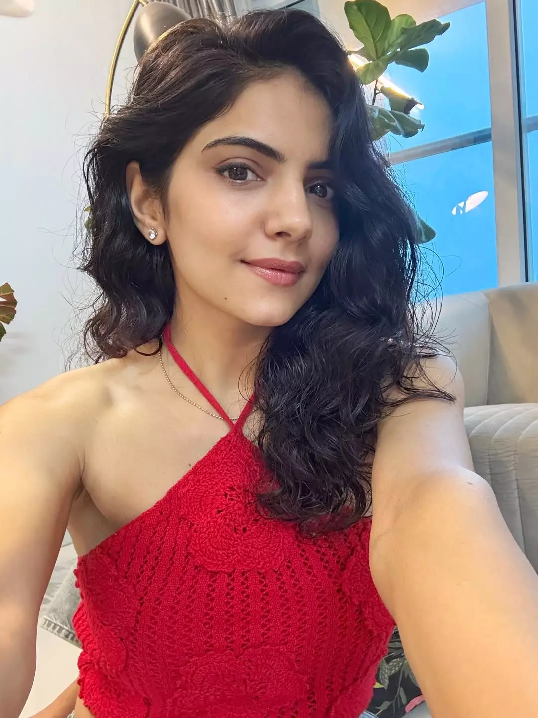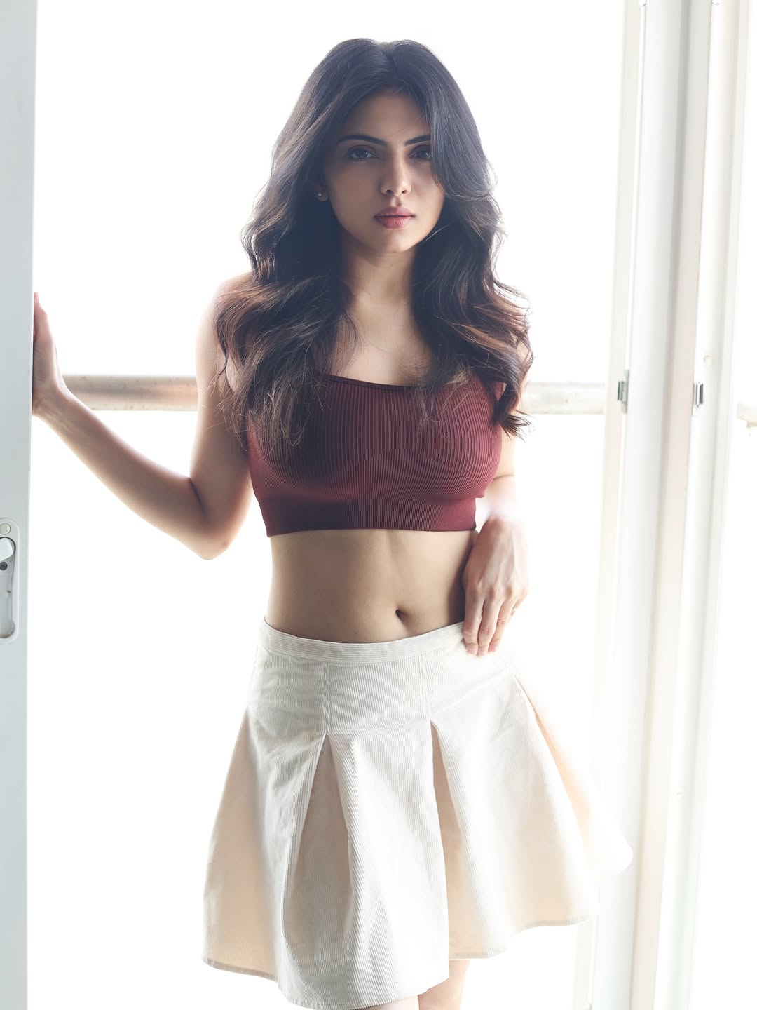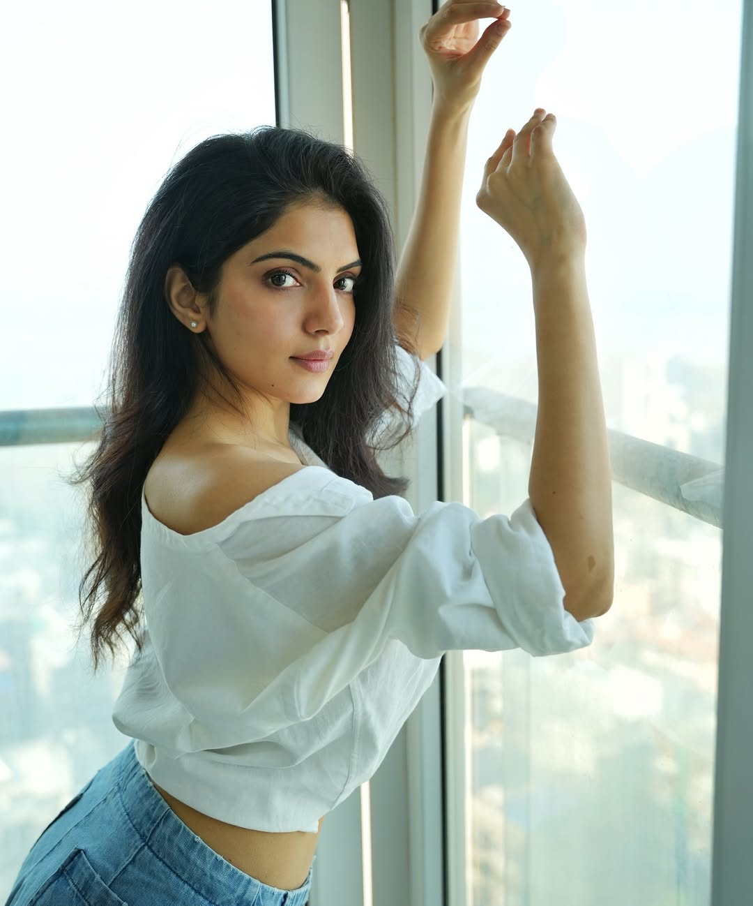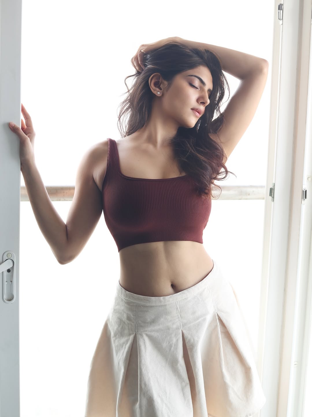 Misha Narang looks serene and stunning in this elegant indoor photoshoot, posing gracefully by the window in a chic maroon ribbed crop top paired with a flowing white pleated skirt. With her long wavy hair cascading down and a soft, closed-eye expression, the actress radiates quiet confidence and natural beauty in 2026.