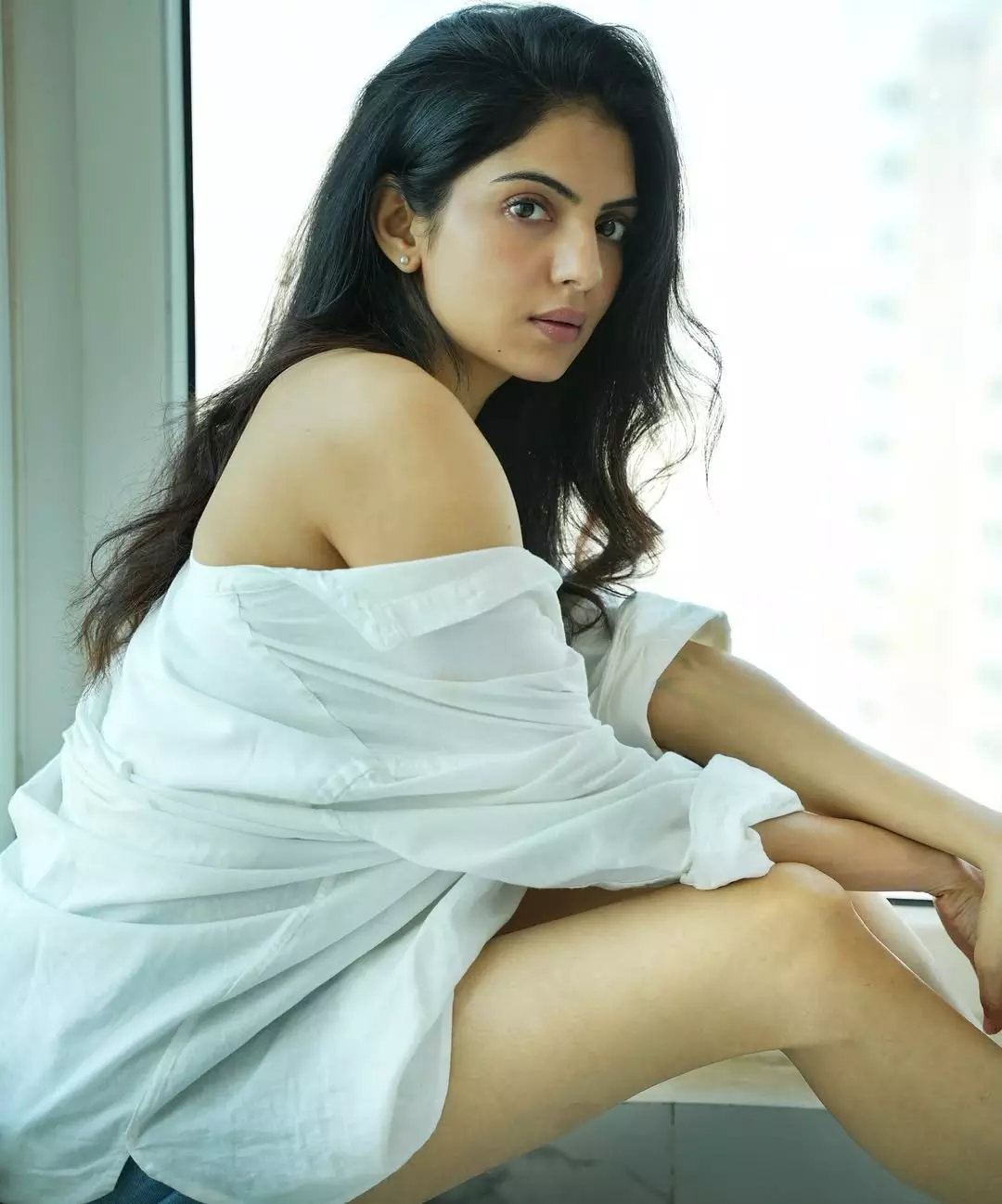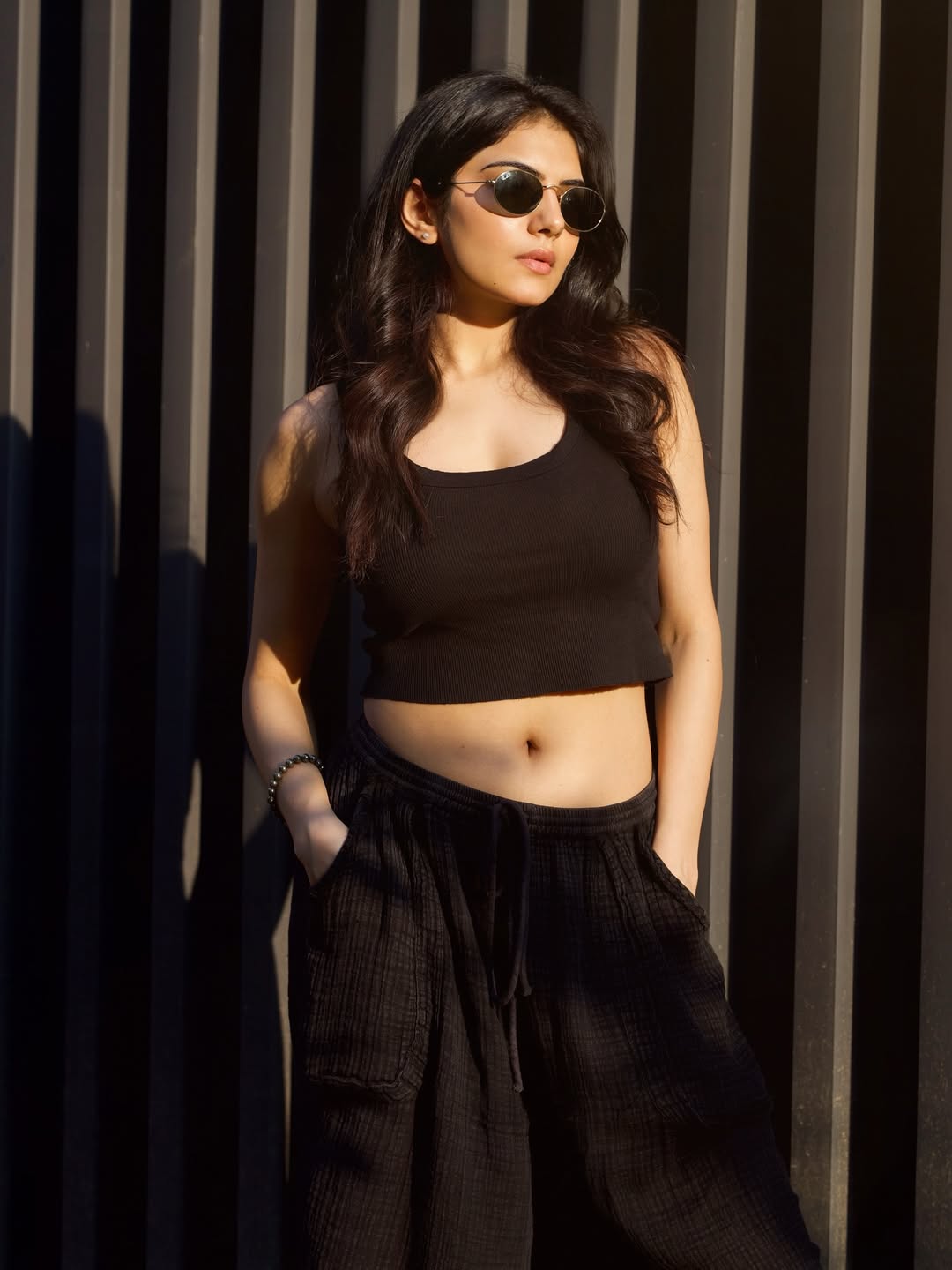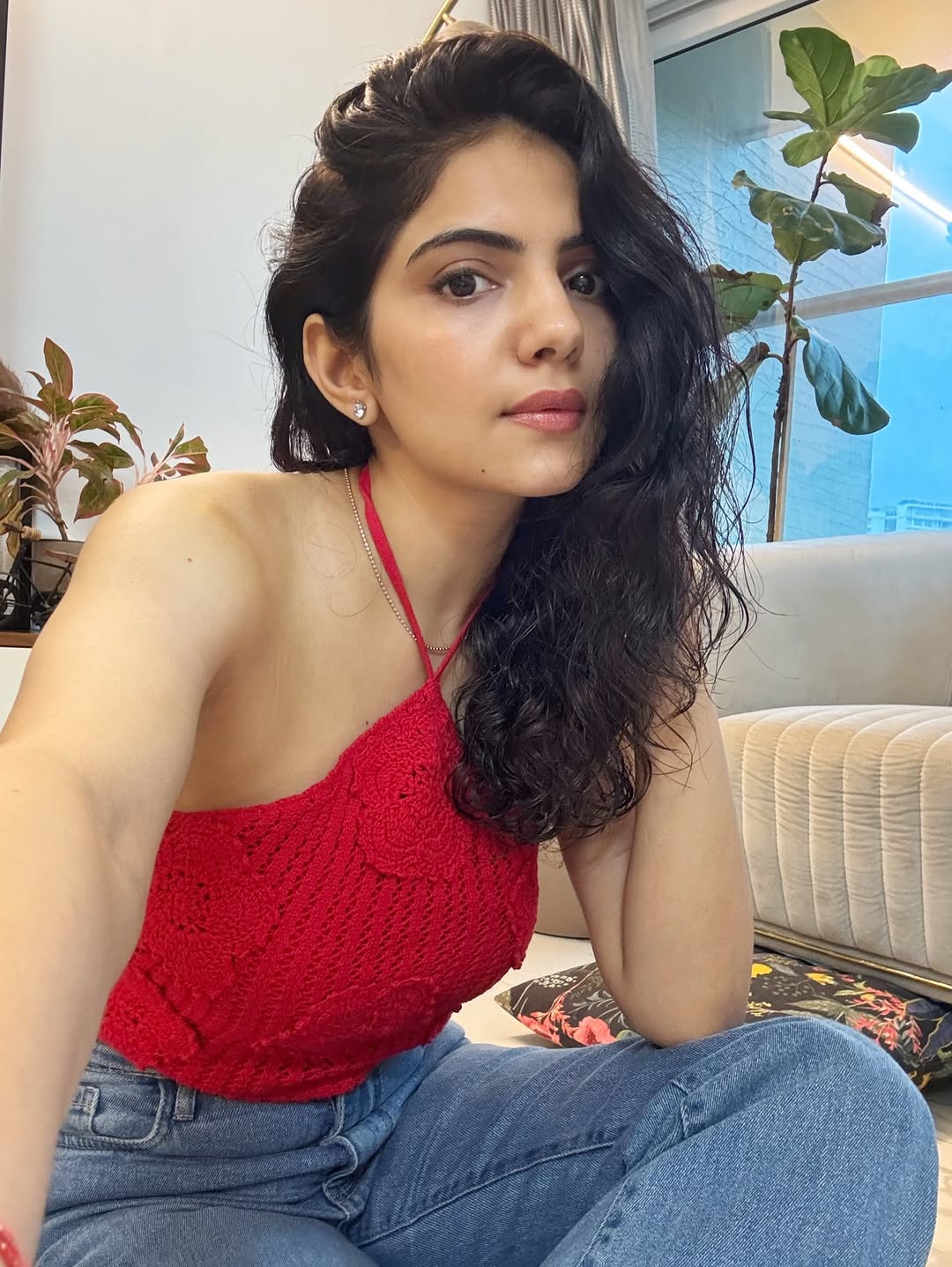 Misha Narang looks serene and stunning in this elegant indoor photoshoot, posing gracefully by the window in a chic maroon ribbed crop top paired with a flowing white pleated skirt. With her long wavy hair cascading down and a soft, closed-eye expression, the actress radiates quiet confidence and natural beauty in 2026.