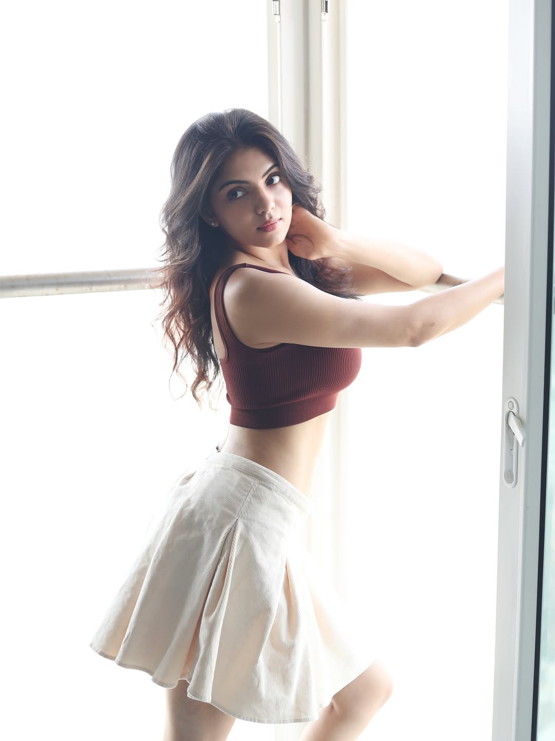 She paired a sleek brown crop top with a white A-line flared skirt featuring subtle vertical ribbing, striking the perfect balance between playful charm and sophisticated polish. The vertical texture adds movement and visual interest, while the outfit as a whole highlights her graceful silhouette—making it ideal for both casual outings and stylish photoshoots.