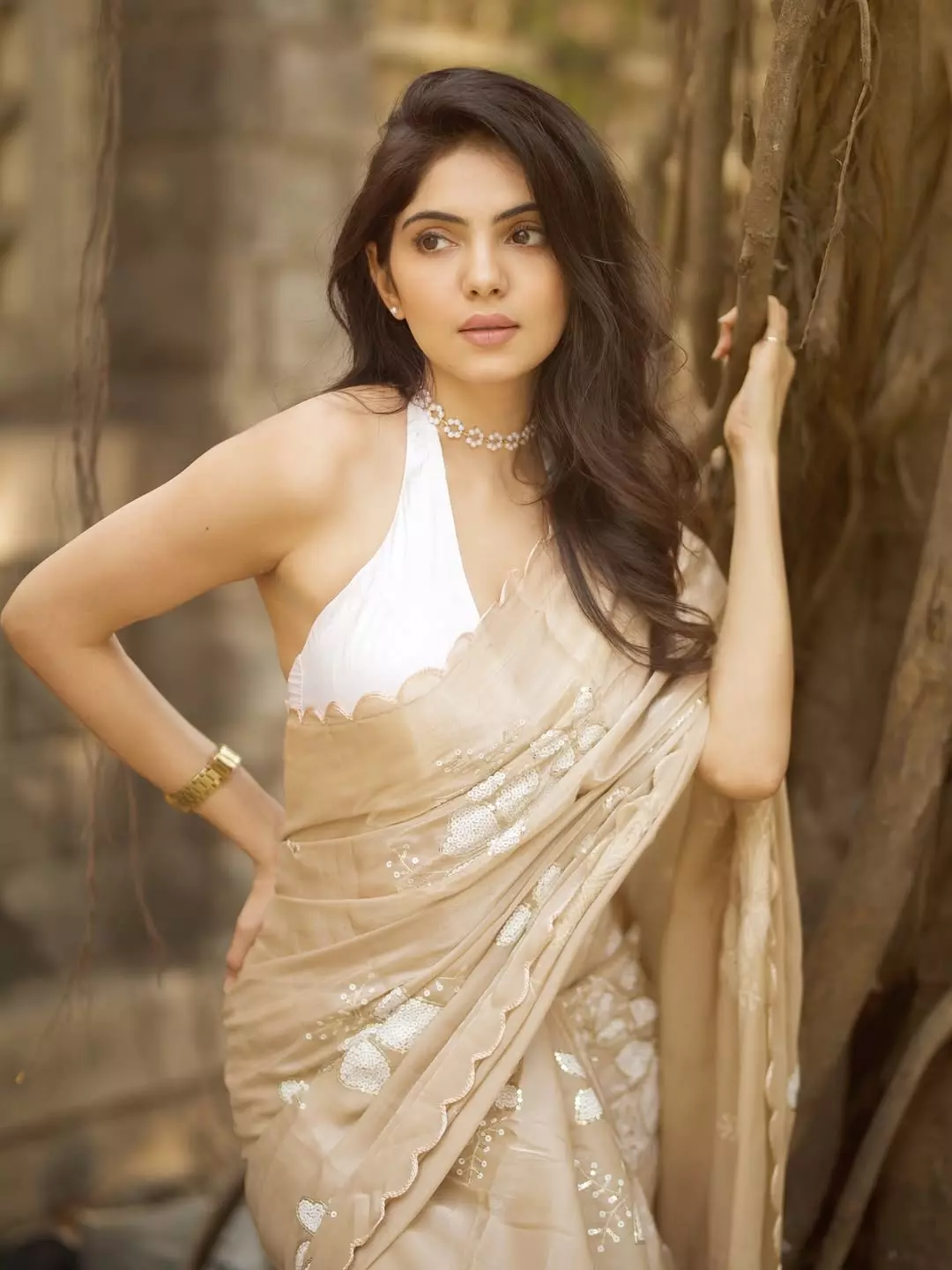 In this stunning new gallery, Misha Narang radiates effortless elegance and modern charm. Draped in a soft beige saree with delicate shimmer detailing, she perfectly balances grace and contemporary style. The halter-neck blouse adds a bold yet refined touch, while her minimal accessories — a chic choker and subtle bracelet — enhance her natural beauty. ✨