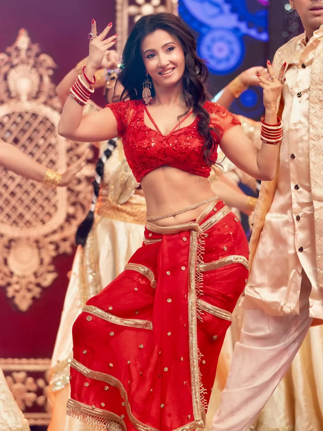 She wore a vibrant red sequined blouse paired with a matching skirt-like bottom, adorned with intricate gold detailing