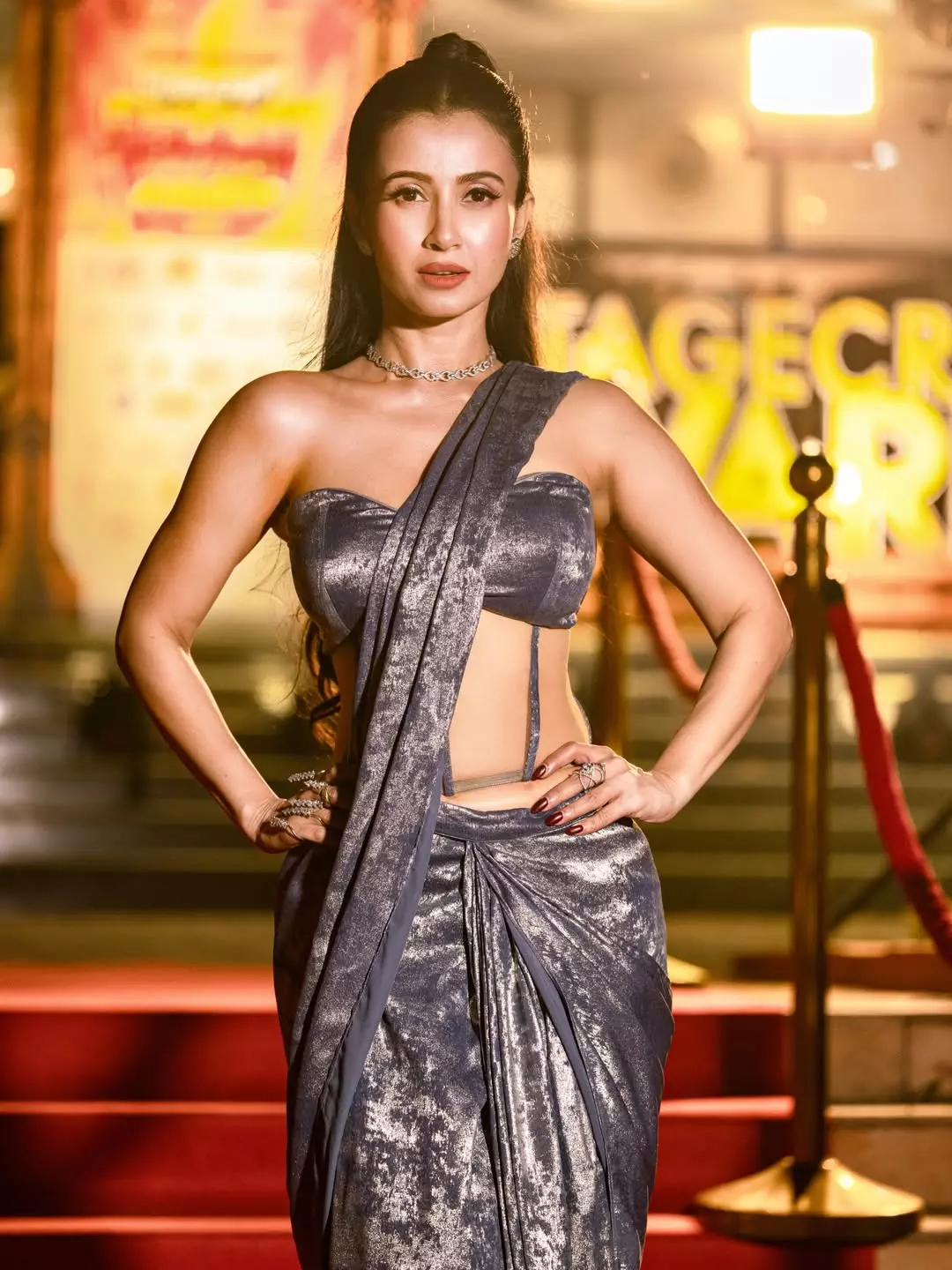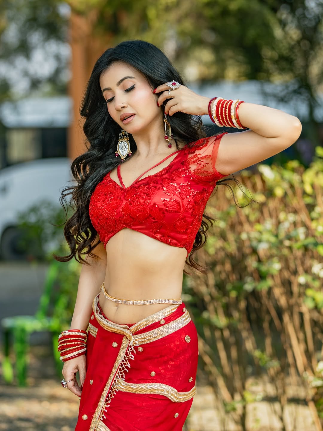 Monami Ghosh recently turned heads with a breathtaking traditional ensemble, perfectly capturing the festive spirit of Falgun. She wore a vibrant red sequined blouse paired with a matching skirt-like bottom, adorned with intricate gold detailing — a look that seamlessly blended elegance with celebratory charm.